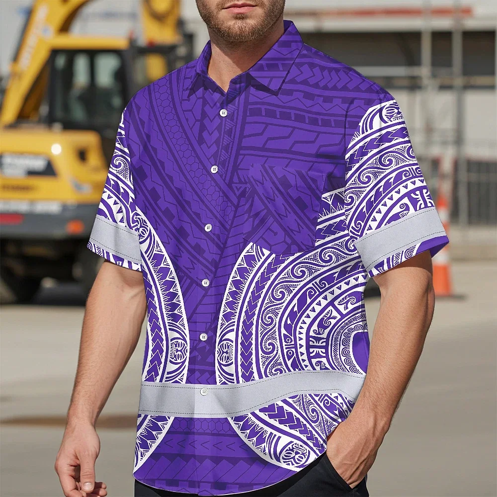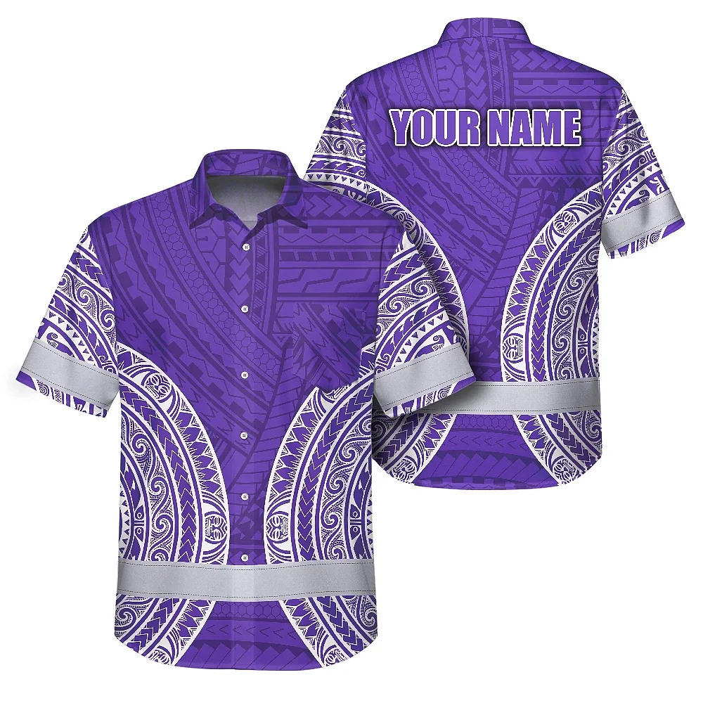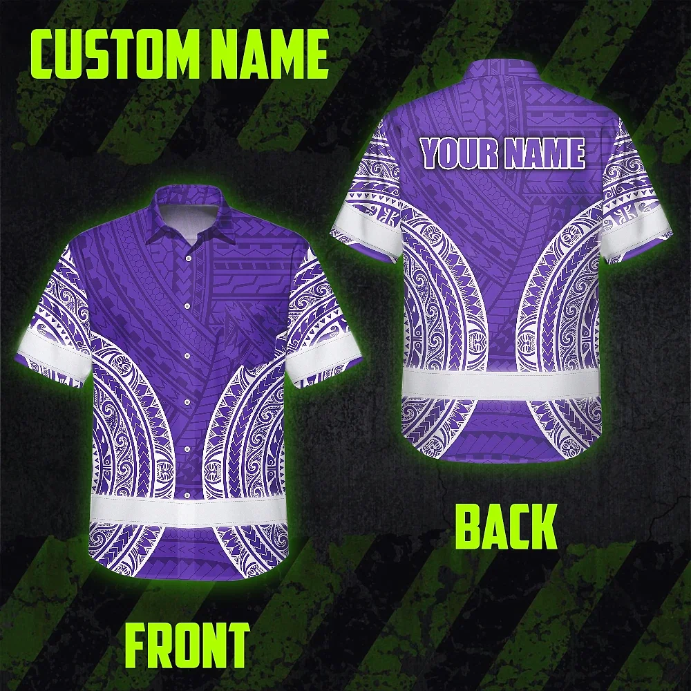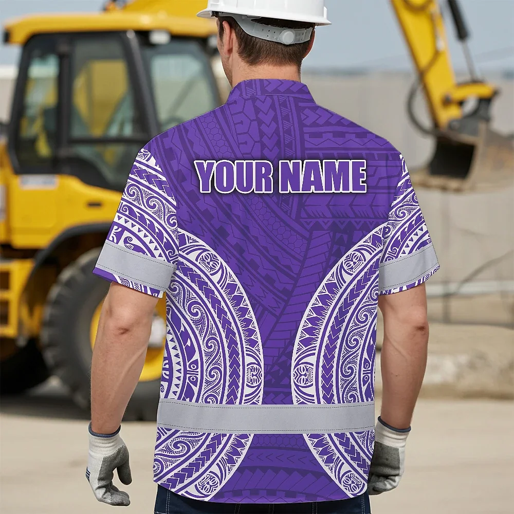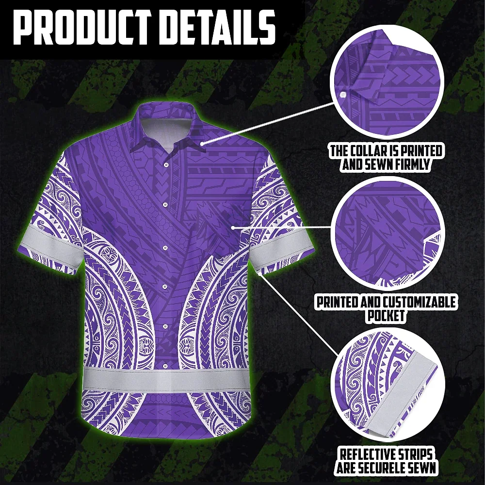 Hi Vis Hawaiian Shirt Reflective Tapes Violet White Polynesian Custom Name Safety Workwear For Workers, Truckers, Operators