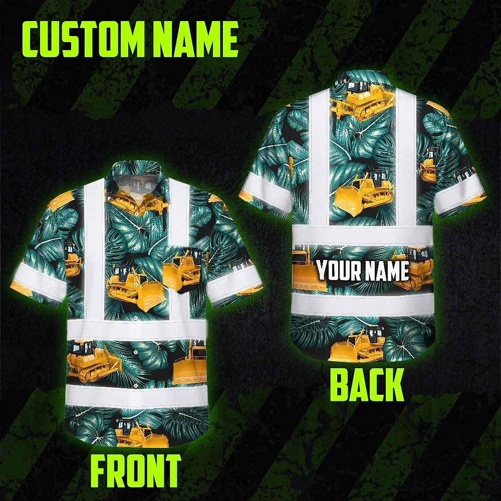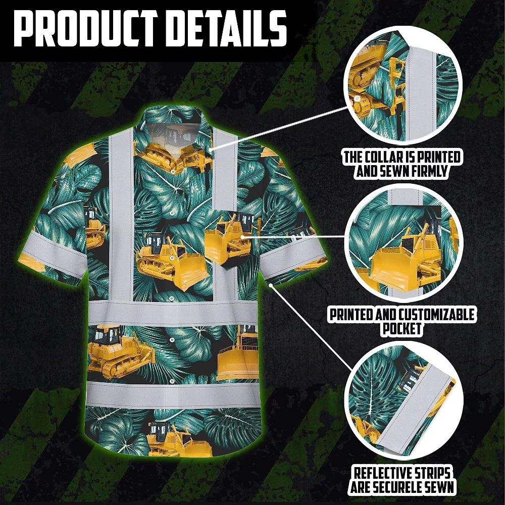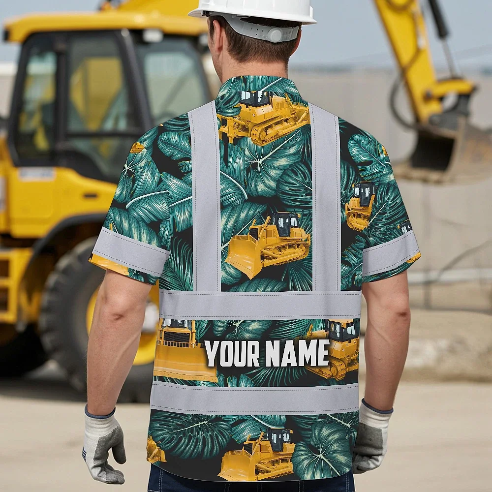 Hi Vis Hawaiian Shirt Reflective Tapes Yellow Bulldozer Custom Name Safety Workwear For Workers, Truckers, Operators