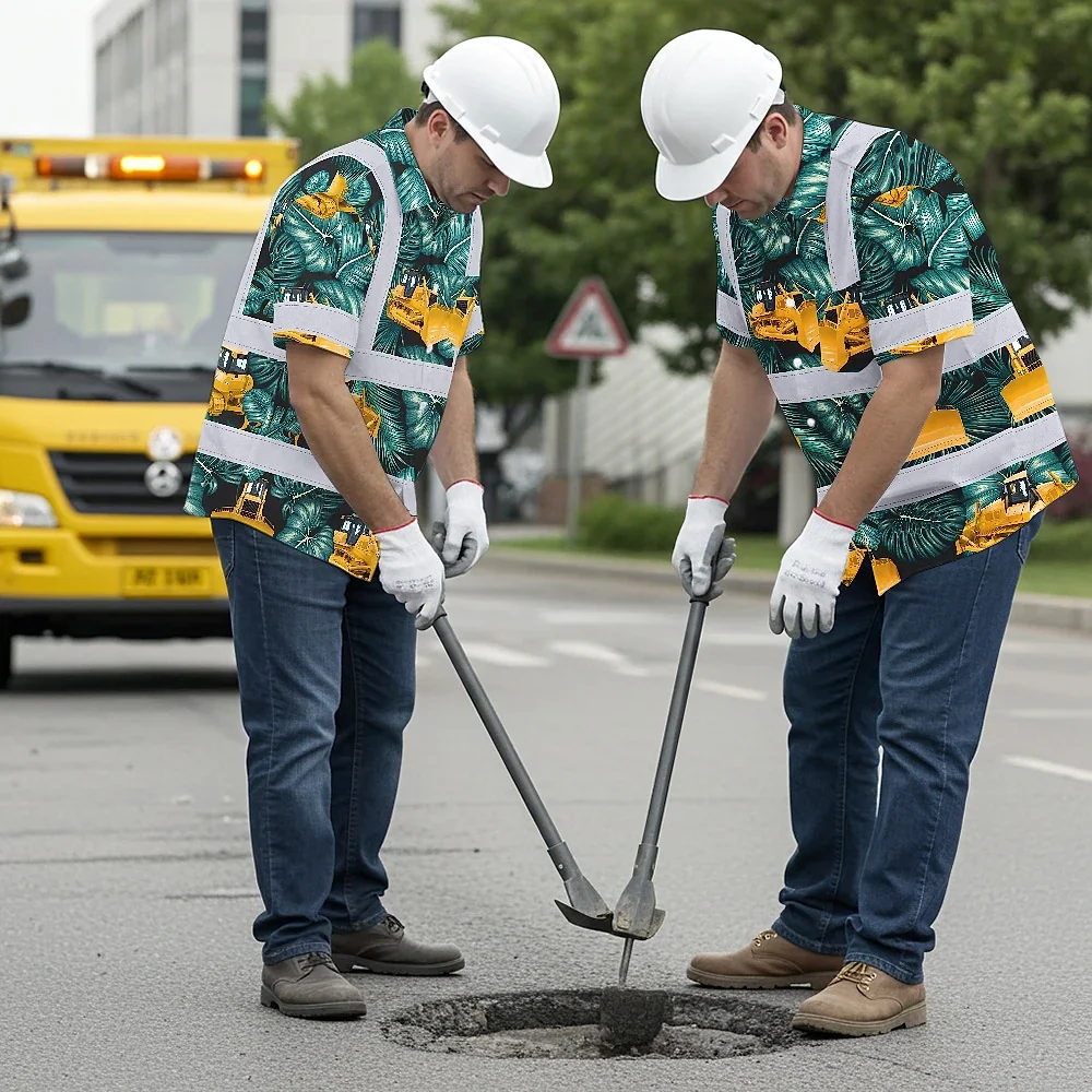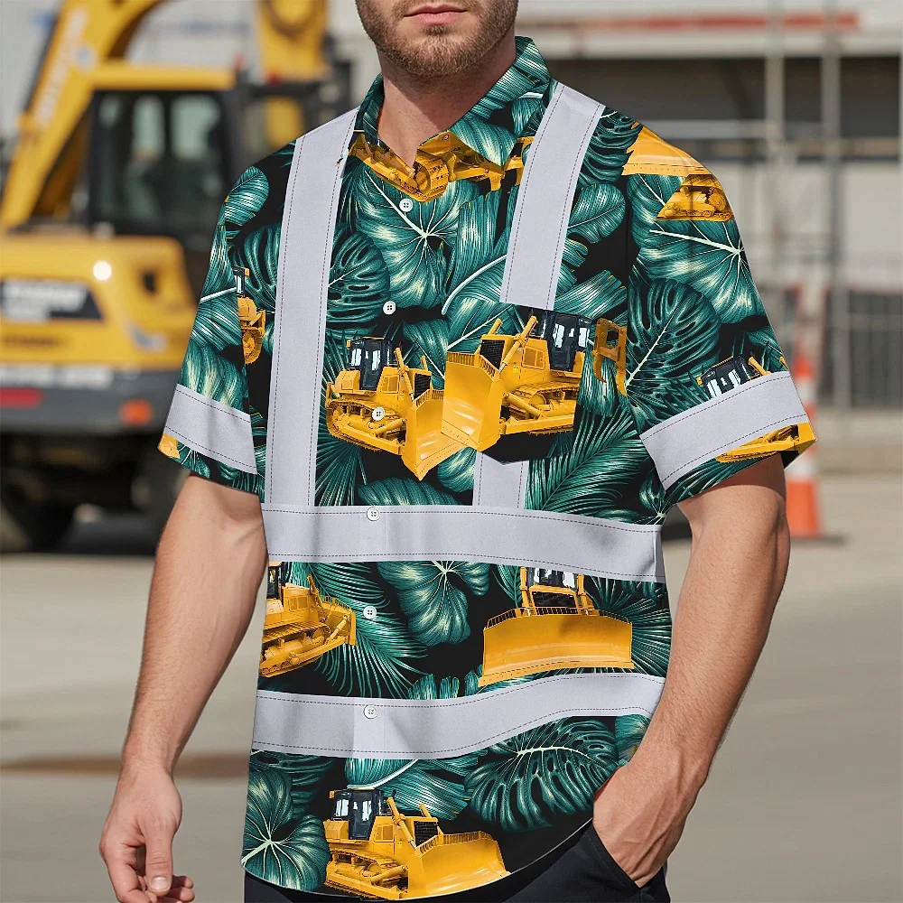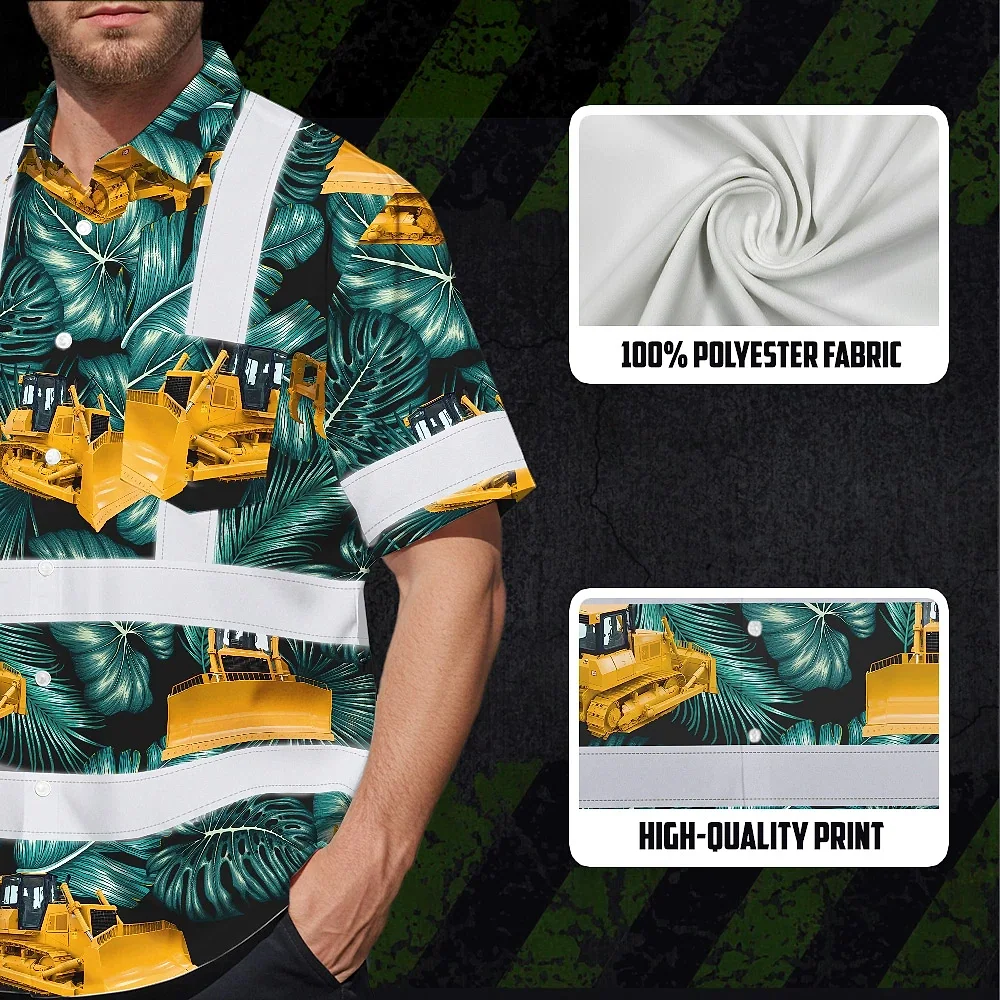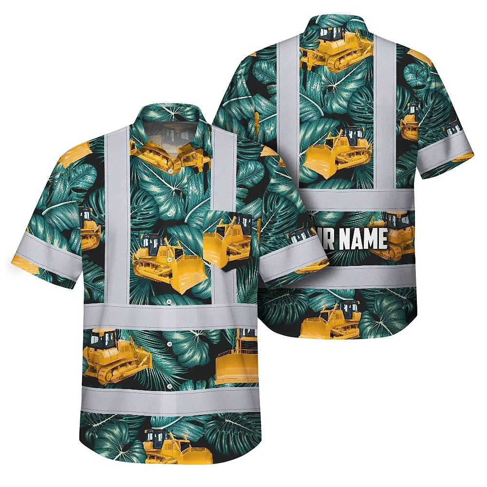 Hi Vis Hawaiian Shirt Reflective Tapes Yellow Bulldozer Custom Name Safety Workwear For Workers, Truckers, Operators
