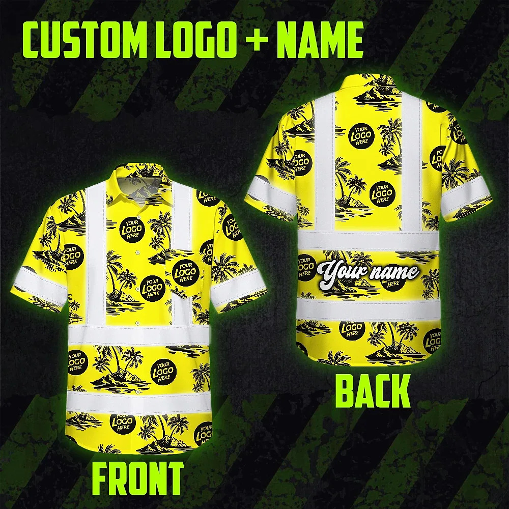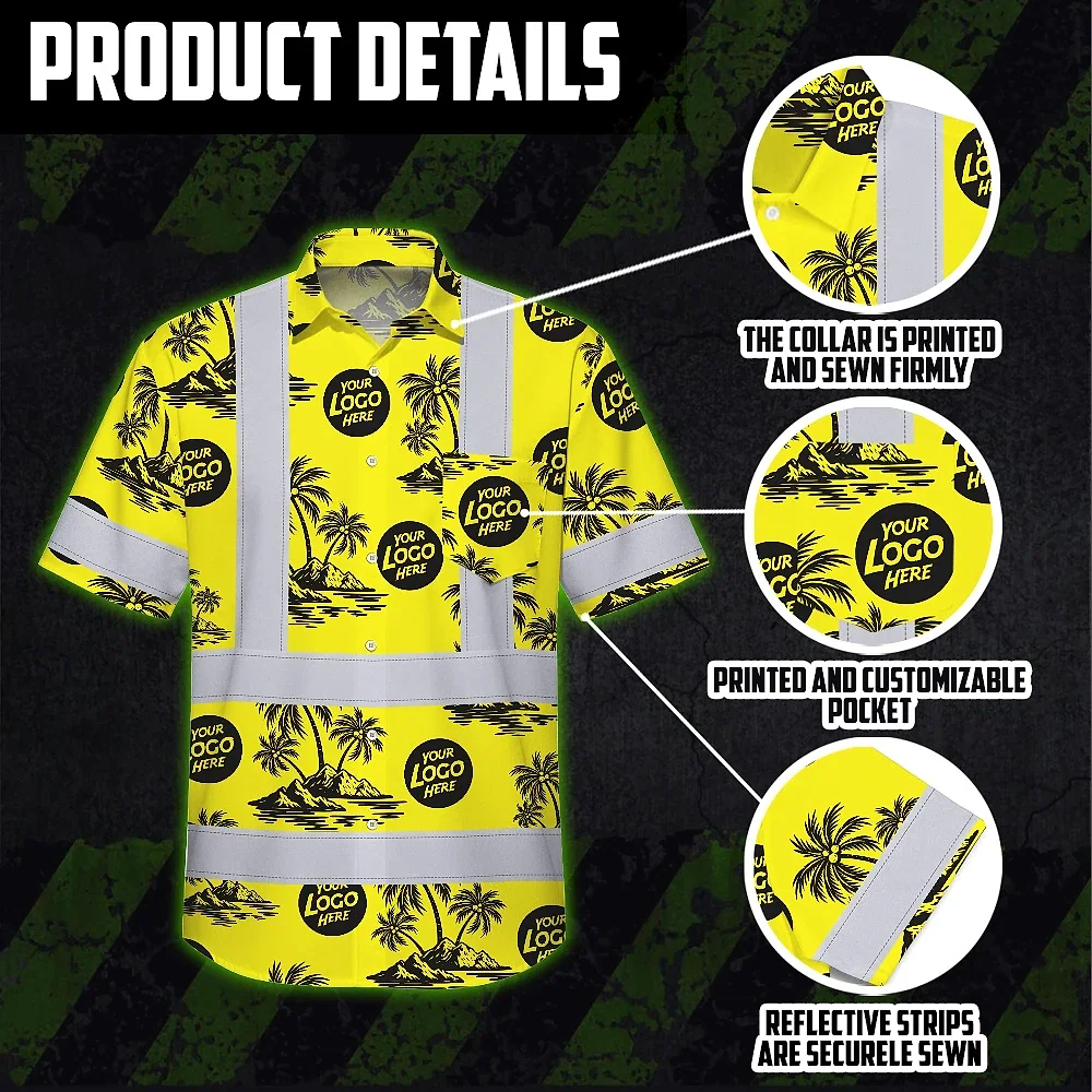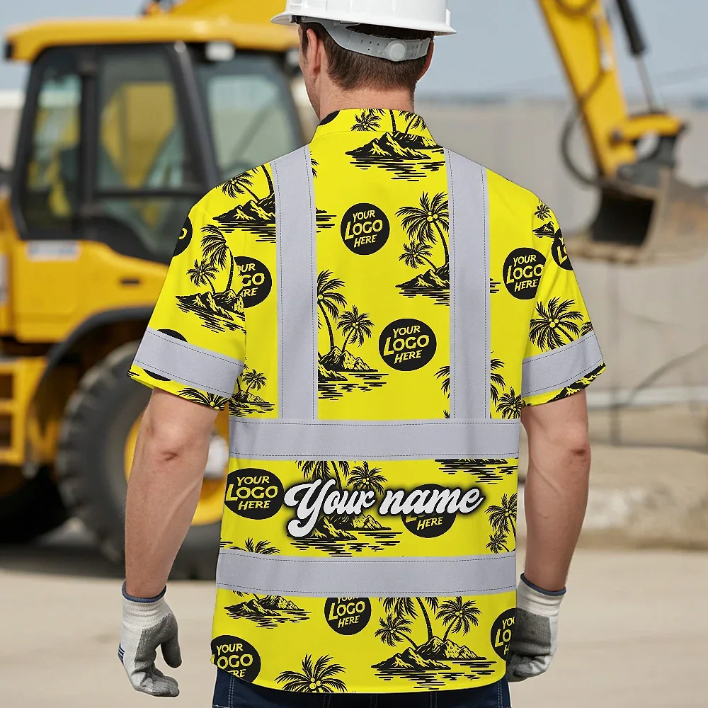 Hi Vis Hawaiian Shirt Reflective Tapes Yellow Neon And Black Flowers Custom Name And Logo Safety Workwear For Workers, Truckers, Operators, Company