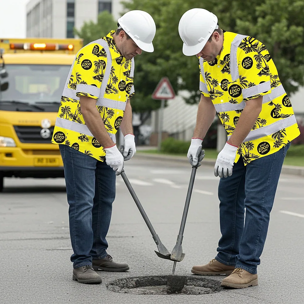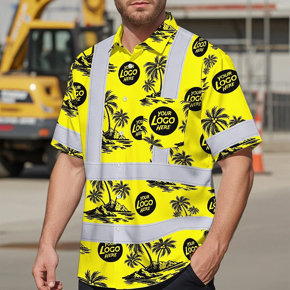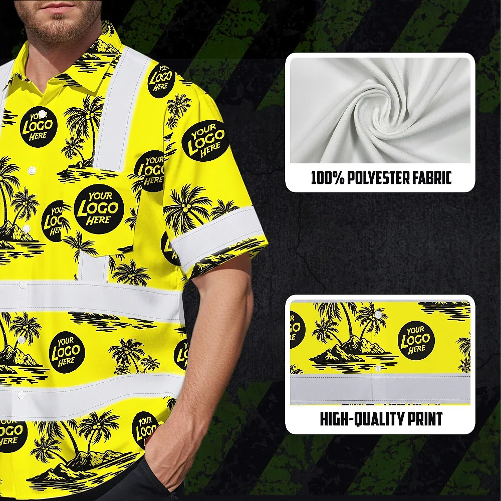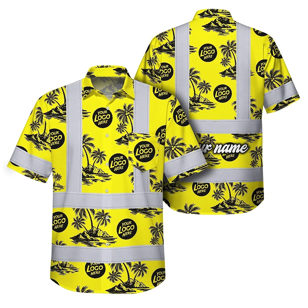 Hi Vis Hawaiian Shirt Reflective Tapes Yellow Neon And Black Flowers Custom Name And Logo Safety Workwear For Workers, Truckers, Operators, Company