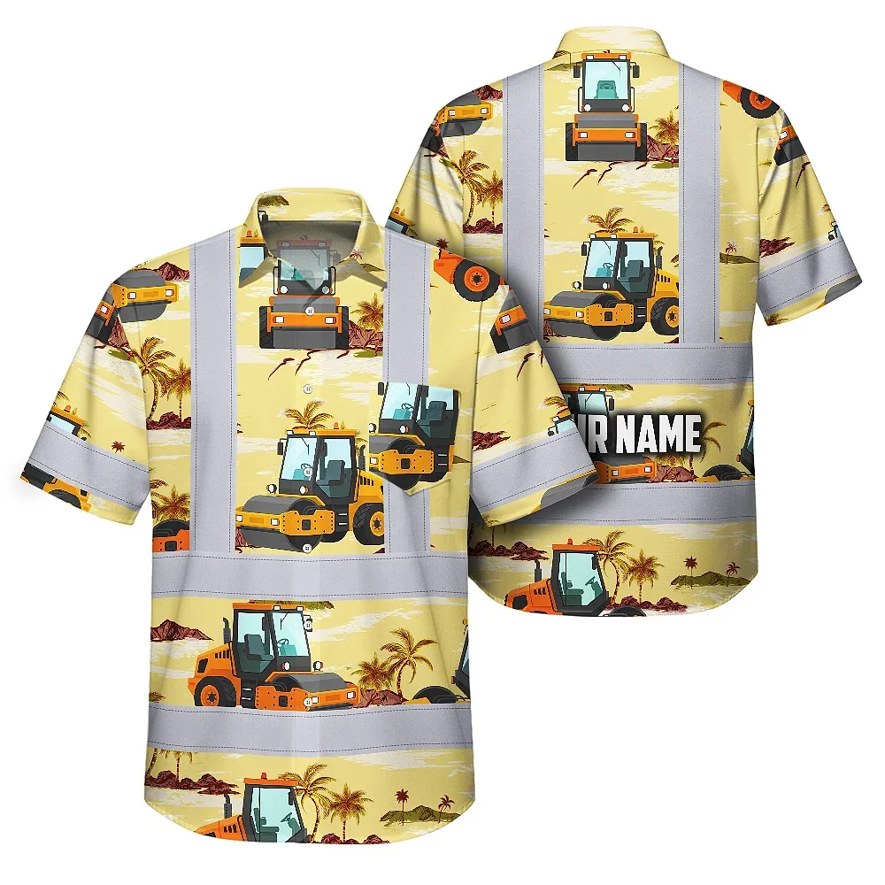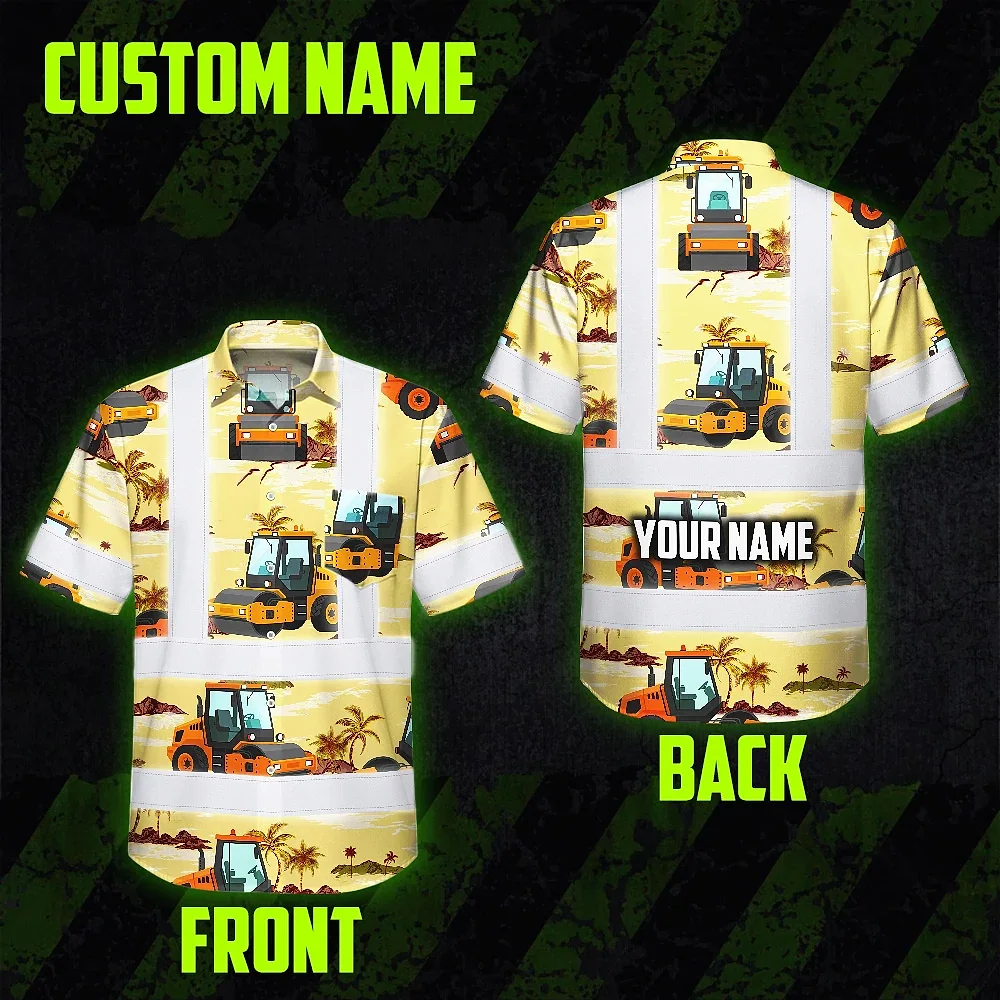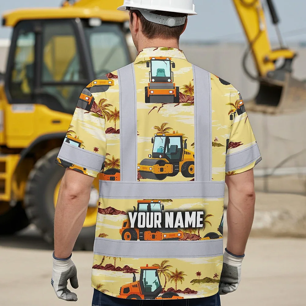 Hi Vis Hawaiian Shirt Reflective Tapes Yellow Road Roller Custom Name Safety Workwear For Workers, Truckers, Operators