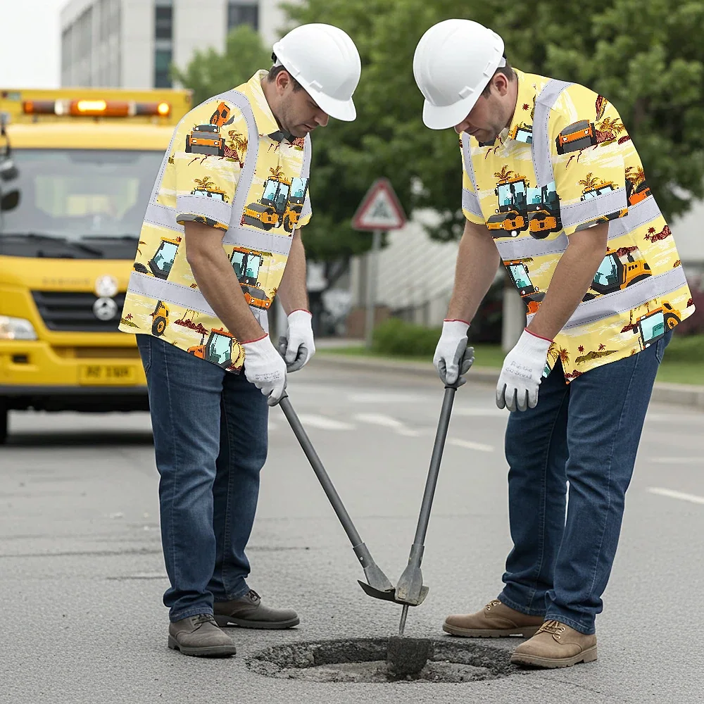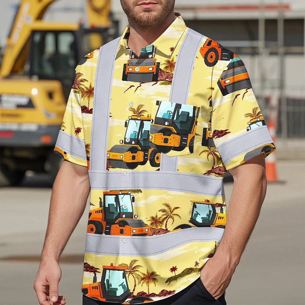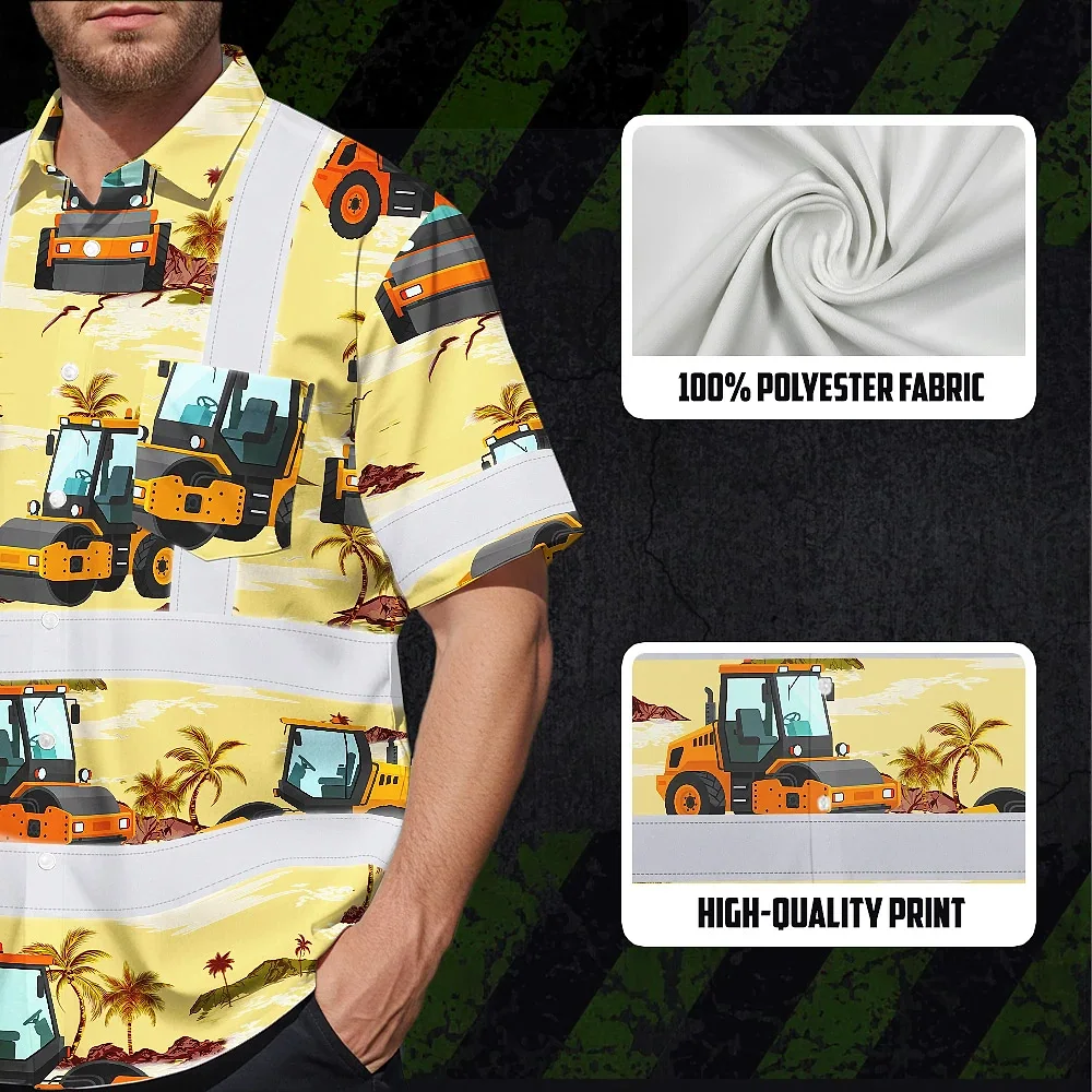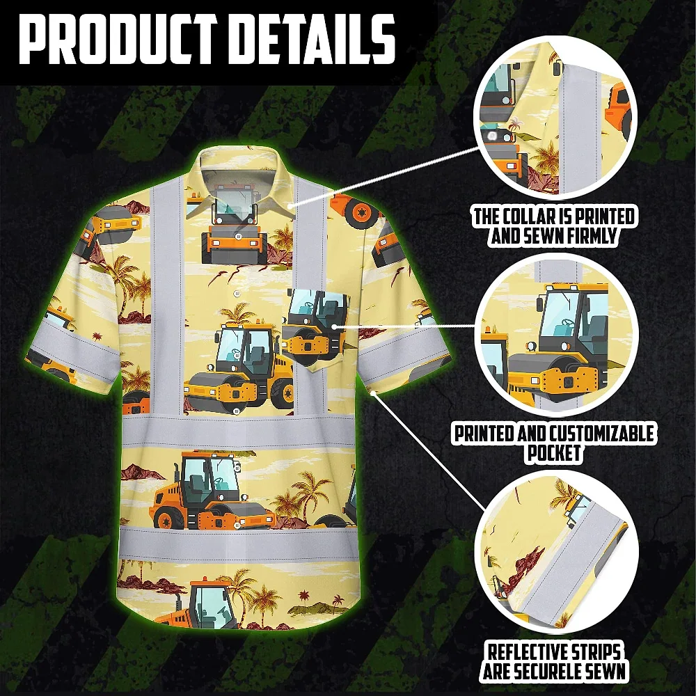 Hi Vis Hawaiian Shirt Reflective Tapes Yellow Road Roller Custom Name Safety Workwear For Workers, Truckers, Operators