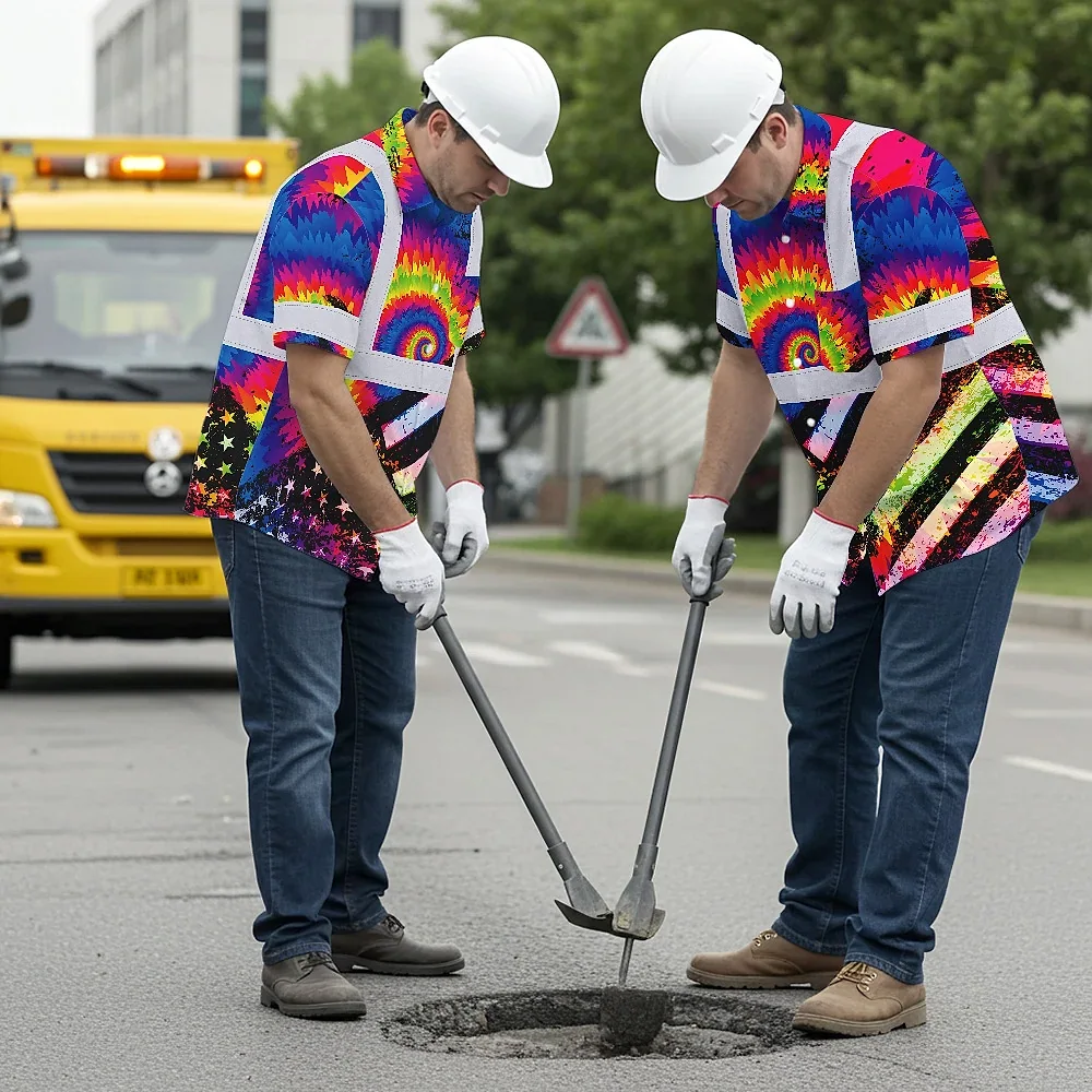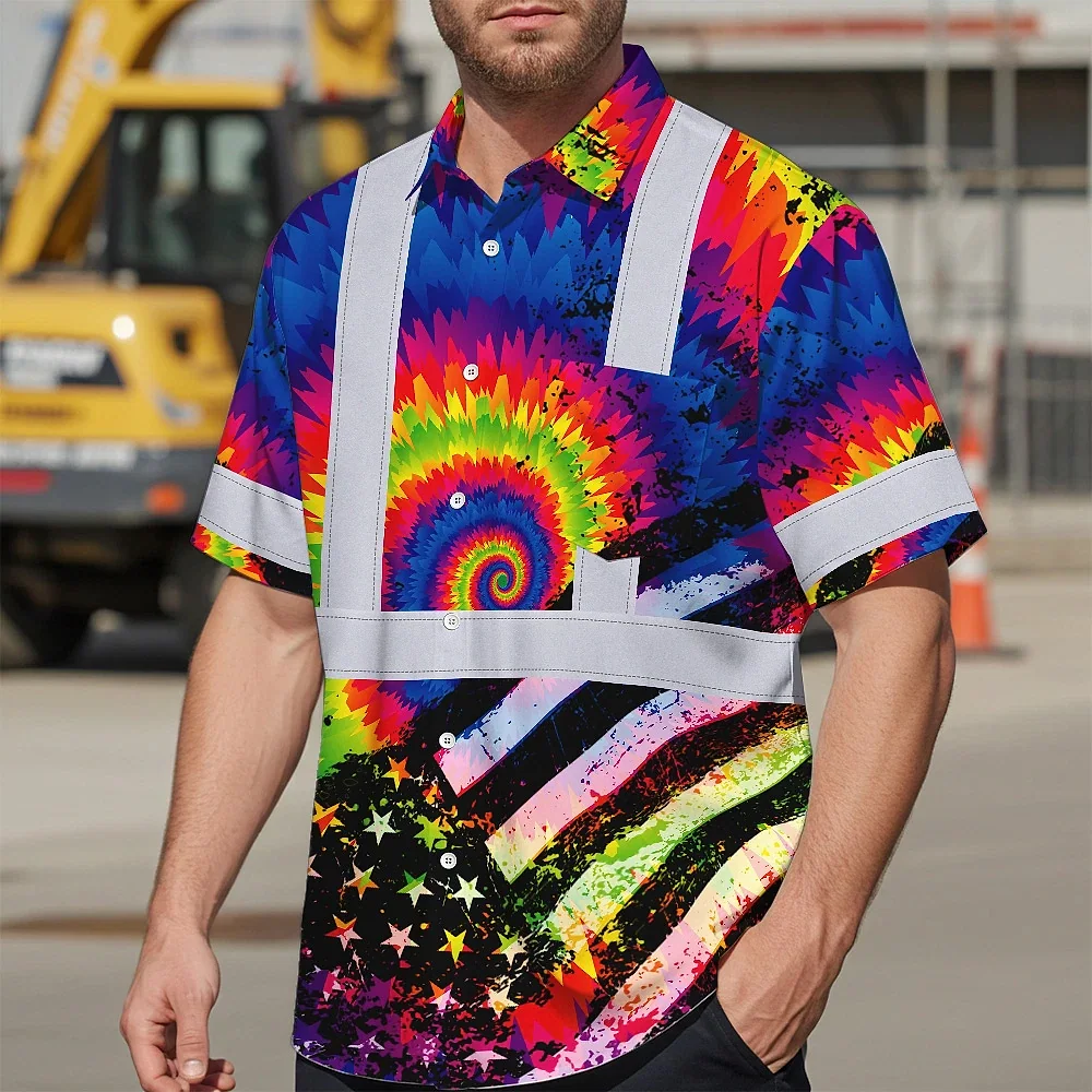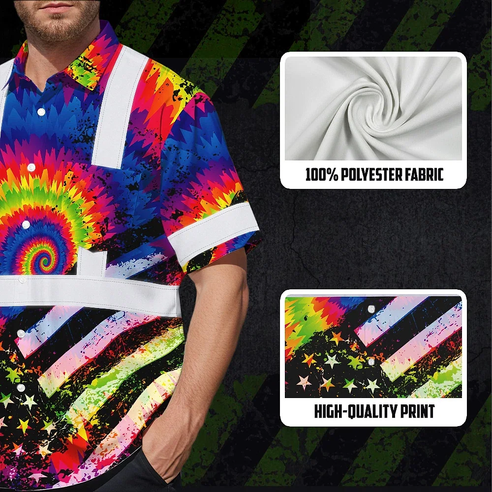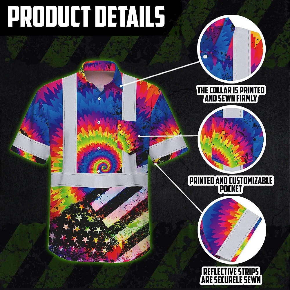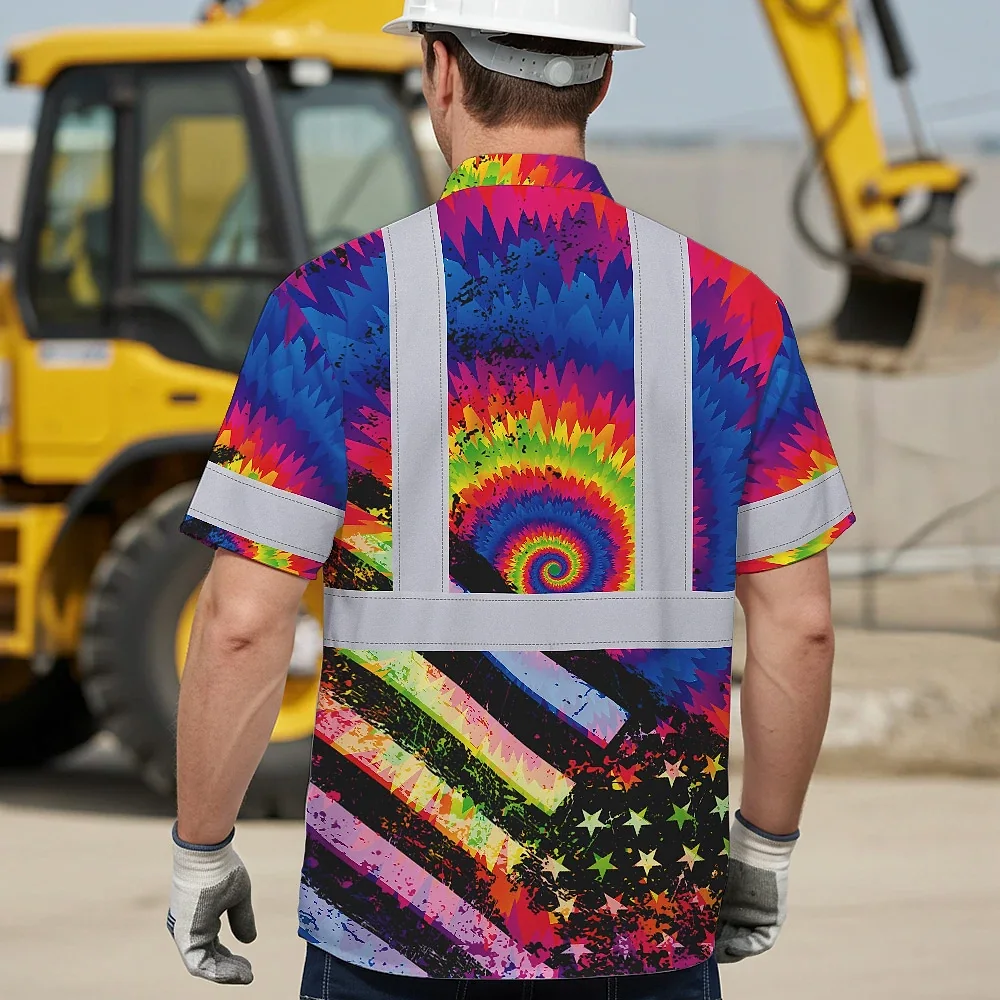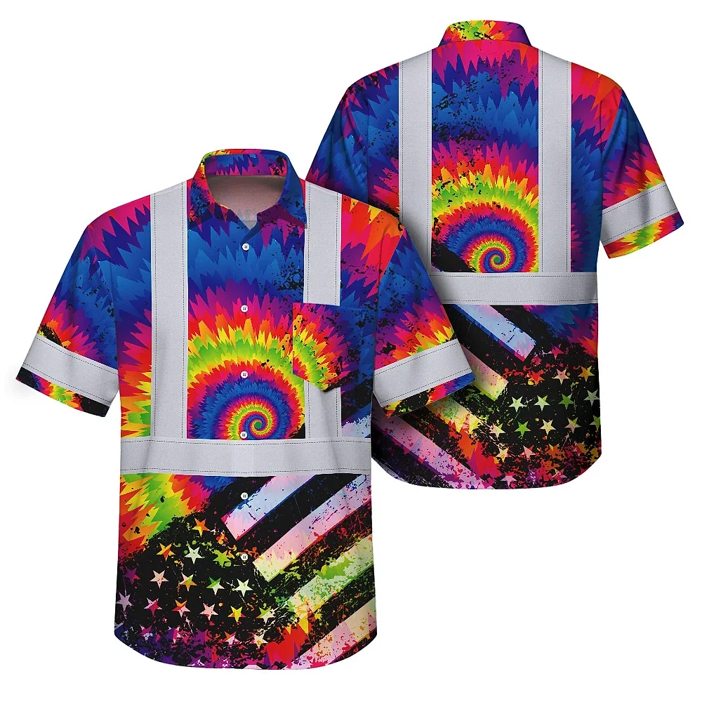 Hi Vis Hawaiian Shirt Reflective Tie Dye US Flag Paint Safety Workwear For Worker, Motorcycle Bicycle, Runner