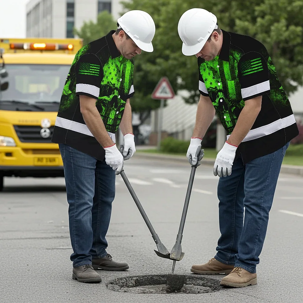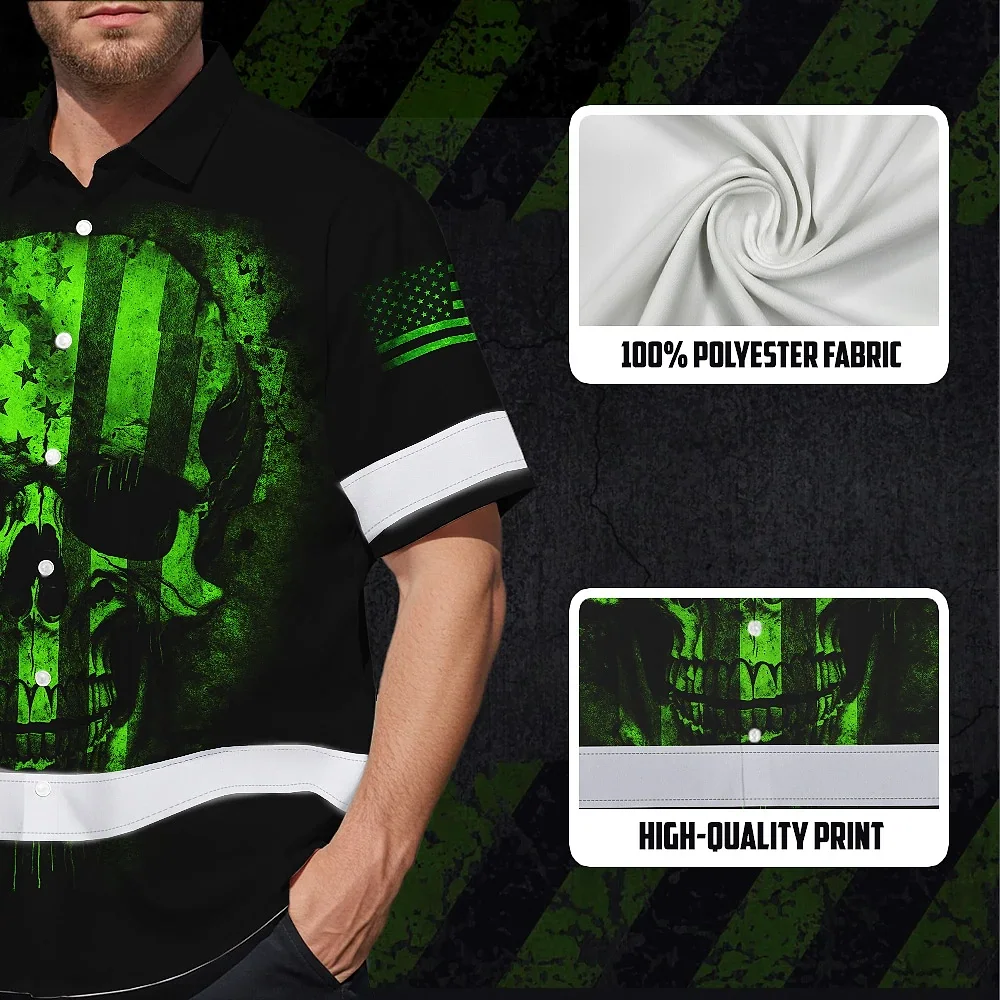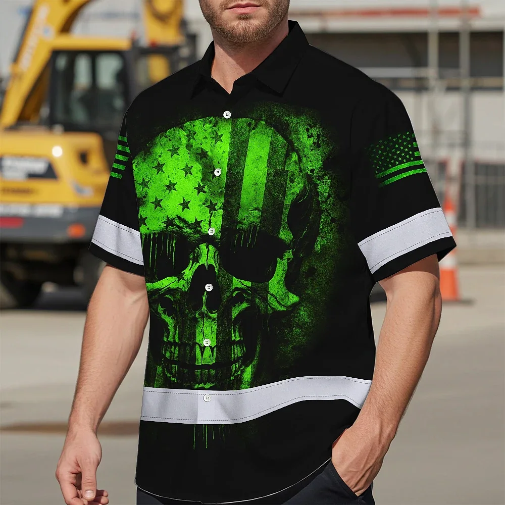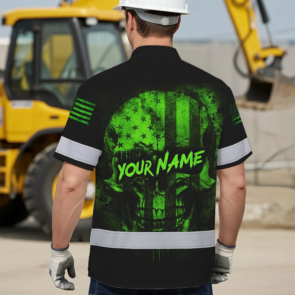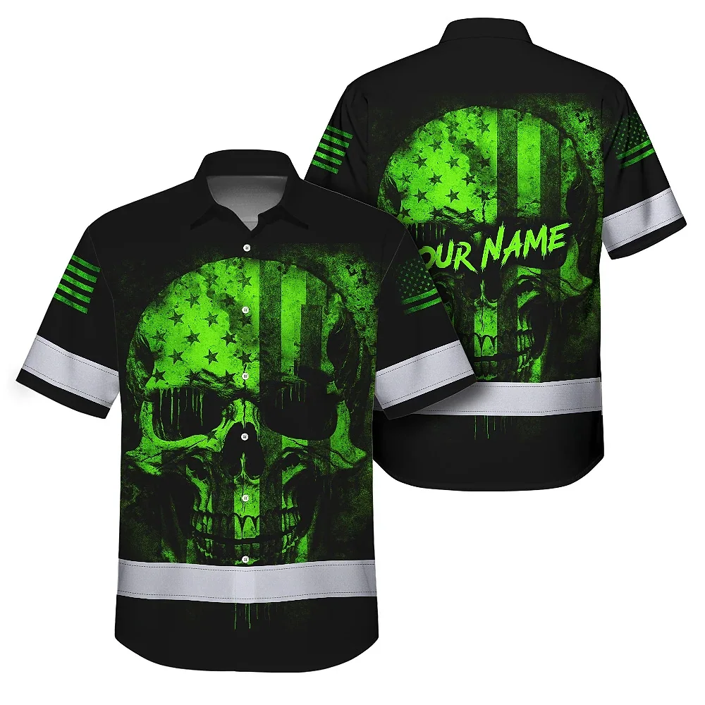 Hi Vis Hawaiian Skull Shirt, Green Neon Custom Name High Visibility Short Sleeve Button Down Shirt for Workers, Truckers