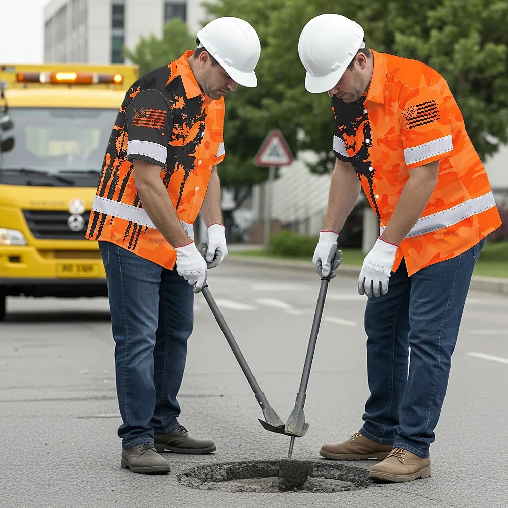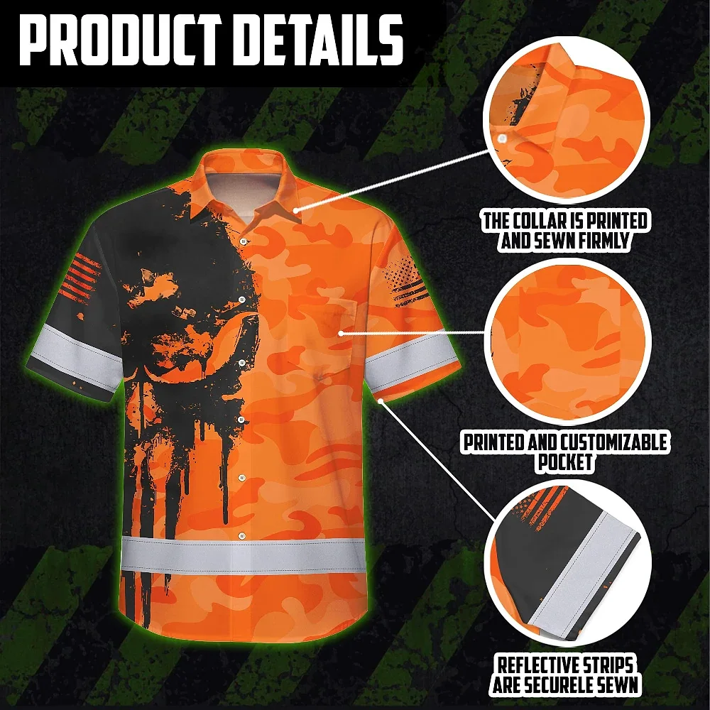 Be the first to review “Hi Vis Hawaiian Skull Shirt, Orange Neon Custom Name High Visibility Short Sleeve Button Down Shirt for Workers, Truckers”