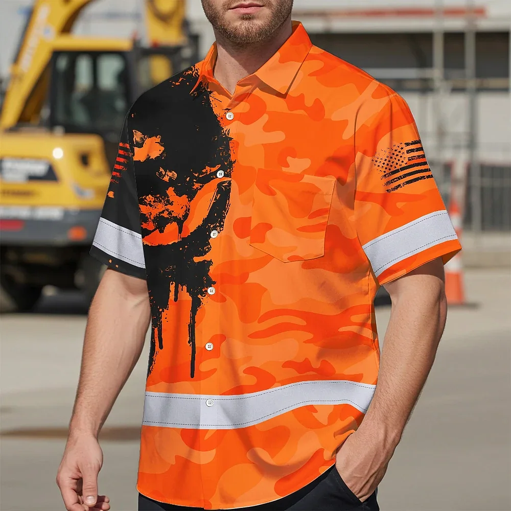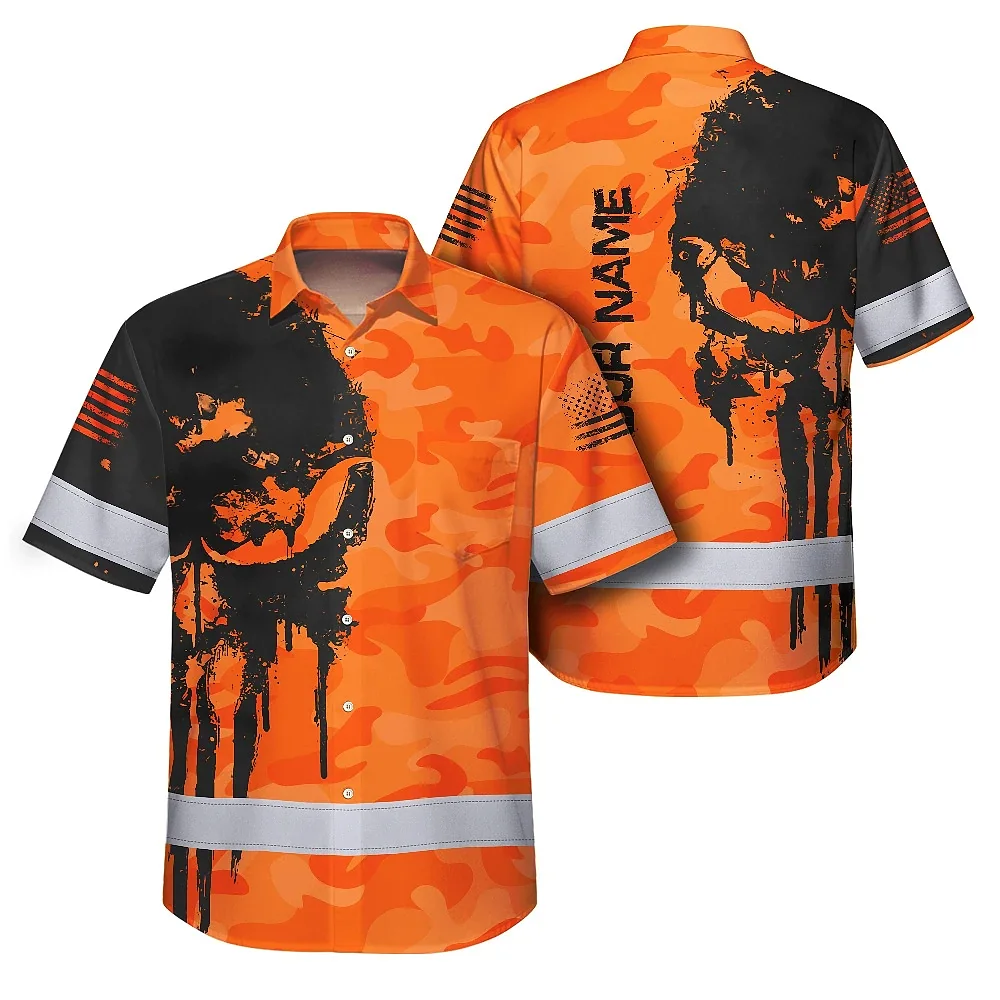 Hi Vis Hawaiian Skull Shirt, Orange Neon Custom Name High Visibility Short Sleeve Button Down Shirt for Workers, Truckers