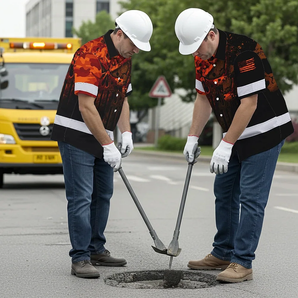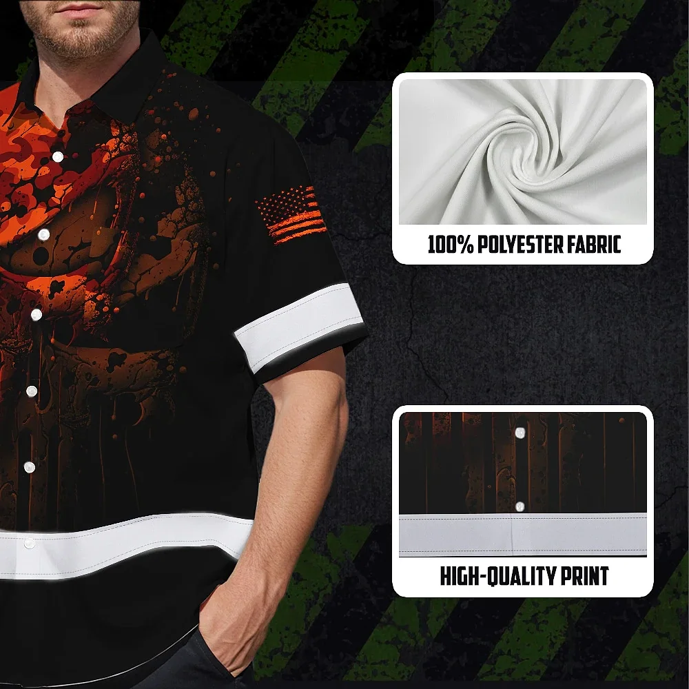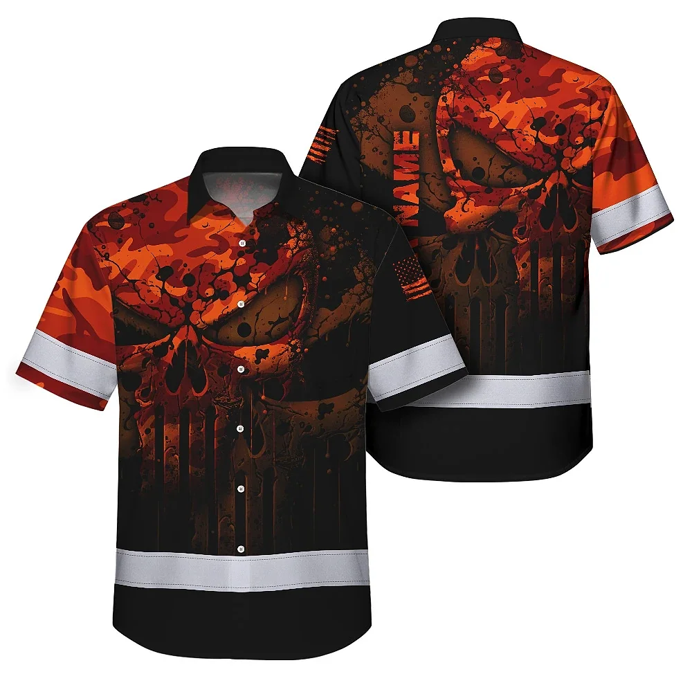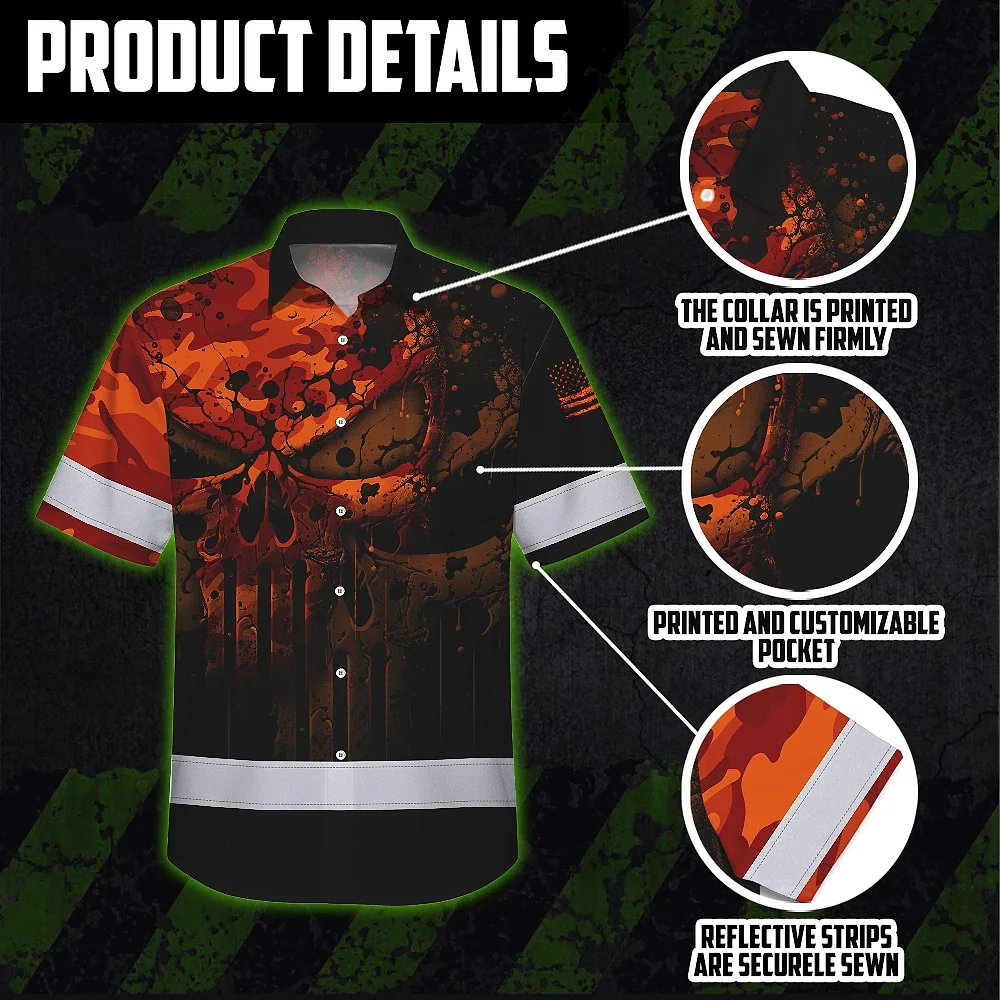 Be the first to review “Hi Vis Hawaiian Skull Shirt, Orange Neon Custom Name High Visibility Short Sleeve Button Down Shirt for Workers, Truckers”