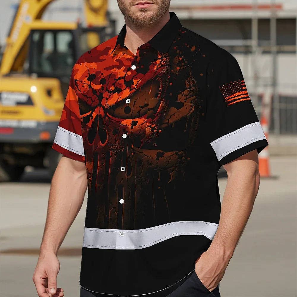 Hi Vis Hawaiian Skull Shirt, Orange Neon Custom Name High Visibility Short Sleeve Button Down Shirt for Workers, Truckers