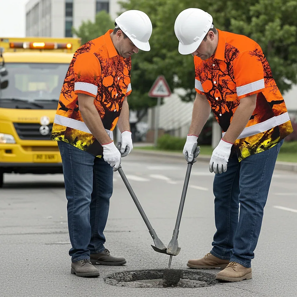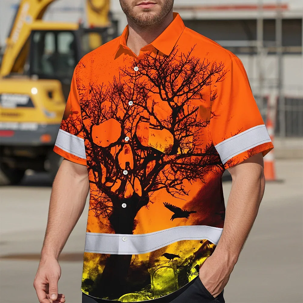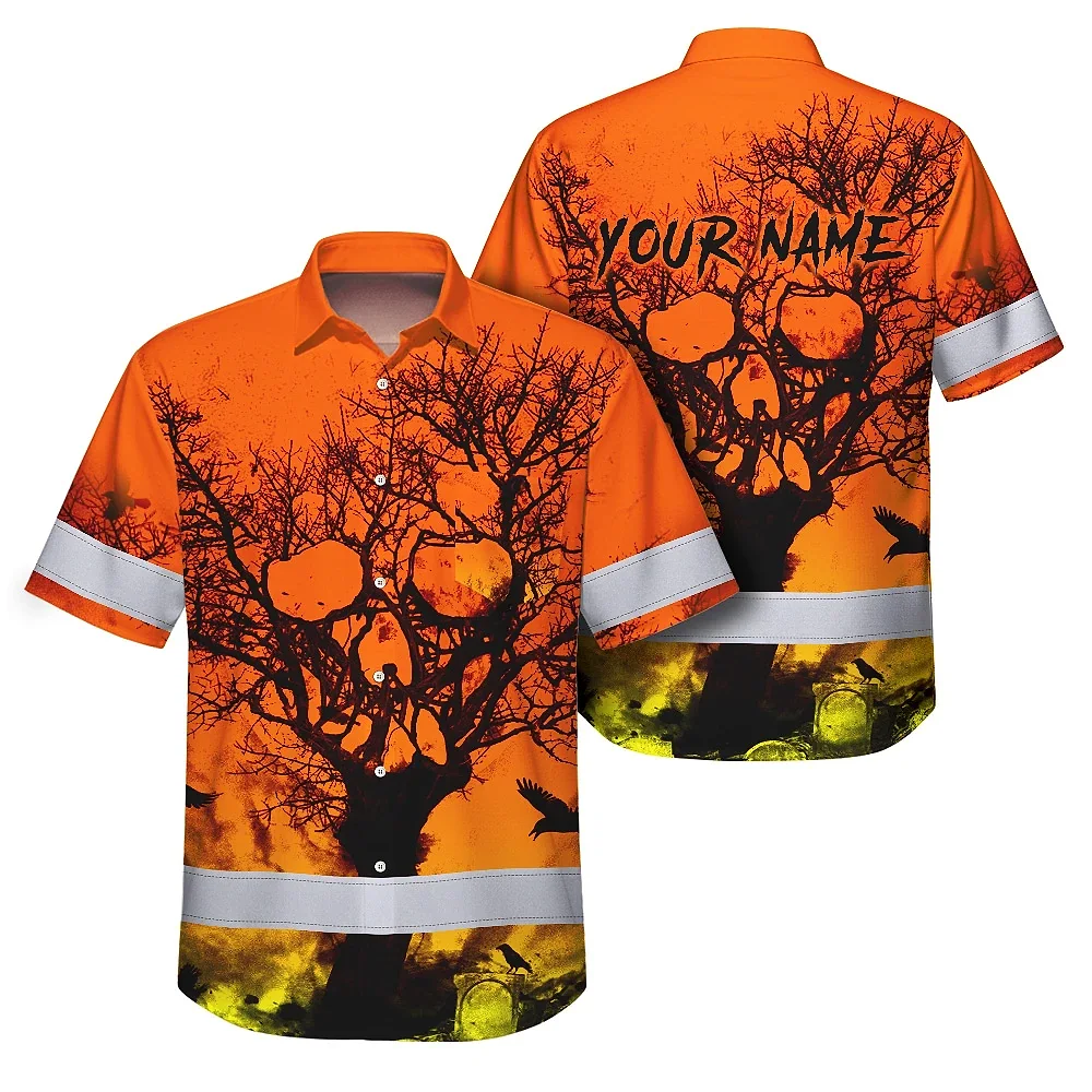 Hi Vis Hawaiian Skull Shirt, Orange Neon Custom Name High Visibility Short Sleeve Button Down Shirt for Workers, Truckers