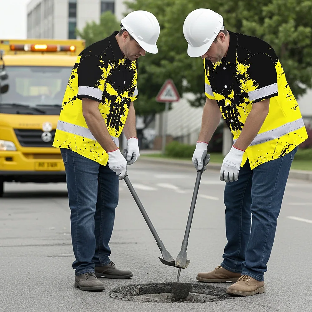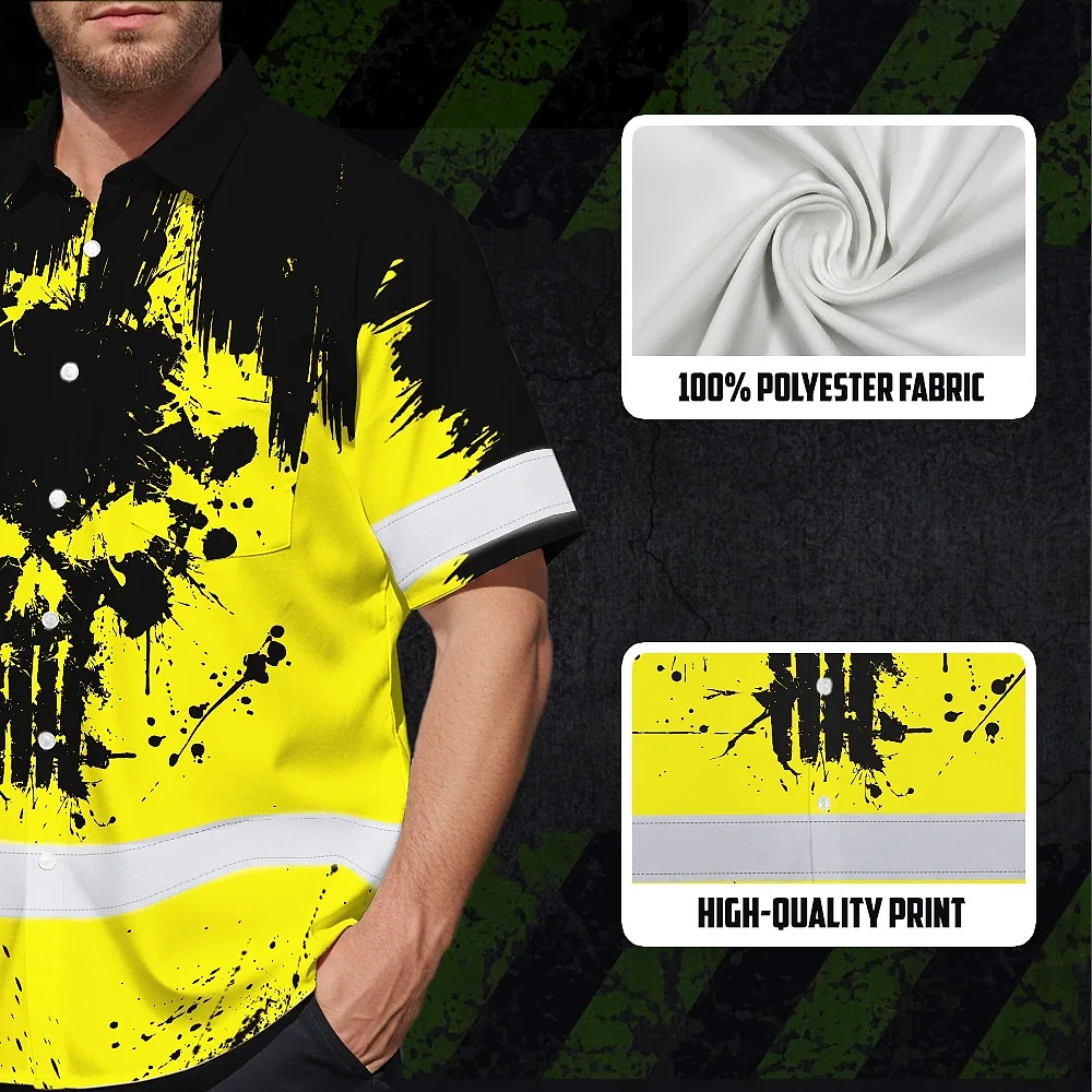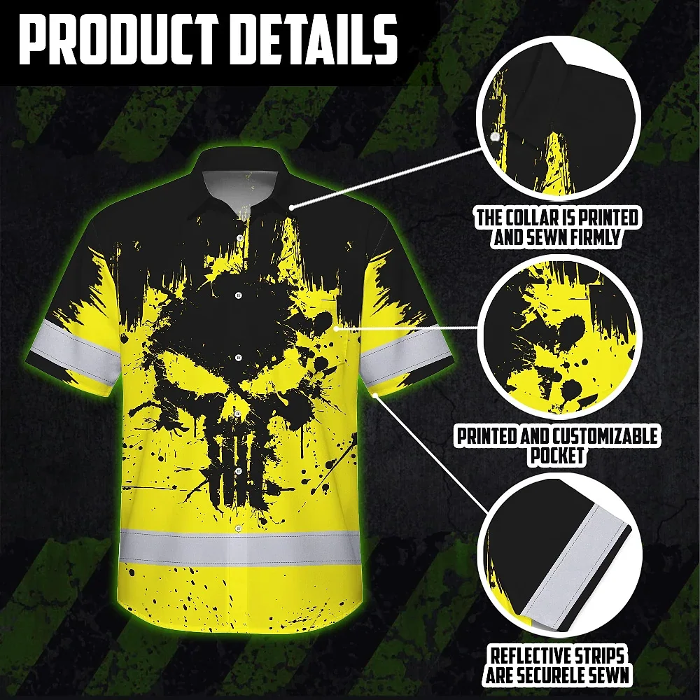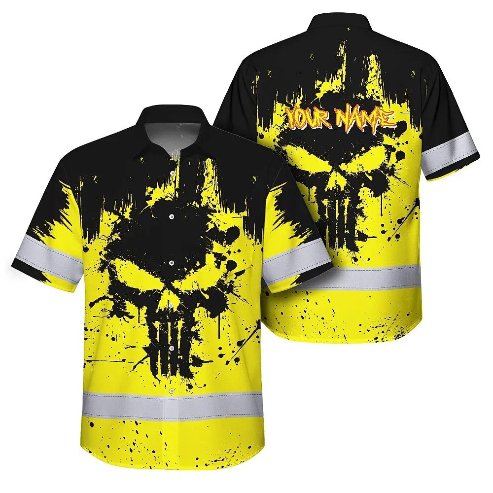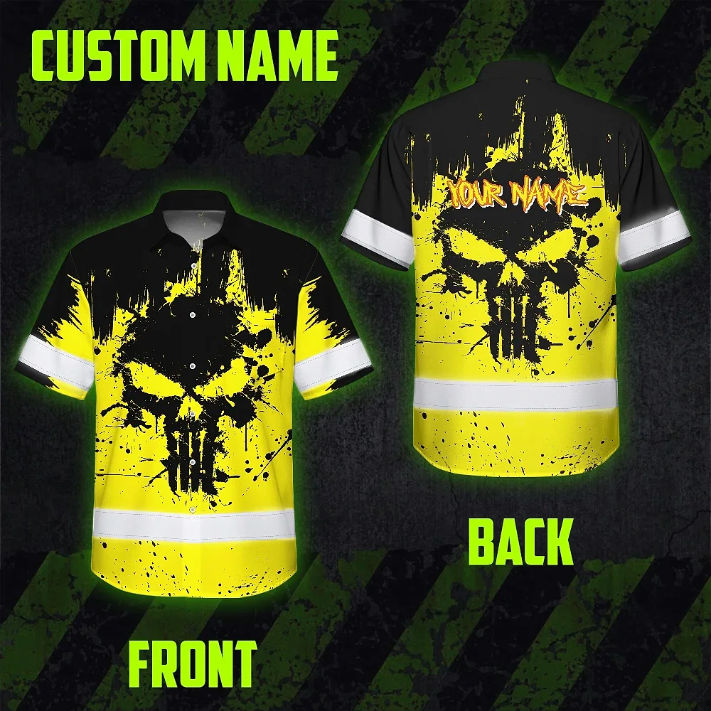 Hi Vis Hawaiian Skull Shirt, Yellow Neon Custom Name High Visibility Short Sleeve Button Down Shirt for Workers, Truckers