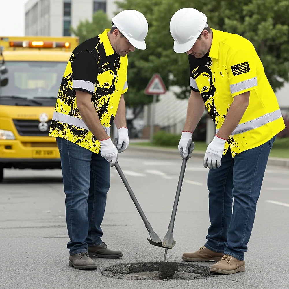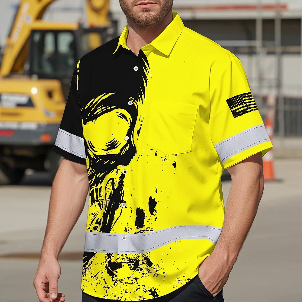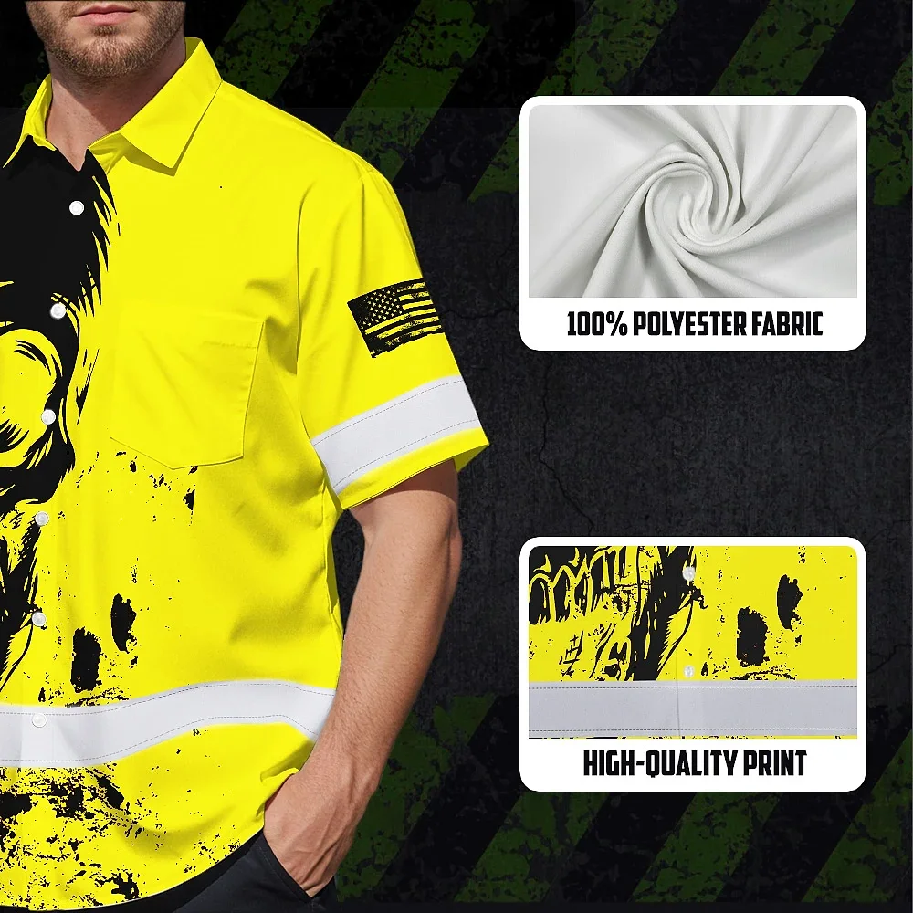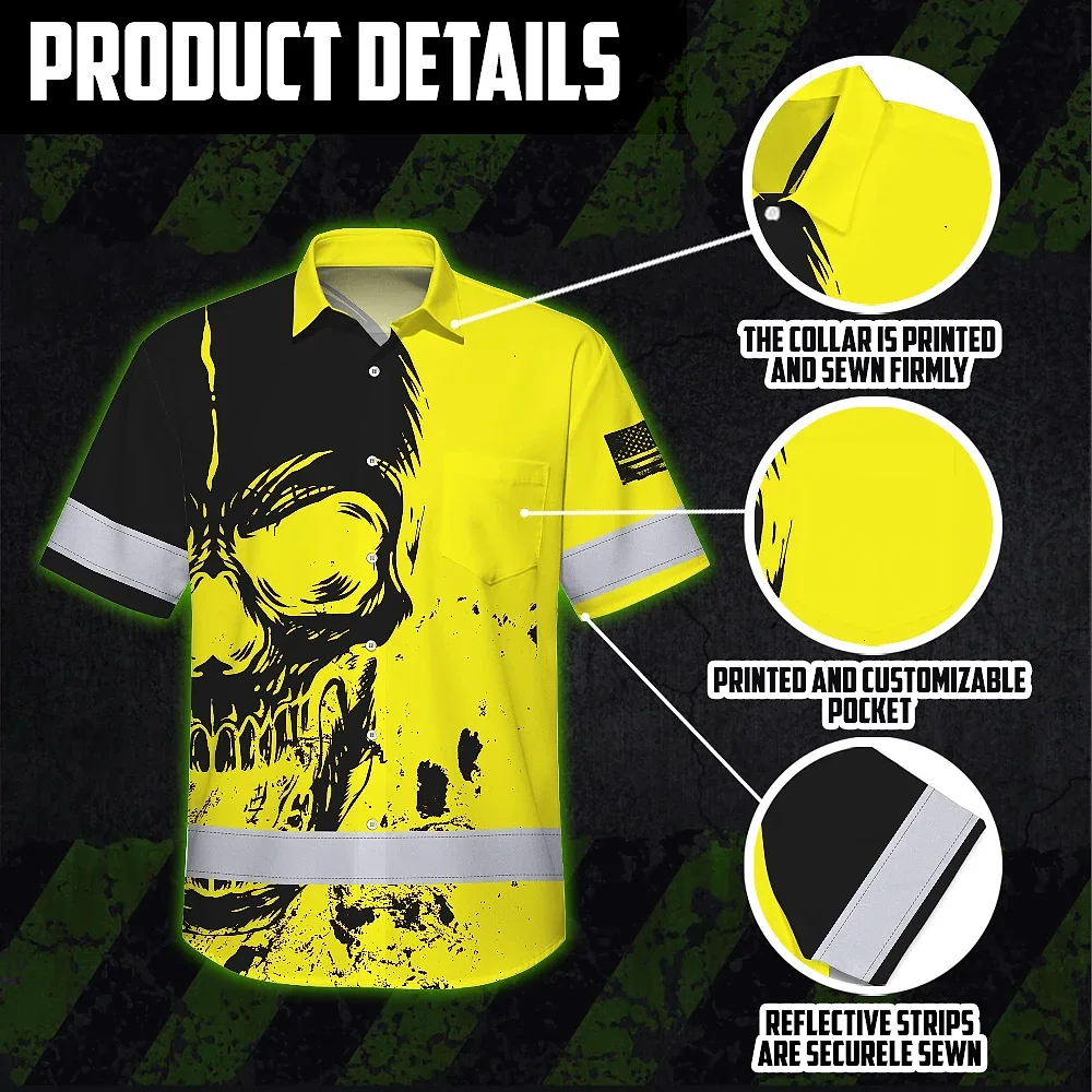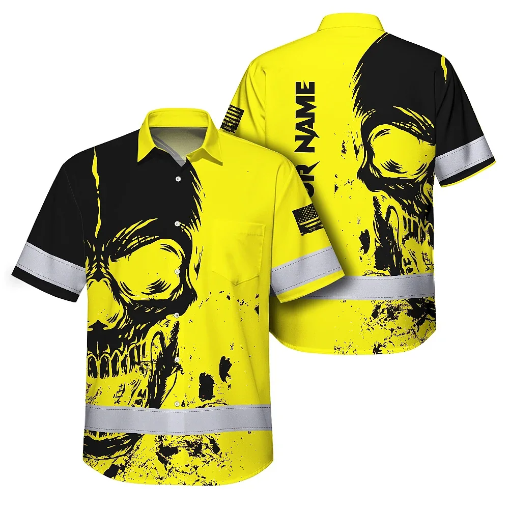 Hi Vis Hawaiian Skull Shirt, Yellow Neon Custom Name High Visibility Short Sleeve Button Down Shirt for Workers, Truckers