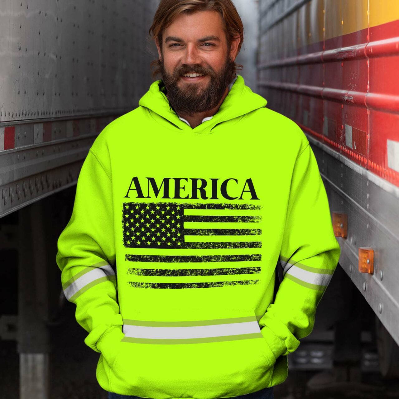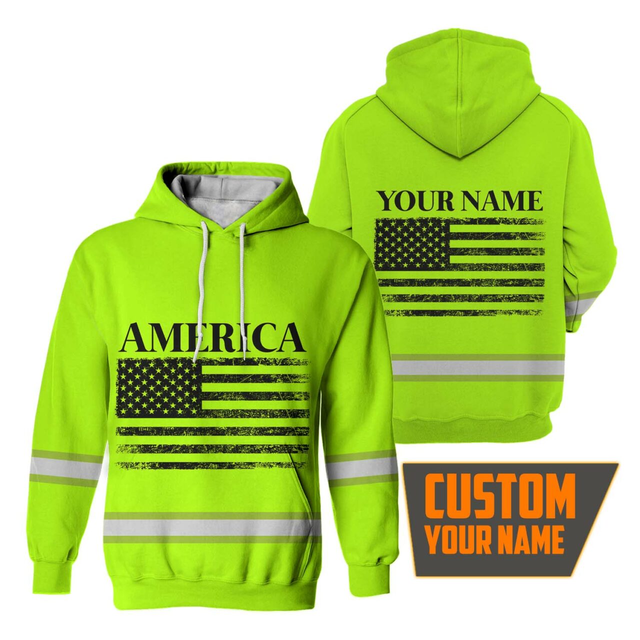 Custom name hoodies are awesome patriotic workwear! They safety green color with black US flag is perfect for any worker, operator or trucker. The fit is great and the quality is superb. I highly recommend this product to anyone looking for patriotic workwear. The hoodie is very comfortable and the custom name feature is an added bonus. The turn-around time from order to delivery was very fast and the customer service was excellent. I will definitely be ordering from this company again!