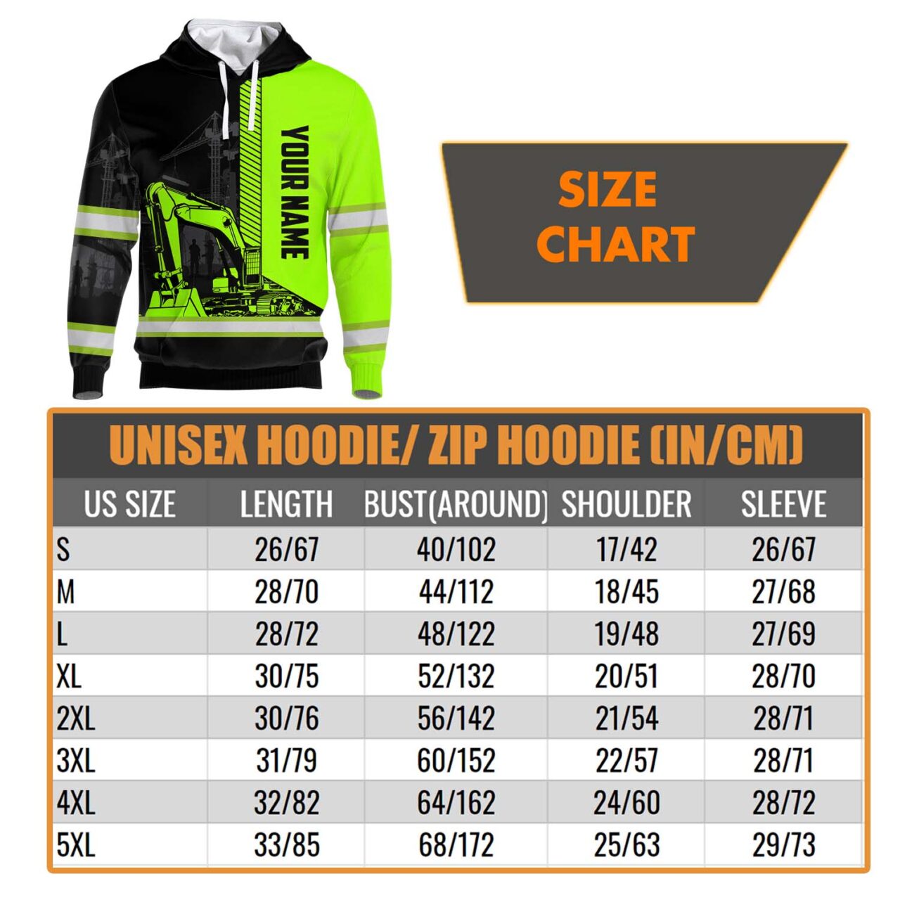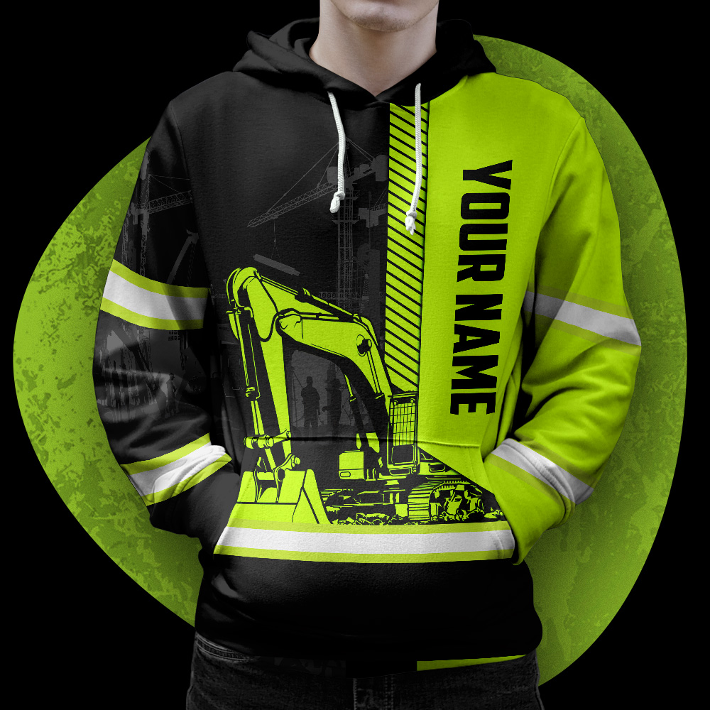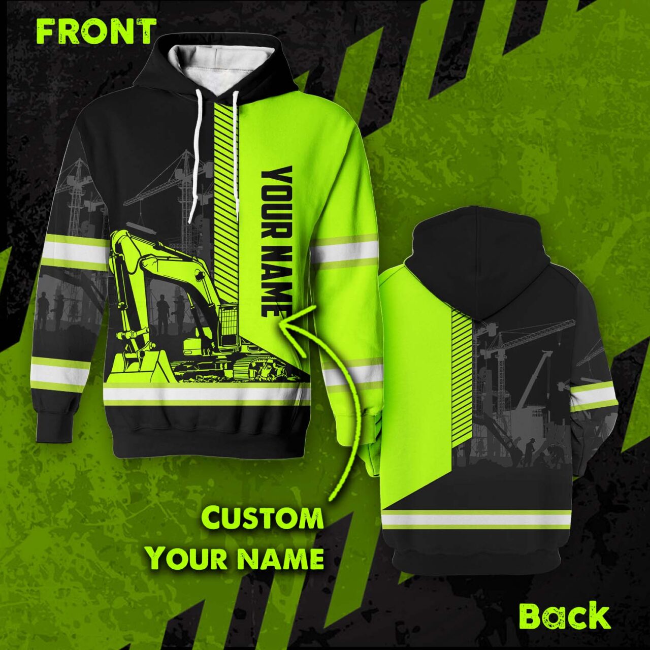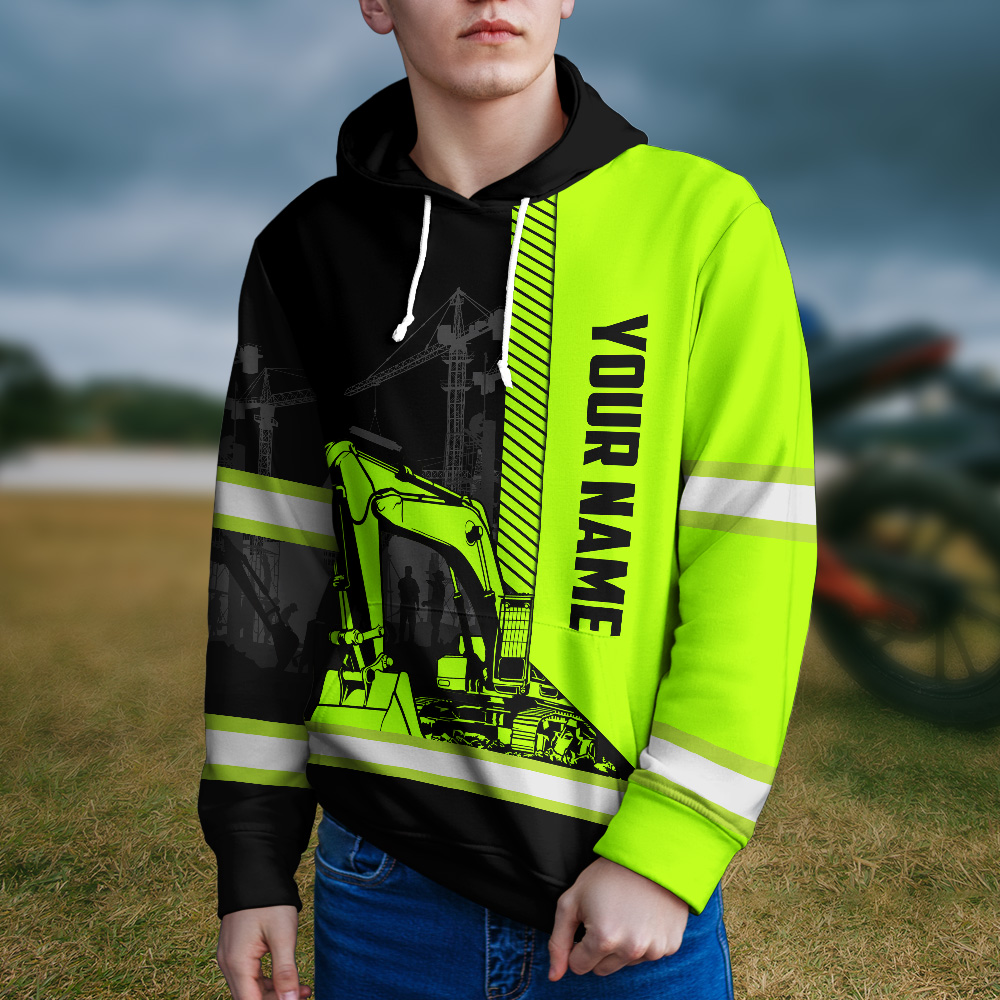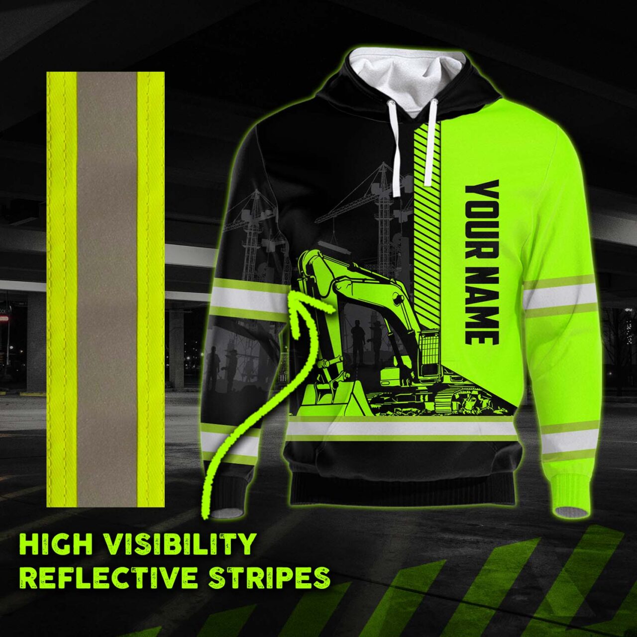 Hi Vis Hoodie JOB Reflective Green Neon Excavator Operator Custom Name Safety Workwear For Workers, Runners, Cyclists, Patriotic