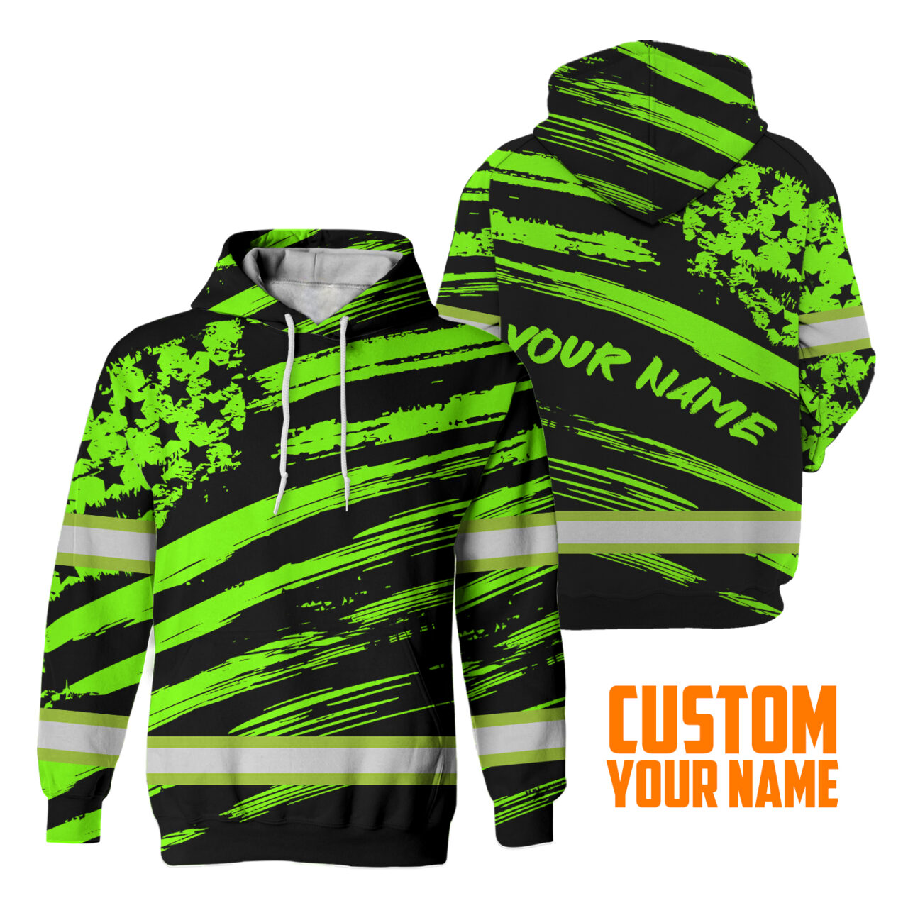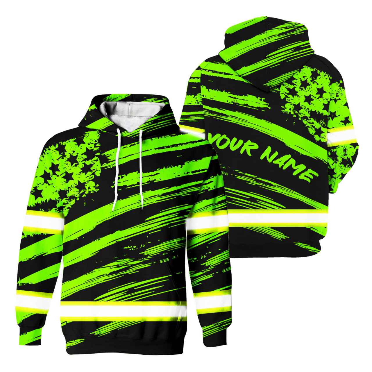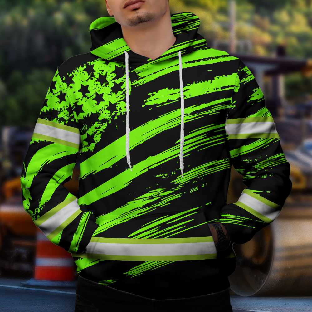 Hi Vis Hoodie Reflective America Flag Patriotic Green Neon Custom Name Safety Workwear For Workers, Runners, Cyclists, Truckers, Operator