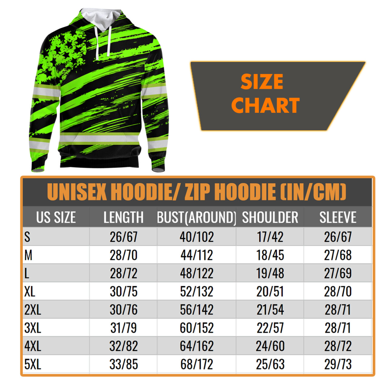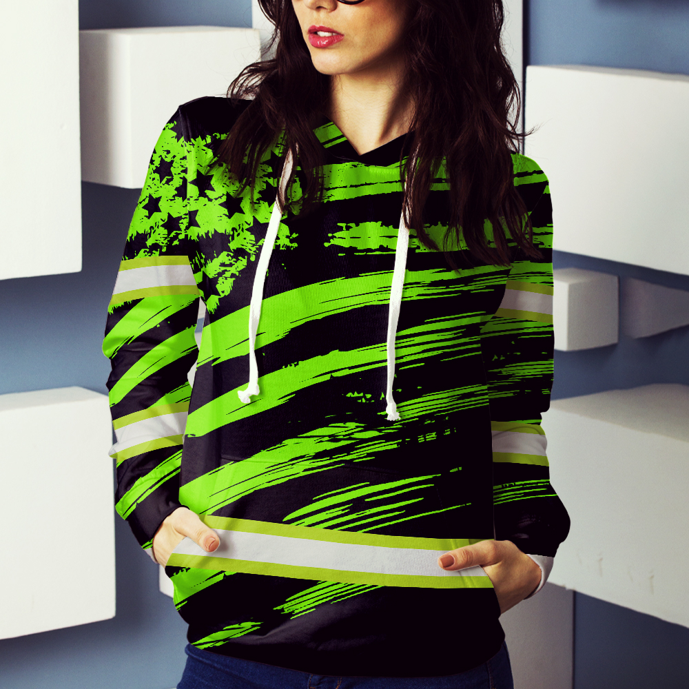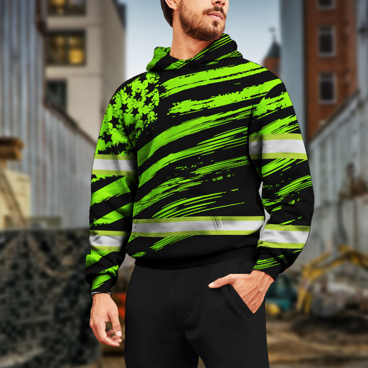 Hi Vis Hoodie Reflective America Flag Patriotic Green Neon Custom Name Safety Workwear For Workers, Runners, Cyclists, Truckers, Operator