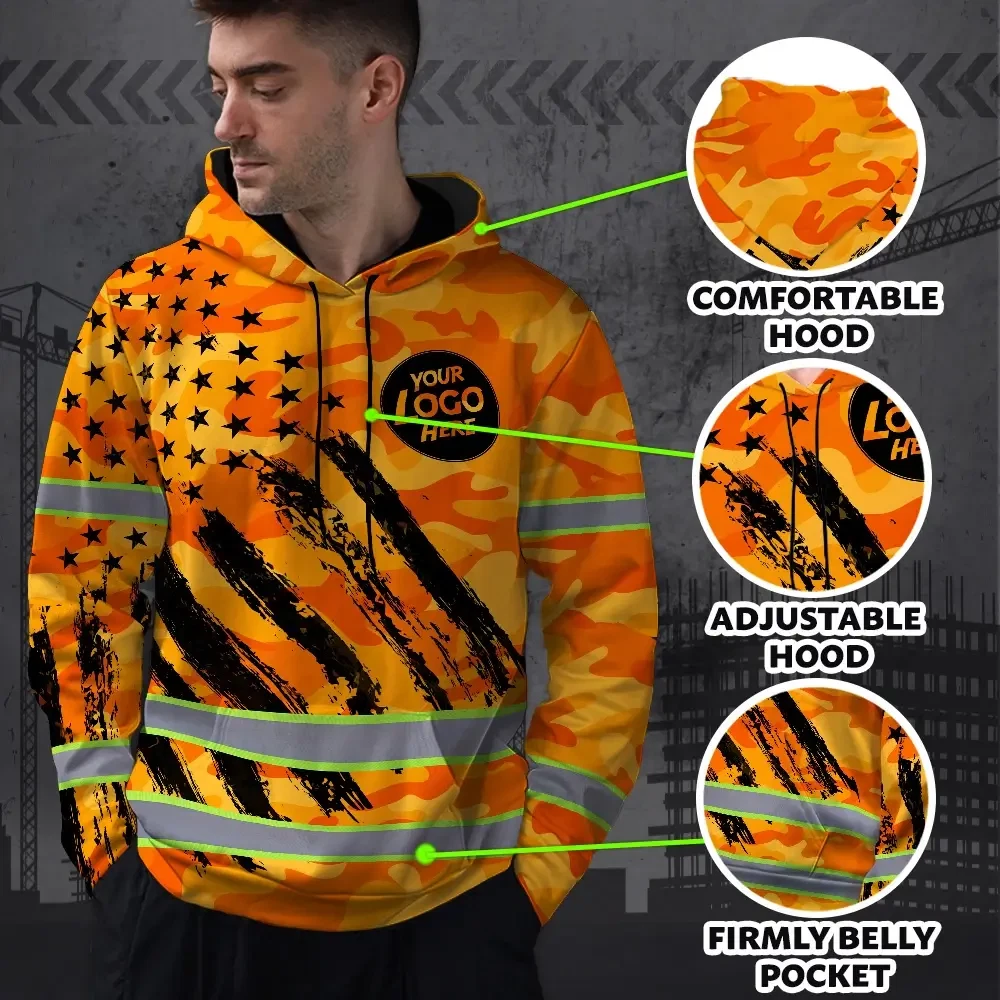 Hi Vis Hoodie Reflective Camo Orange Neon US Flag Custom Name And Logo Safety Workwear For Truckers, Workers, Runners, Cyclists, Patrioti
