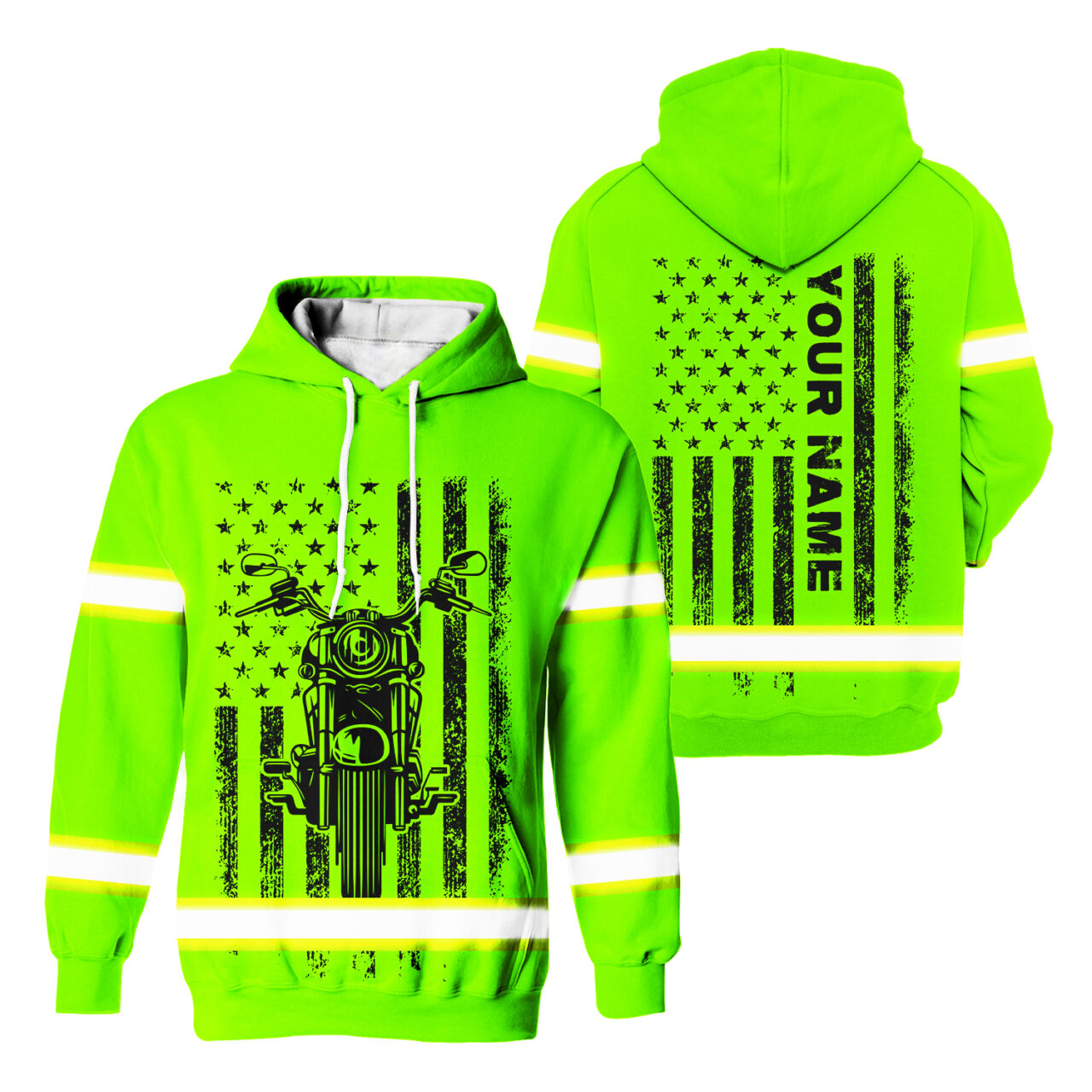Hi Vis Hoodie Reflective Custom Name American Motorcycle US Flag Cool Biker Gift, Safety Workwear Description