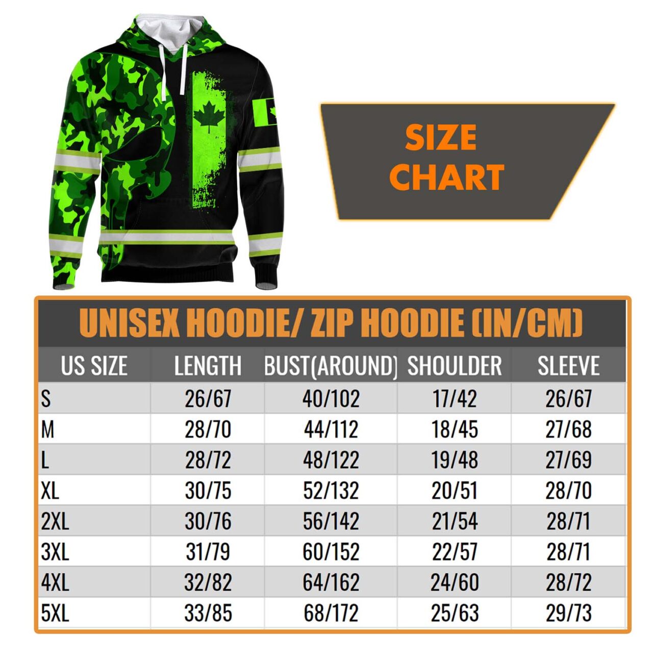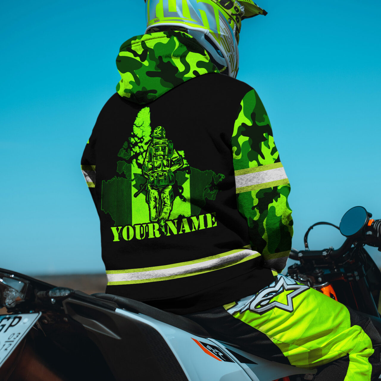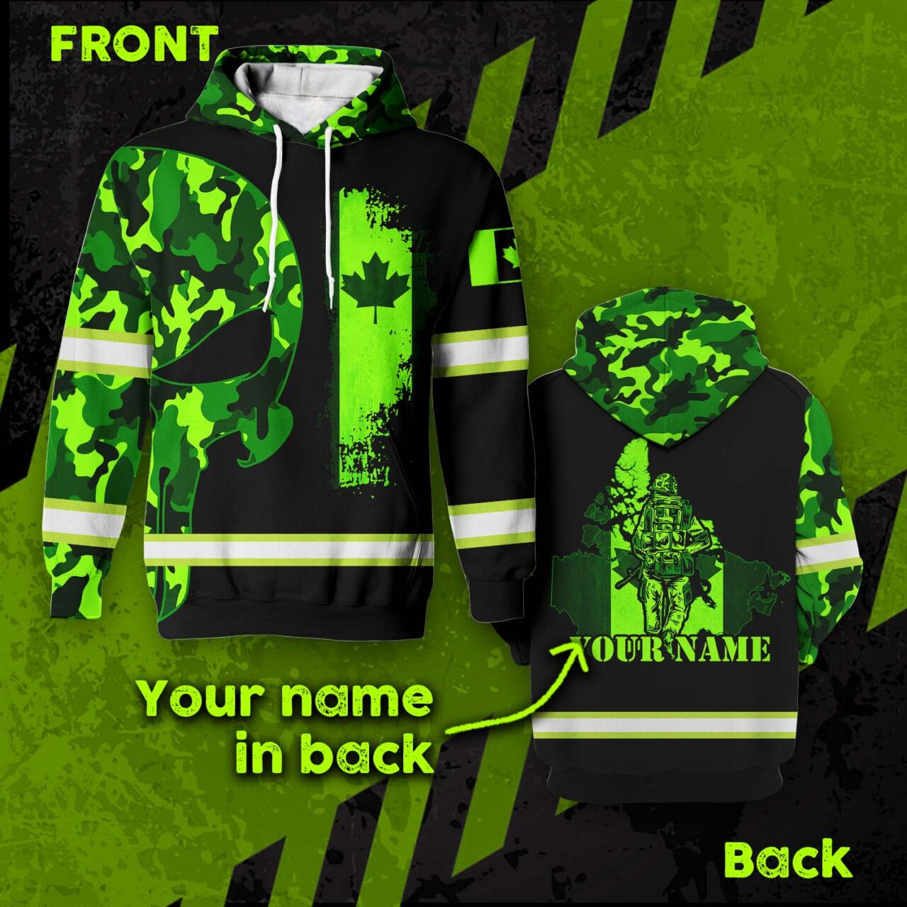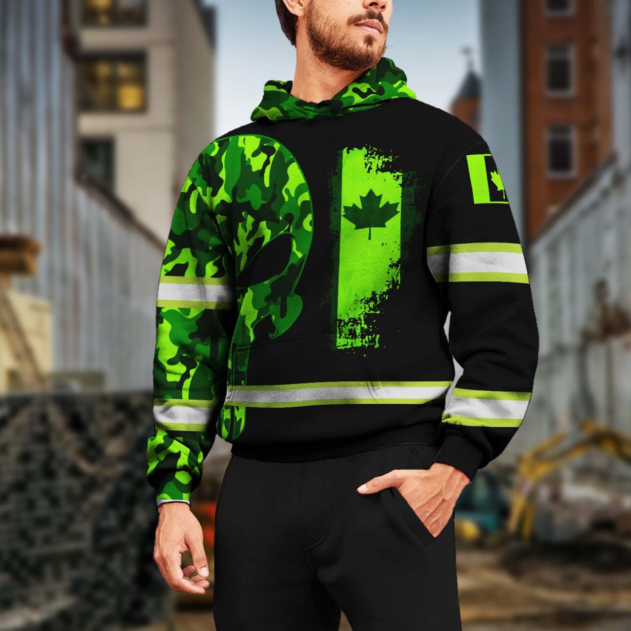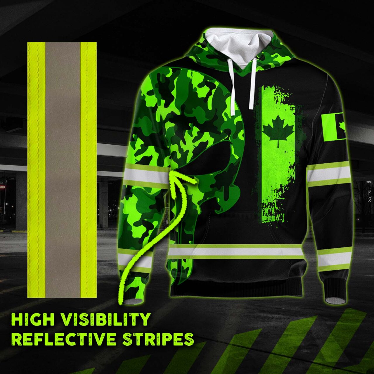 Hi Vis Hoodie Reflective Green Neon Camo Skull With Canada Flag Veteran Custom Name Safety Workwear For Workers, Runners, Cyclists, Patriotic