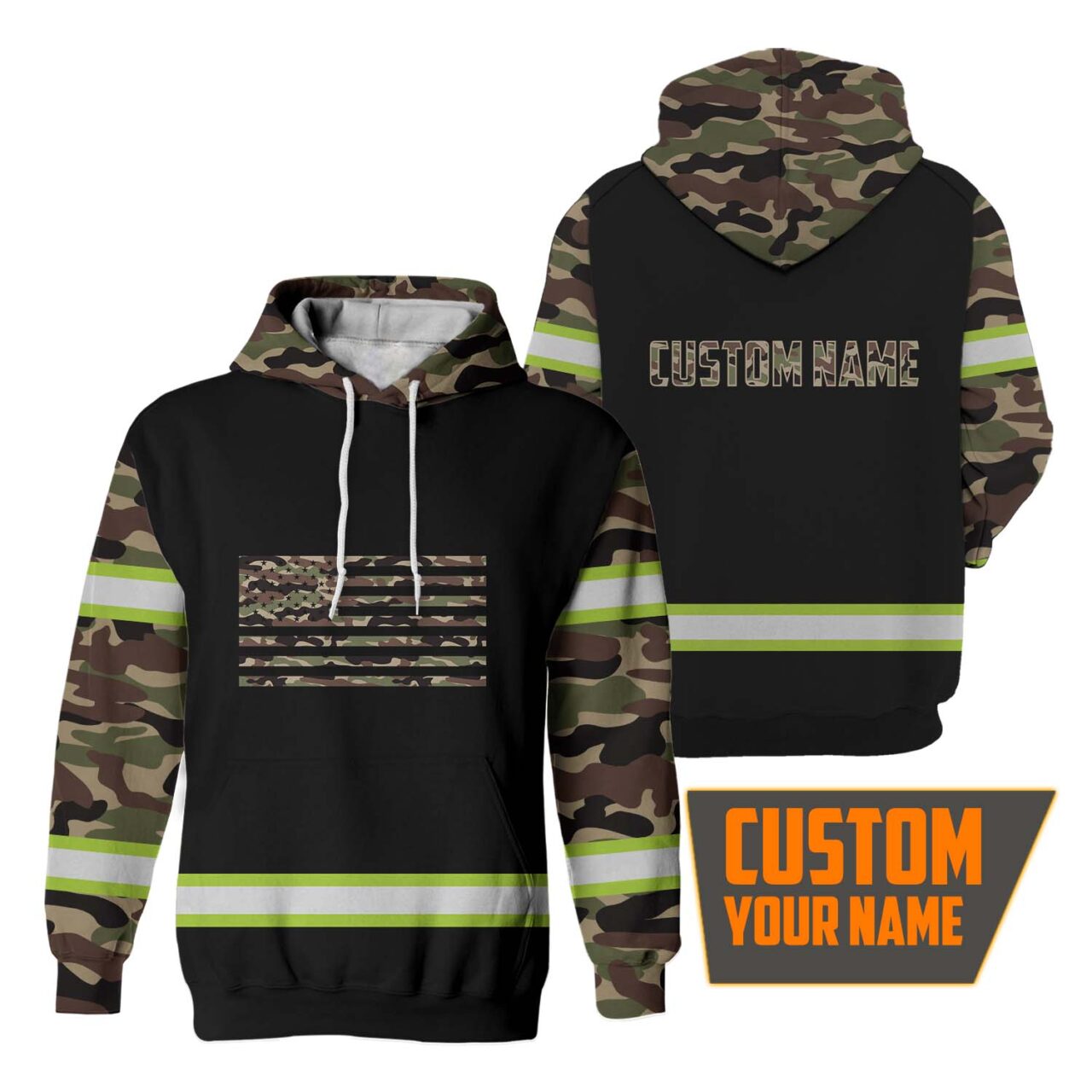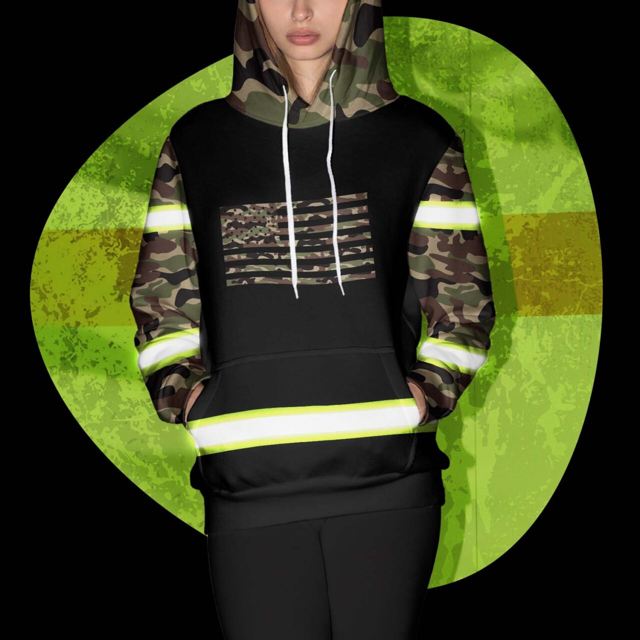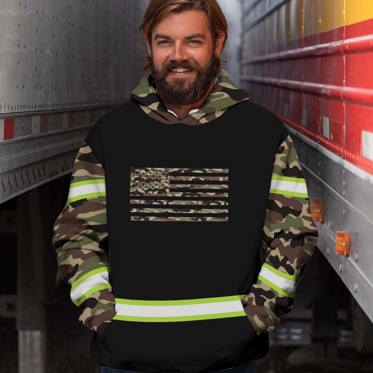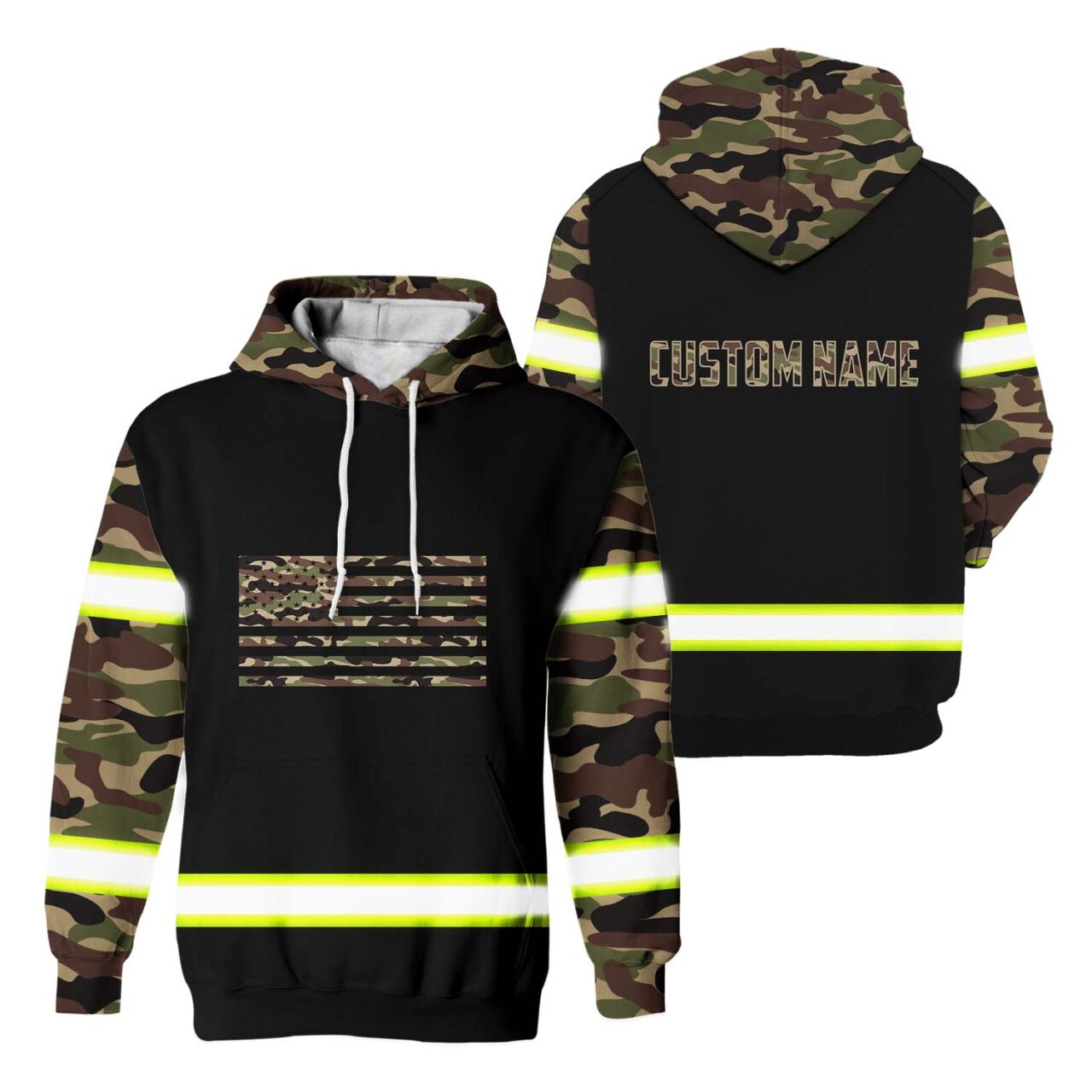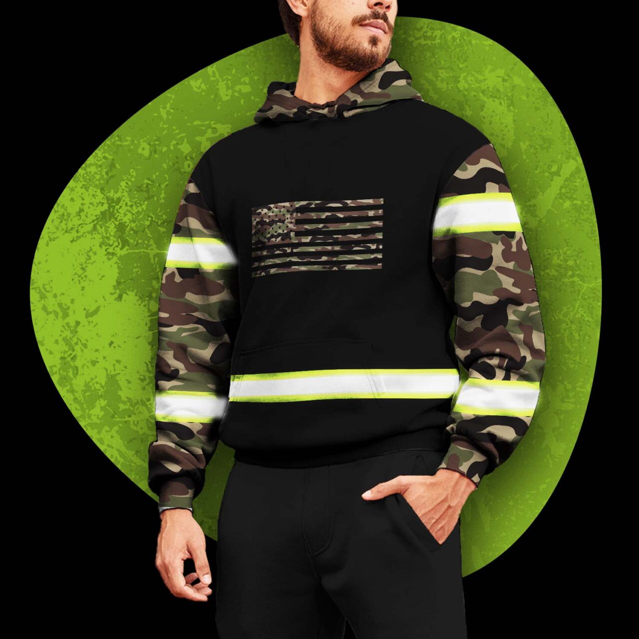 Hi Vis Hoodie Reflective Green Neon Camo USA Flag Custom Name Safety Workwear For Worker, Operator, Trucker