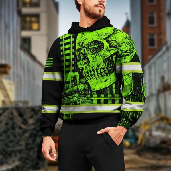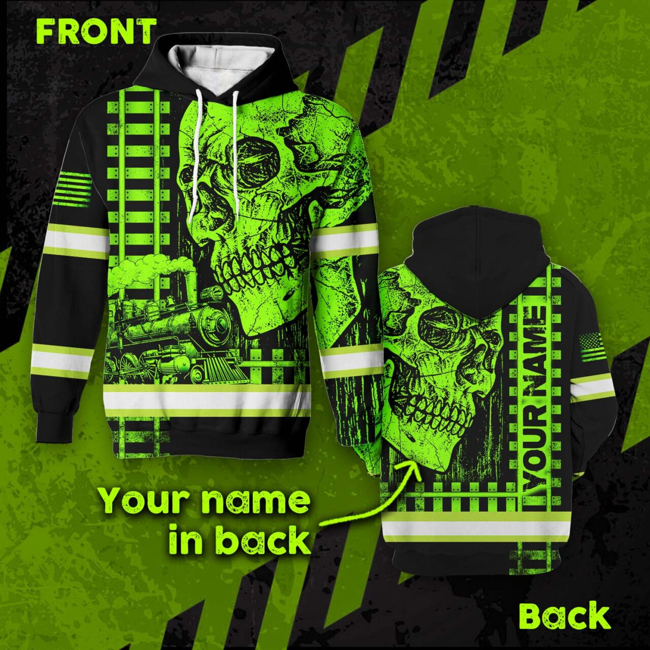 Hi Vis Hoodie Reflective Green Neon Skull US Flag Railroad Custom Name Safety Workwear For Workers, Runners, Cyclists, Patriotic
