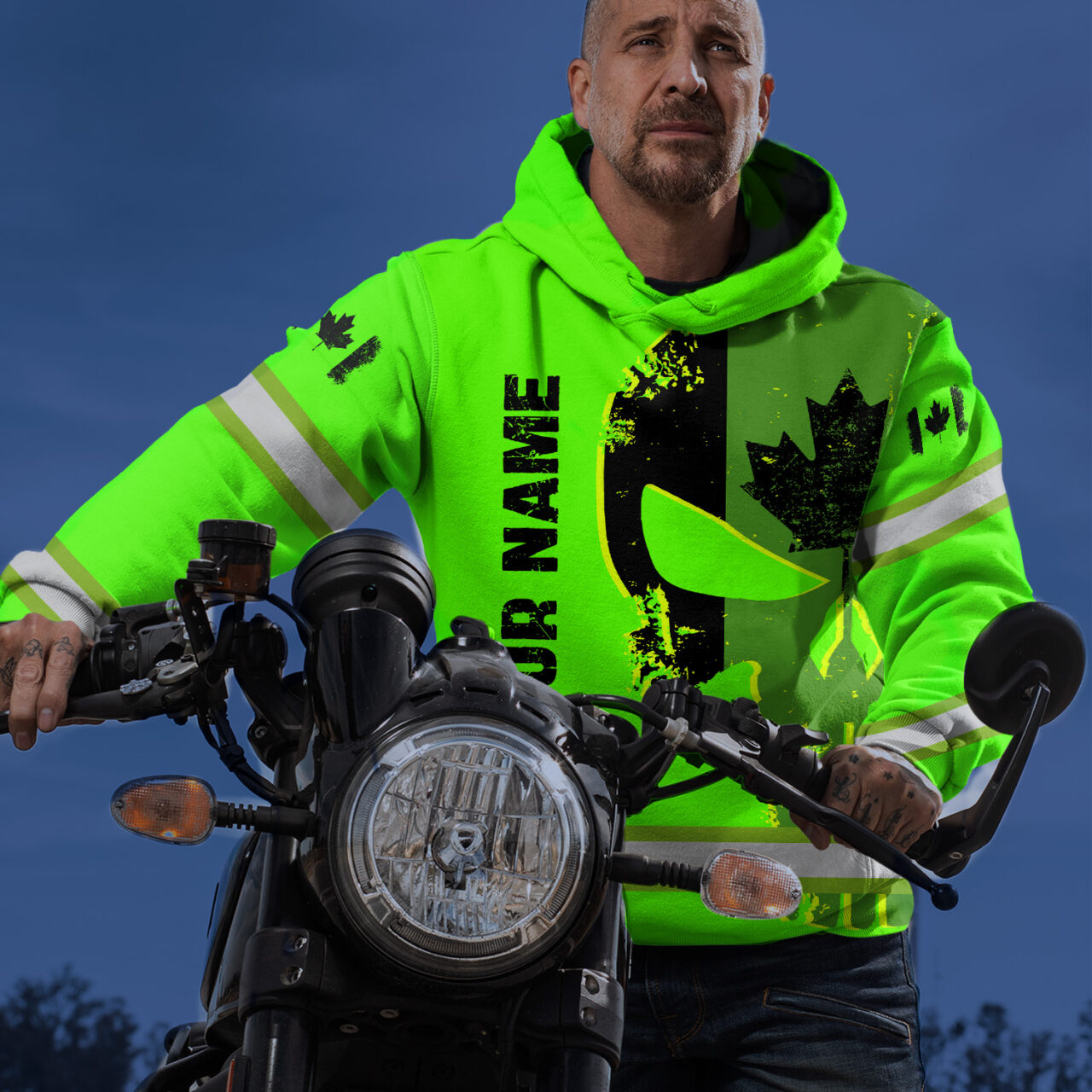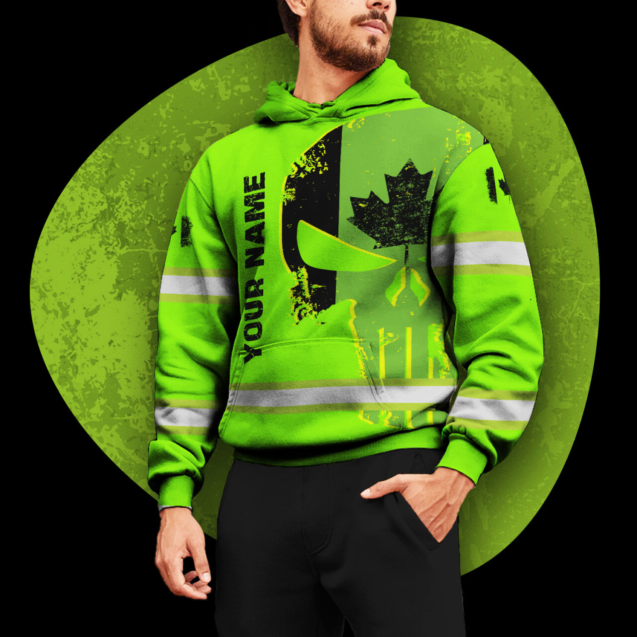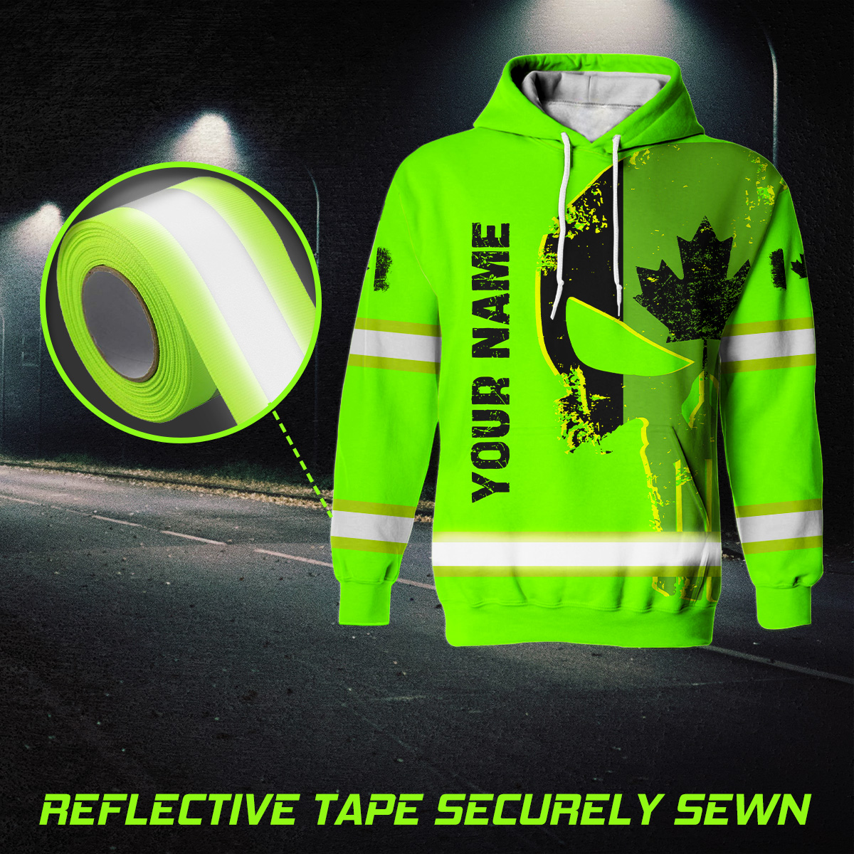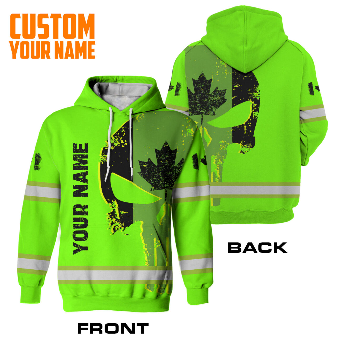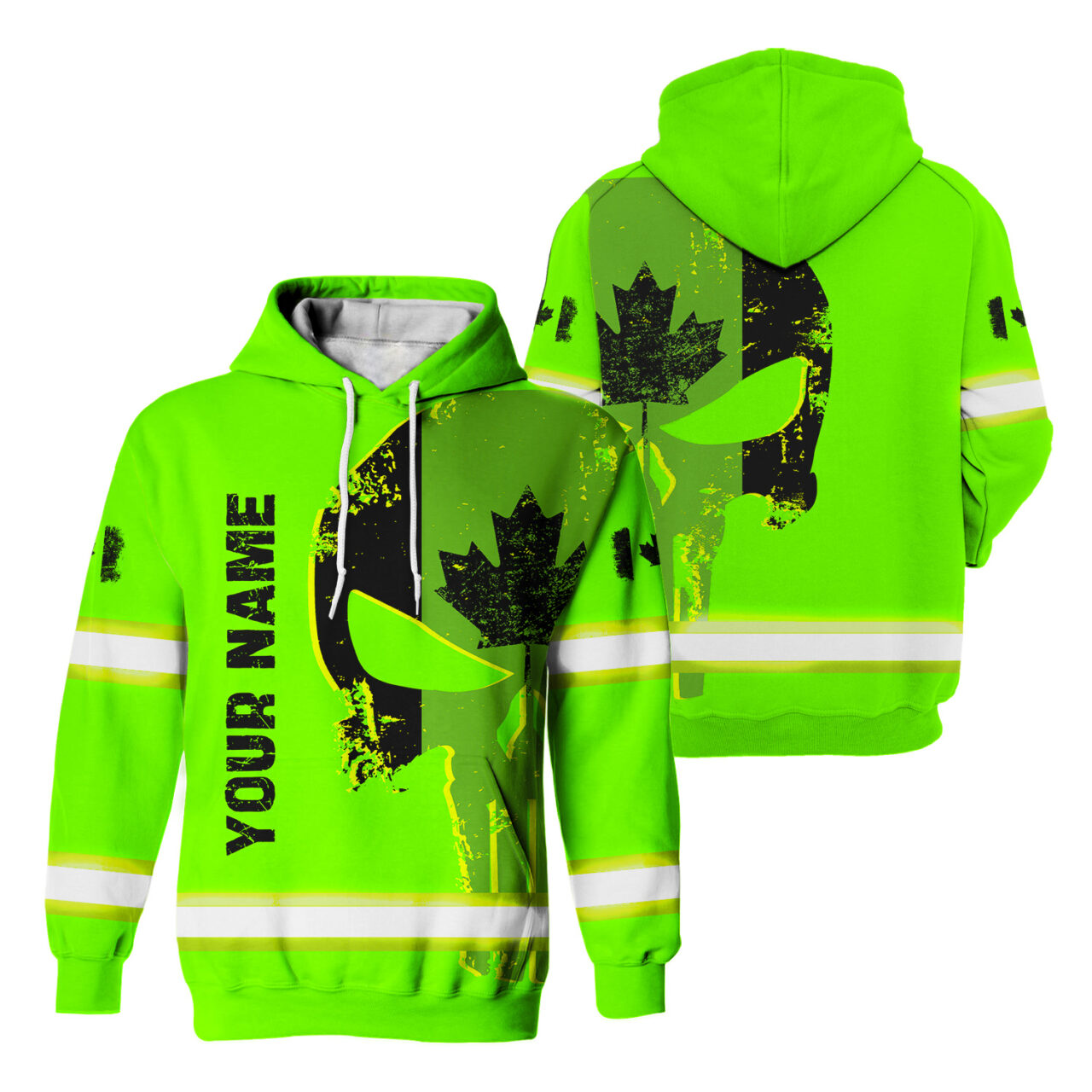 Hi Vis Hoodie Reflective Green Neon Skull With Canada Flag Custom Name Safety Workwear For Workers, Runners, Cyclists, Patriotic