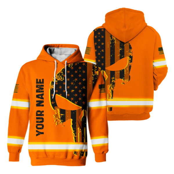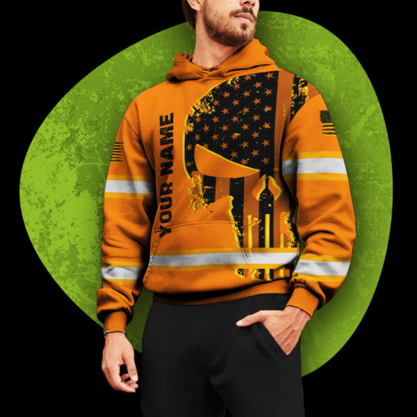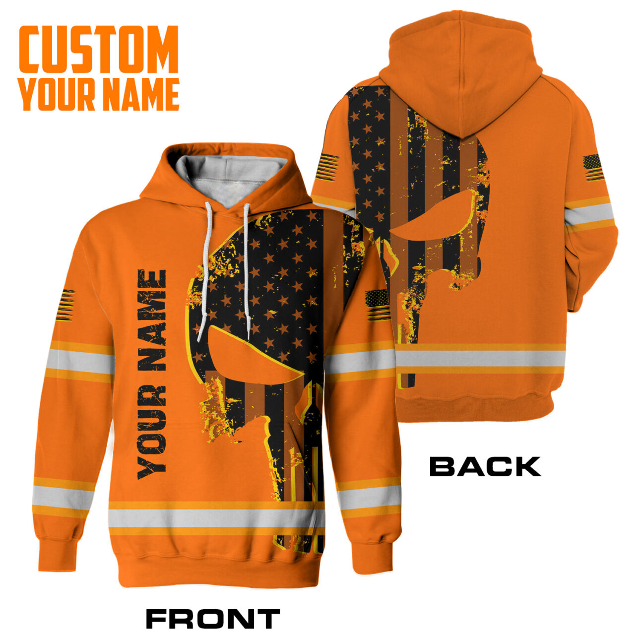 Hi Vis Hoodie Reflective Orange Neon Skull With USA Flag Custom Name Safety Workwear For Workers, Runners, Cyclists, Patriotic