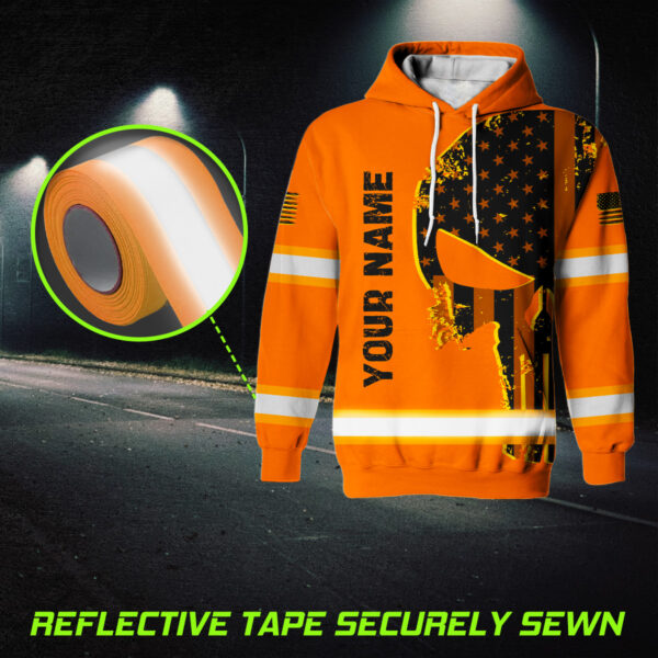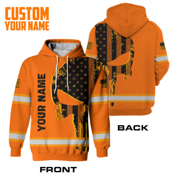 Hi Vis Hoodie Reflective Orange Neon Skull With USA Flag Custom Name Safety Workwear For Workers, Runners, Cyclists, Patriotic quantity