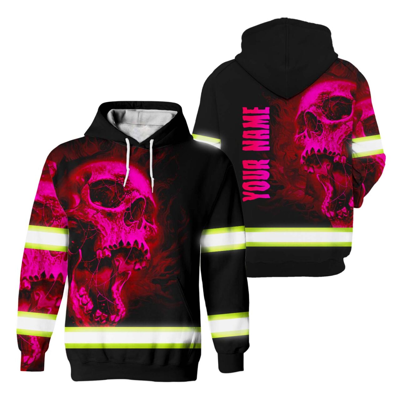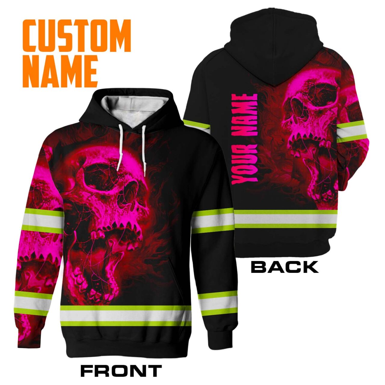 Hi Vis Hoodie Reflective Pink Neon Skull Custom Name Safety Workwear For Workers, Runners, Cyclists, Patriotic
