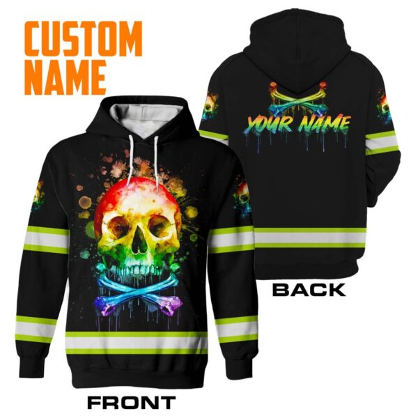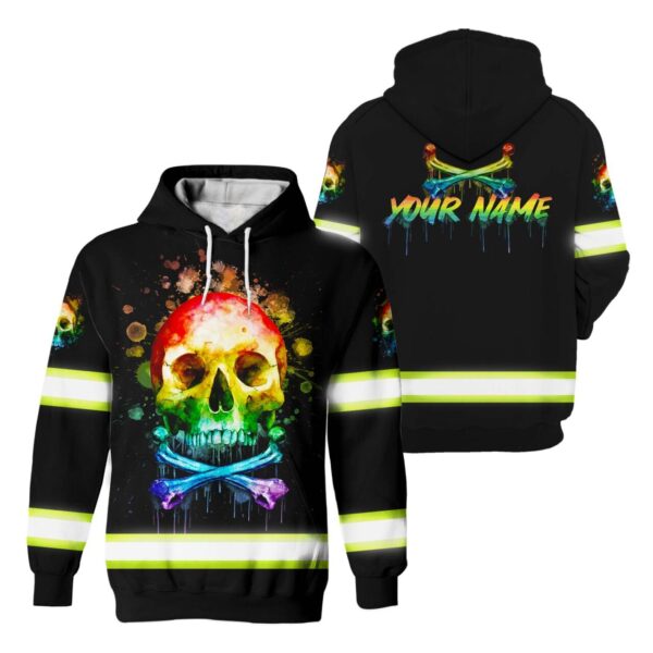 Hi Vis Hoodie Reflective Rainbow Neon Skull Watercolor Custom Name Safety Workwear For Workers, Runners, Cyclists, Patriotic