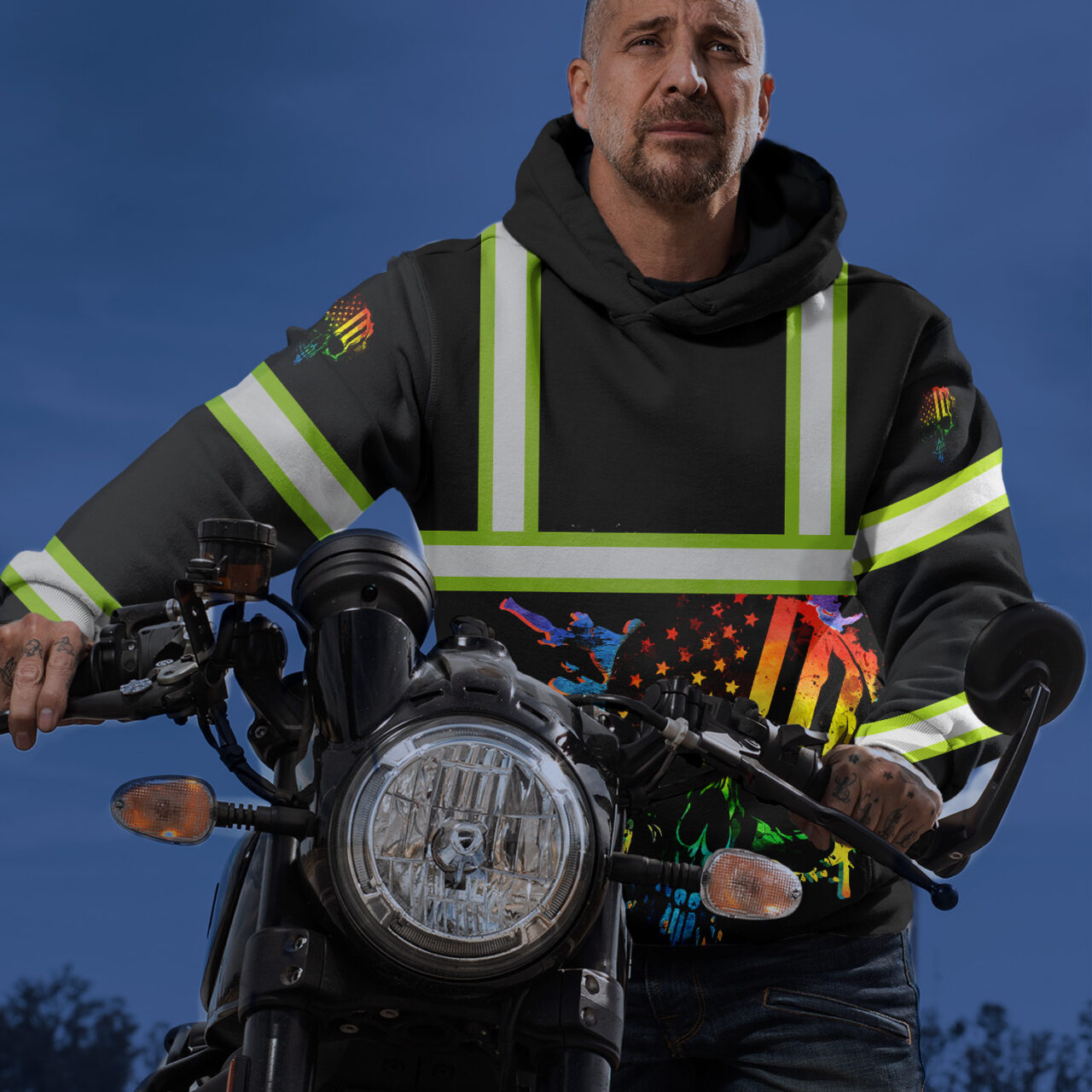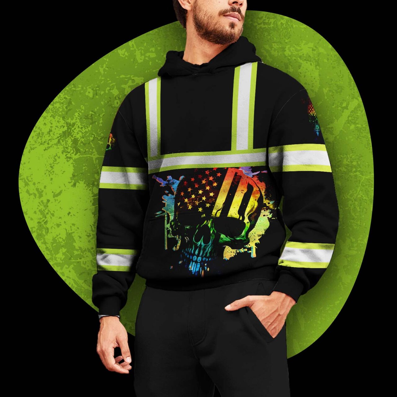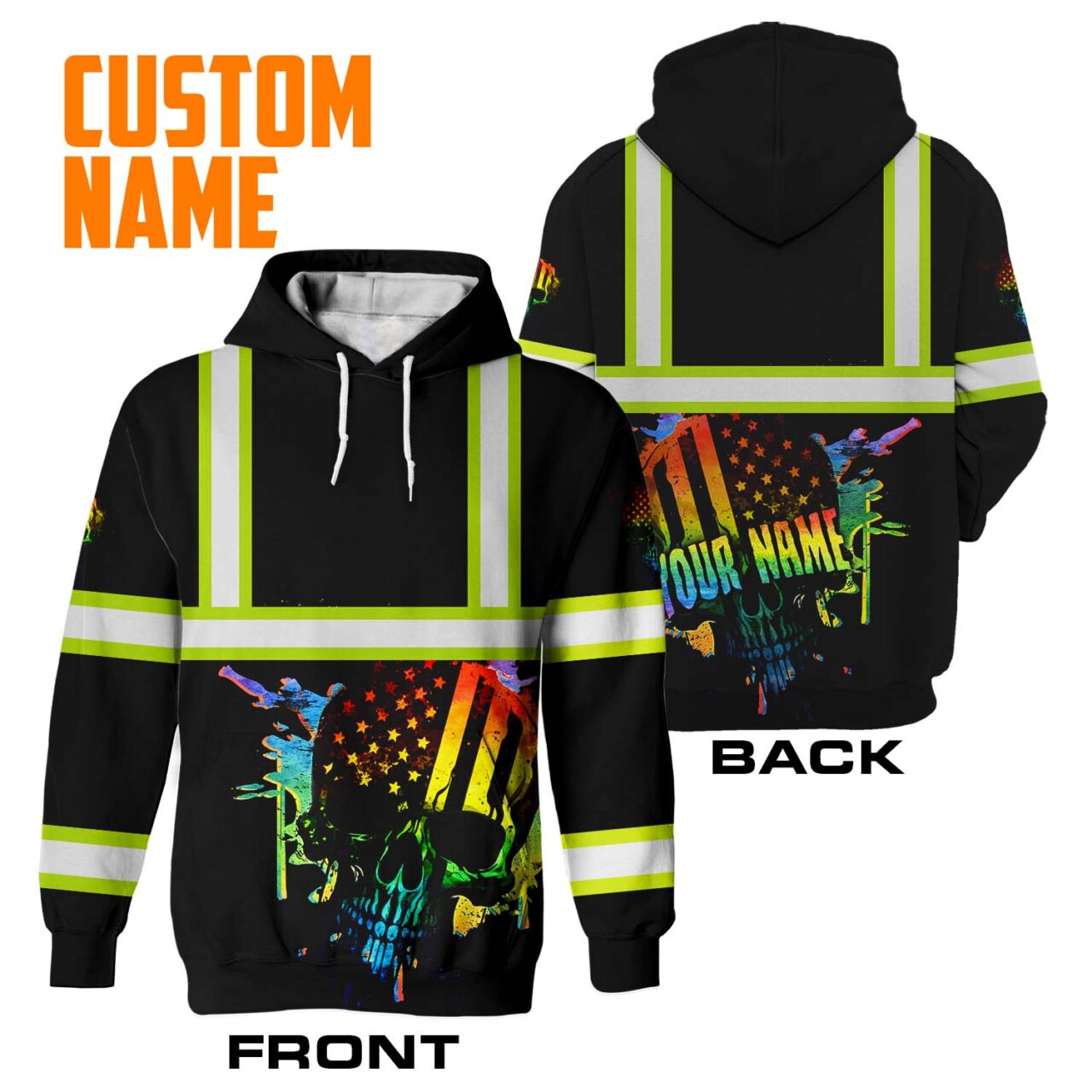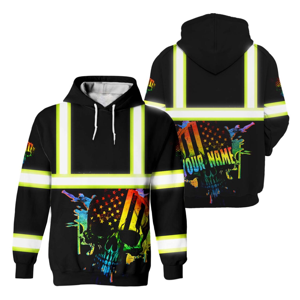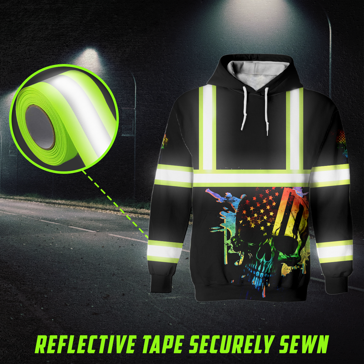 Hi Vis Hoodie Reflective Rainbow Neon USA Skull Custom Name Safety Workwear For Workers, Runners, Cyclists, Patriotic