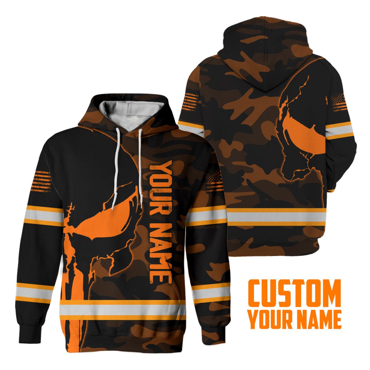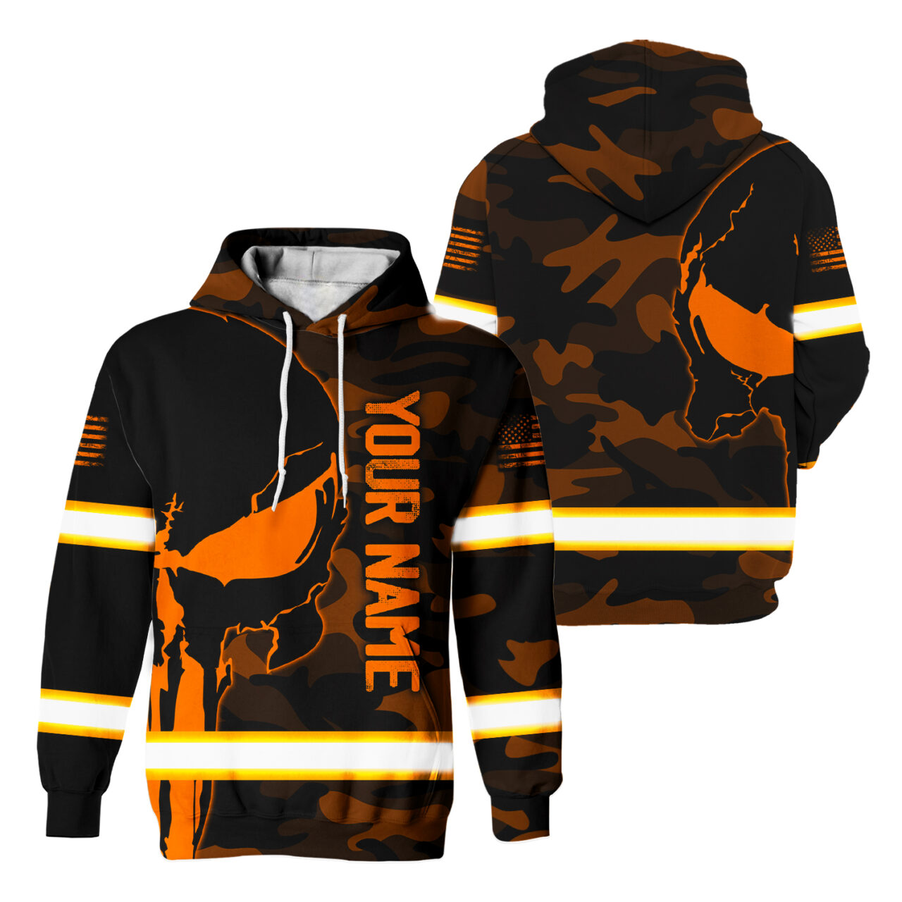 Hi Vis Hoodie Reflective Skull Orange Camo Neon US Flag Custom Name Safety Workwear For Workers, Runners, Cyclists, Trucker, Operator, Patriotic Description