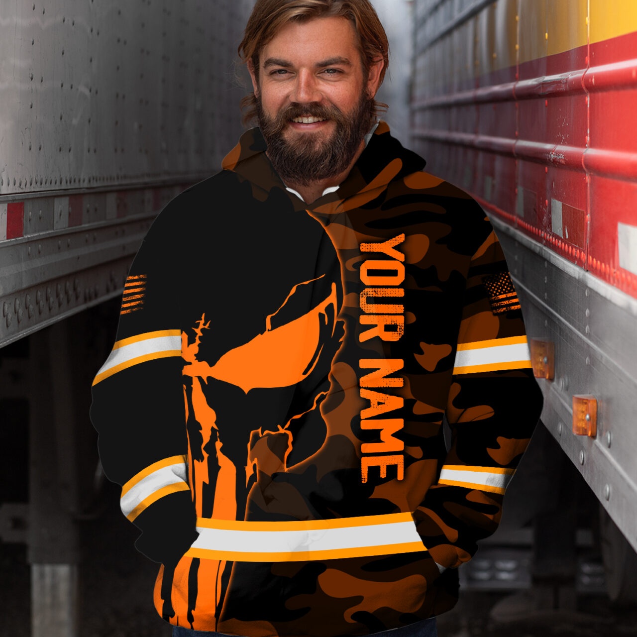 Not only does it feature a bold orange camo design, but it also has reflective skulls and an American flag for added visibility. Plus, you can customize it with your own name for a truly unique look. Whether you’re a construction worker, runner, or trucker, this hoodie is the perfect choice for staying safe while on the job or out on the road. So show off your patriotism and practicality with this hi vis hoodie. It’s the ultimate combination of fashion and function.
