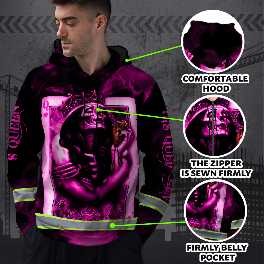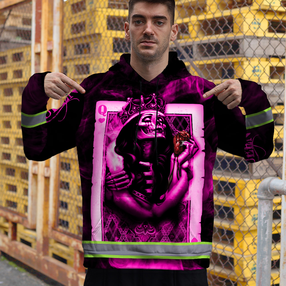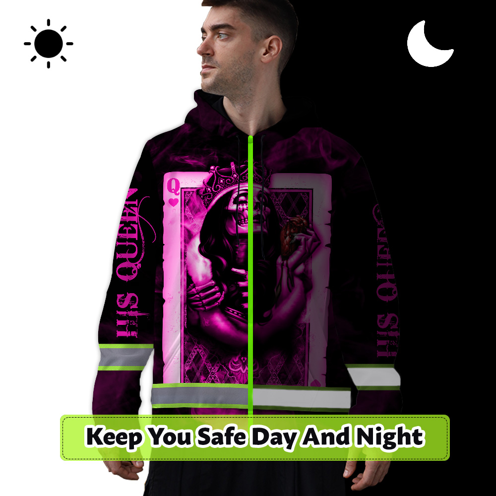 If you are in the market for high vis hoodies, we highly recommend checking out our reflective sugar skull pink his queen custom name safety workwear. It is perfect for anyone who wants to be safe and stylish at the same time. Not only will you stay visible while working or walking around during low-light conditions, but you will also look great while doing it! Plus, with our customization options, you can make sure that your hoodie reflects your unique personality. So why wait? Order at Hi Vis Custom today!