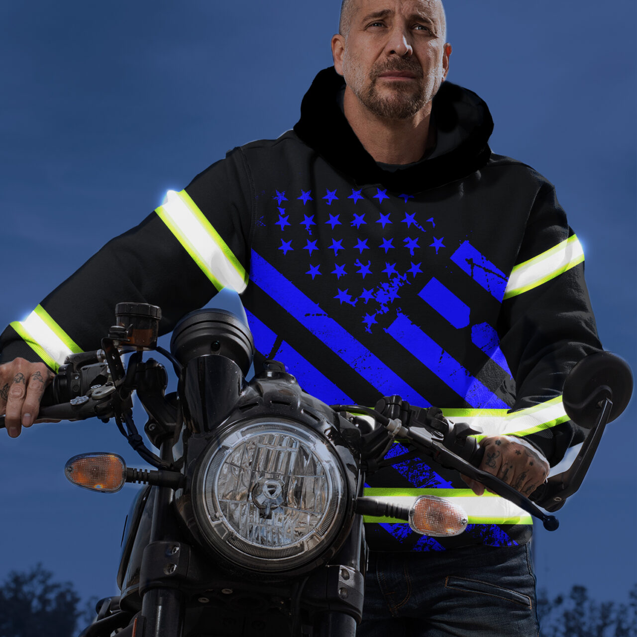 Hi Vis Hoodie Reflective Tapes Black Blue USA Flag Safety Workwear For Workers, Runners, Cyclists, Patriotic Key Features