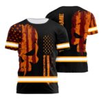 Hi Vis Shirt Reflective Orange Neon Strong Skull US Flag Custom Name Safety Workwear For Workers, Runners, Cyclists, Trucker, Operator, Patriotic