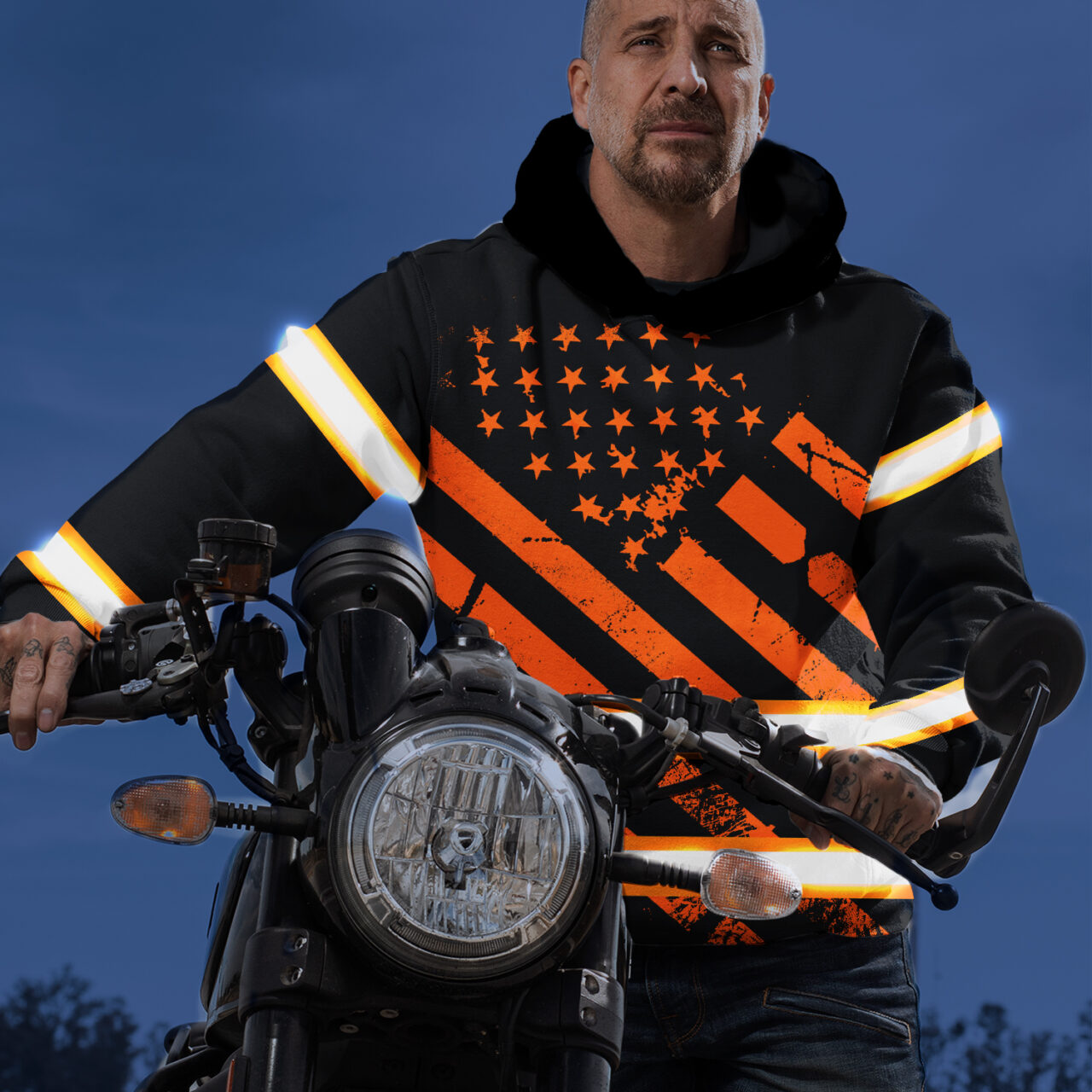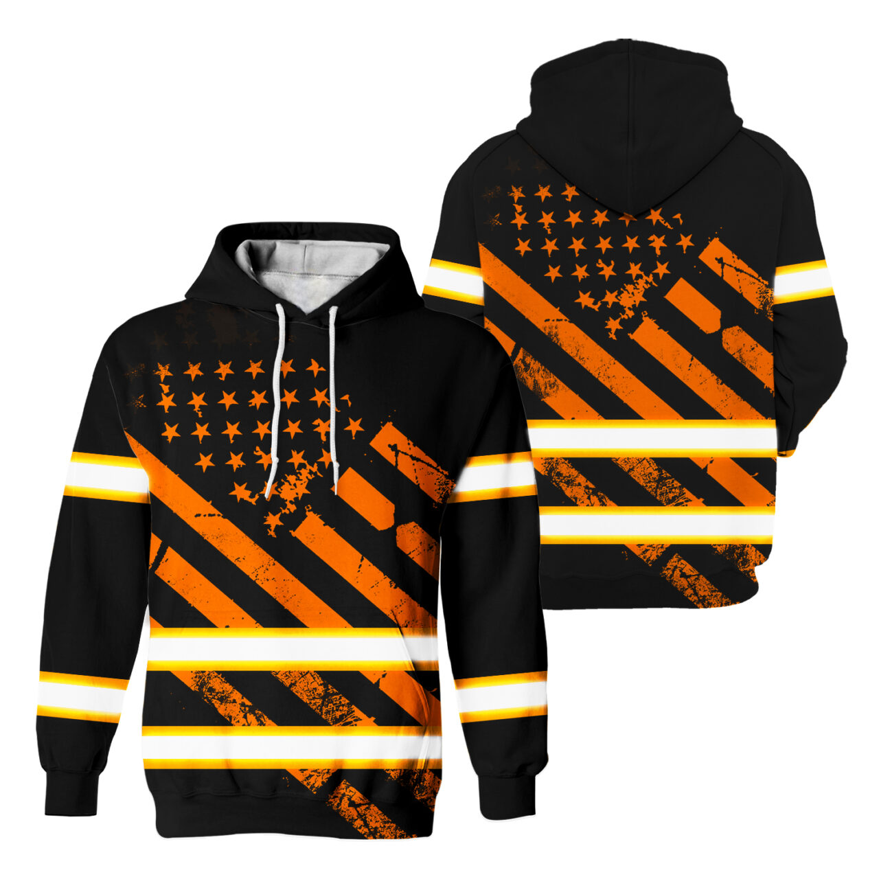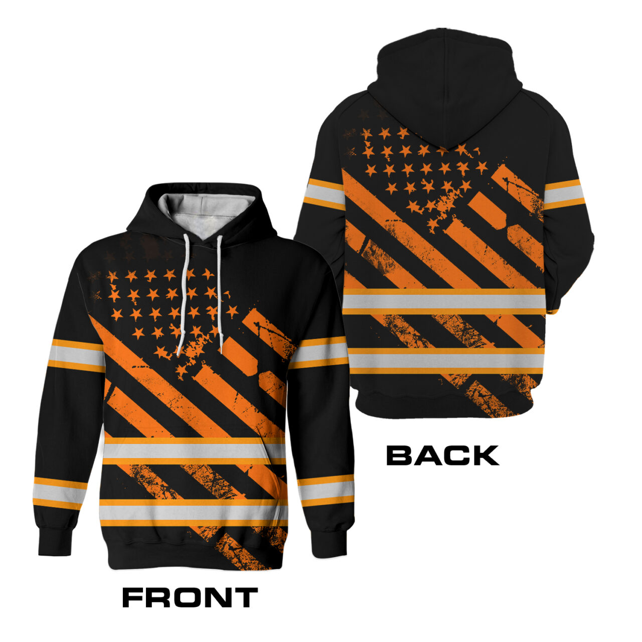 Hi Vis Hoodie Reflective Tapes Black Orange USA Flag Safety Workwear For Workers, Runners, Cyclists, Patriotic Key Features