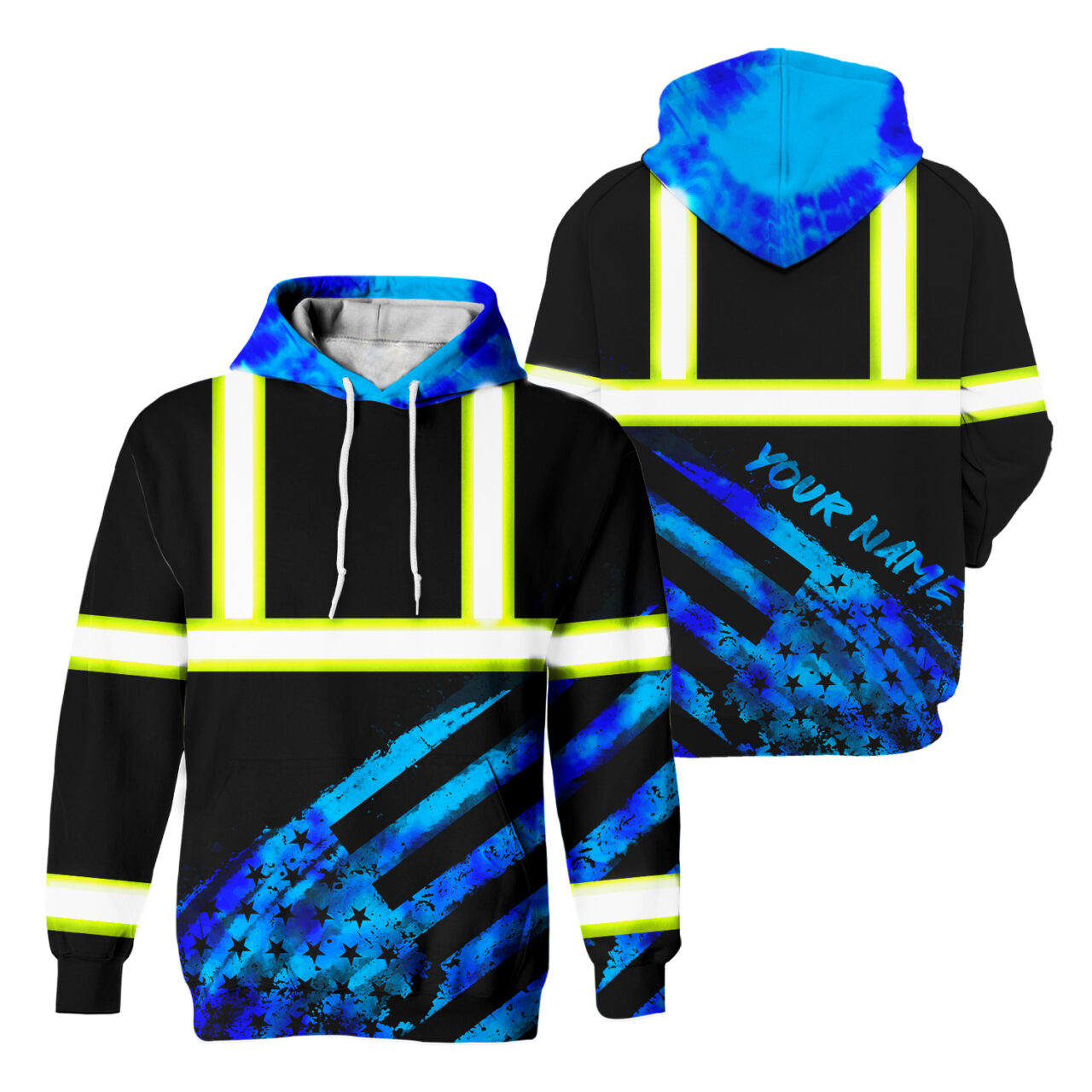 Hi Vis Hoodie Reflective Tapes Blue Flag Tie Dye Custom Name Safety Workwear For Workers, Runners, Cyclists