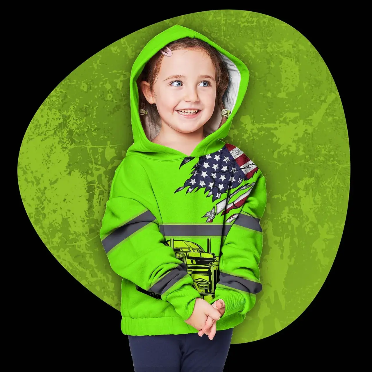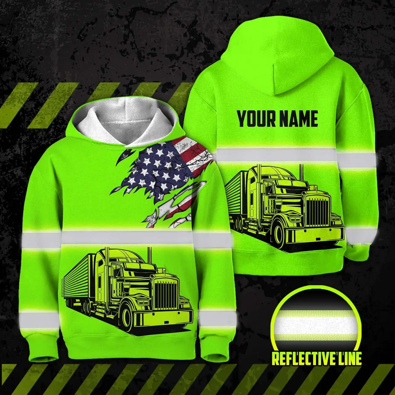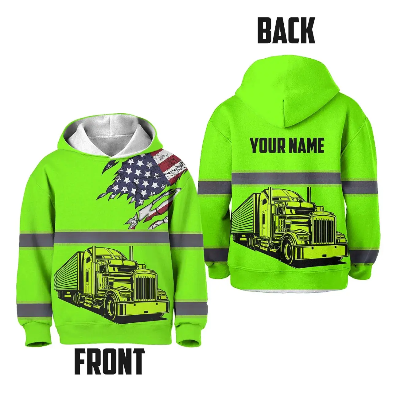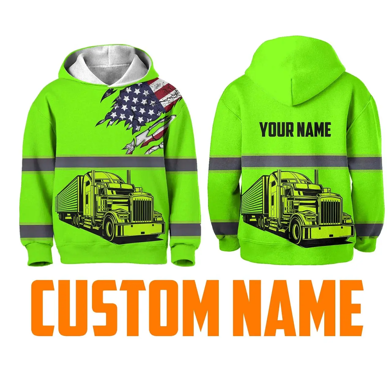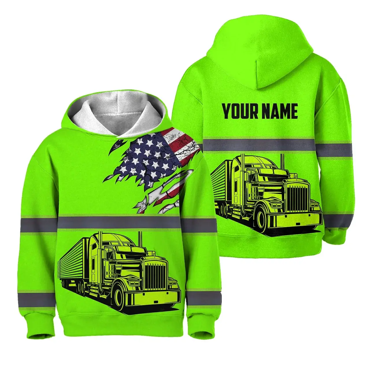 Hi Vis Hoodie Reflective Tapes Green Gradient Semi Truck Driver Custom Name For Kids