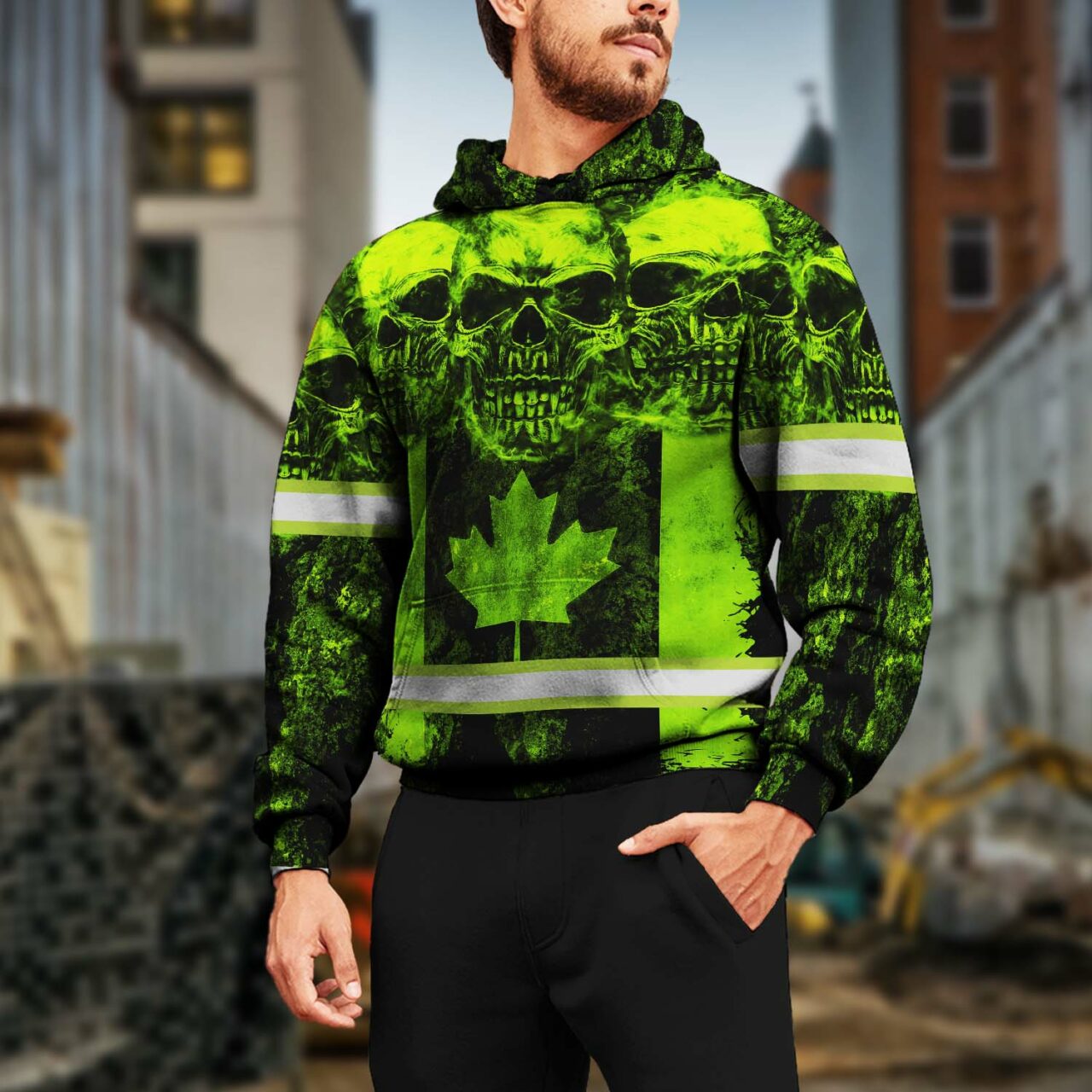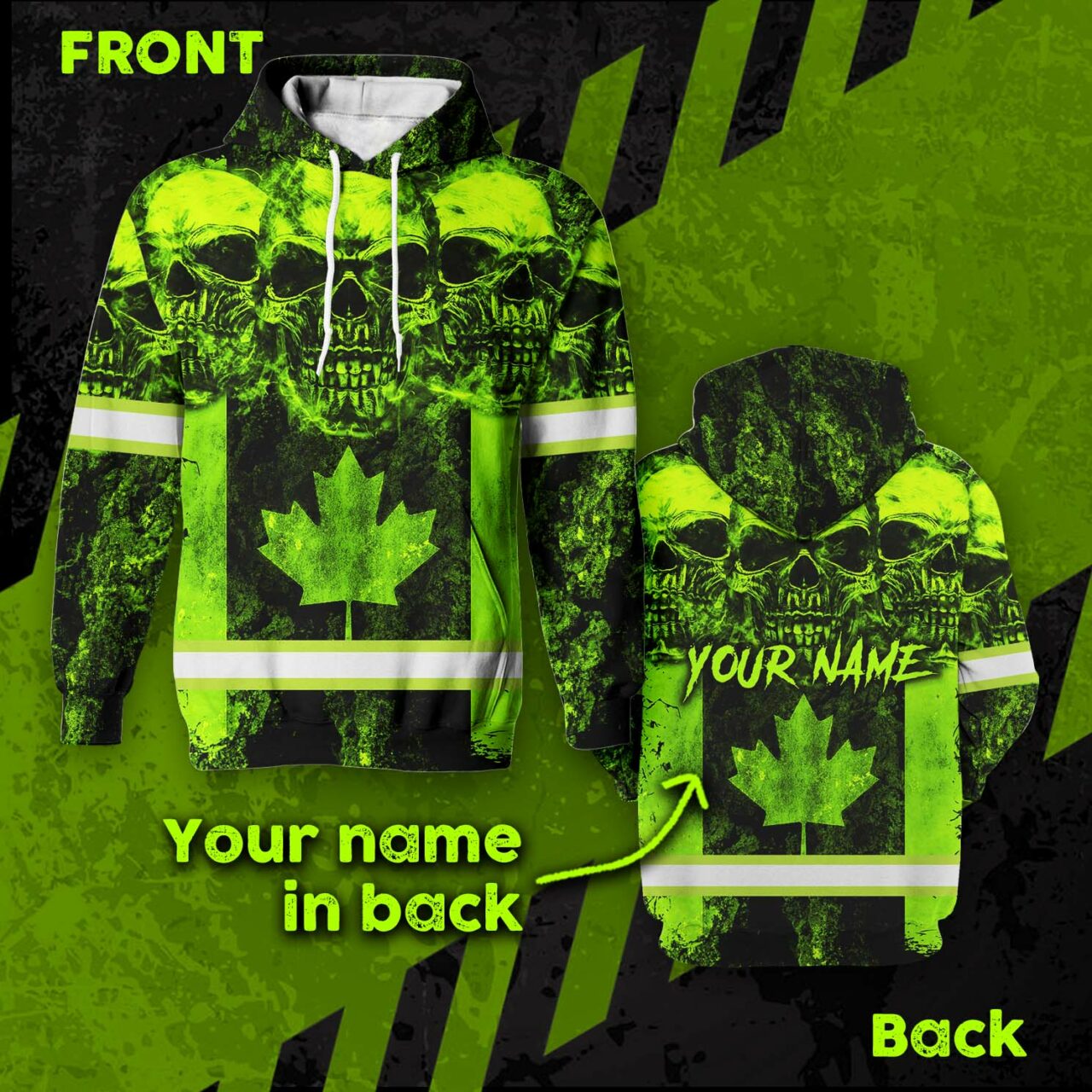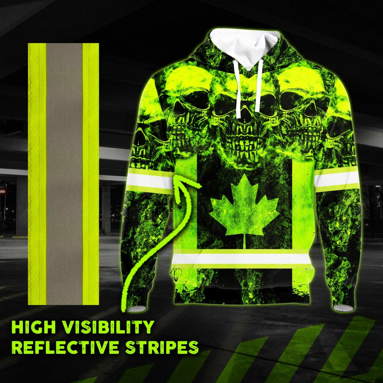 Hi Vis Hoodie Reflective Tapes Green Neon Skull Canada Flag
