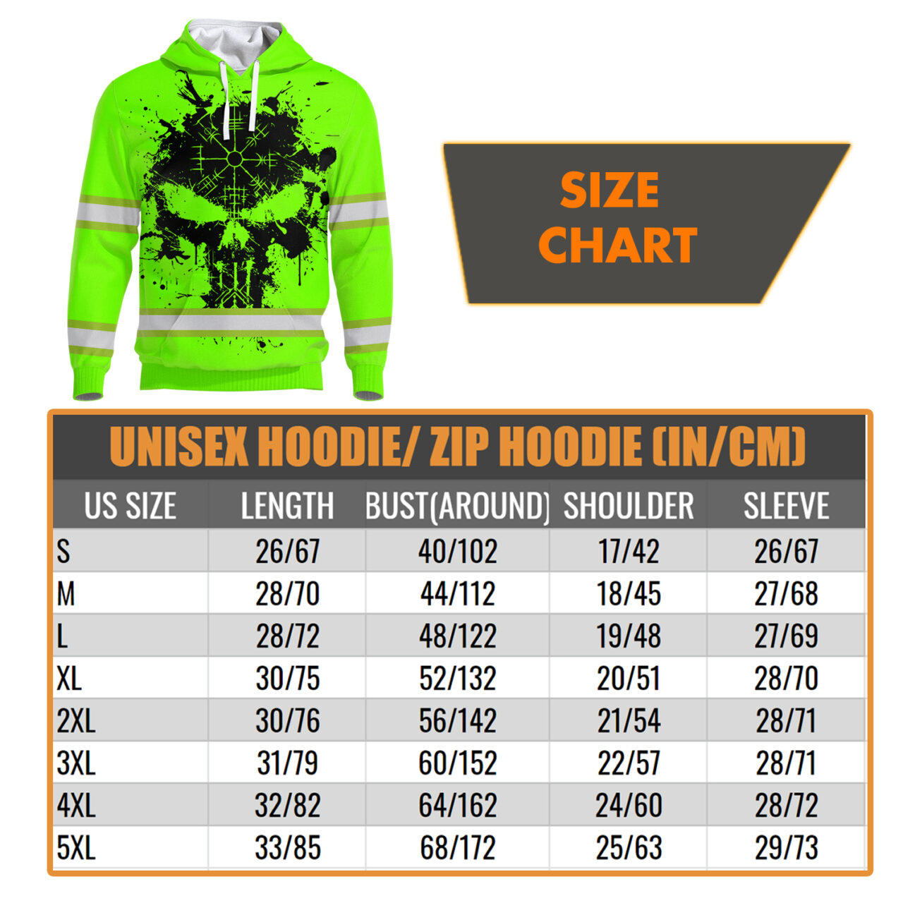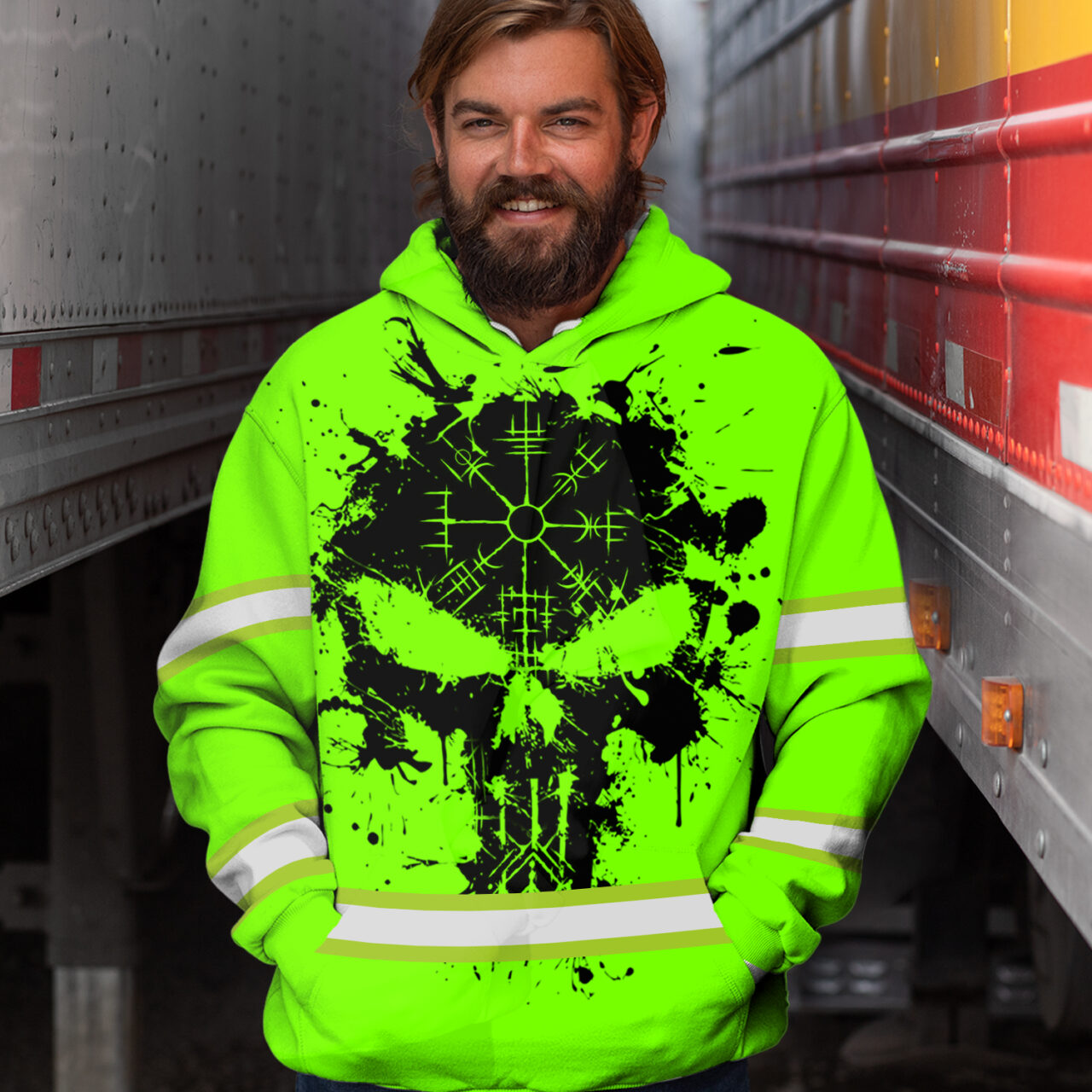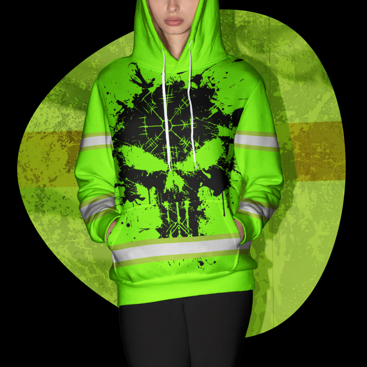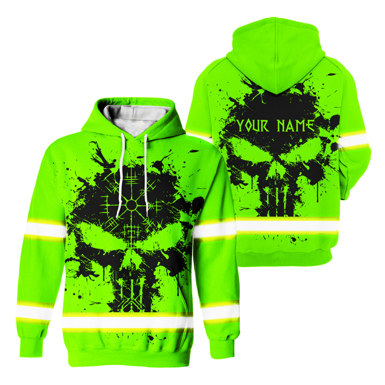 Hi Vis Hoodie Reflective Tapes Green Neon Skull Viking Symbol Custom Name Safety Workwear