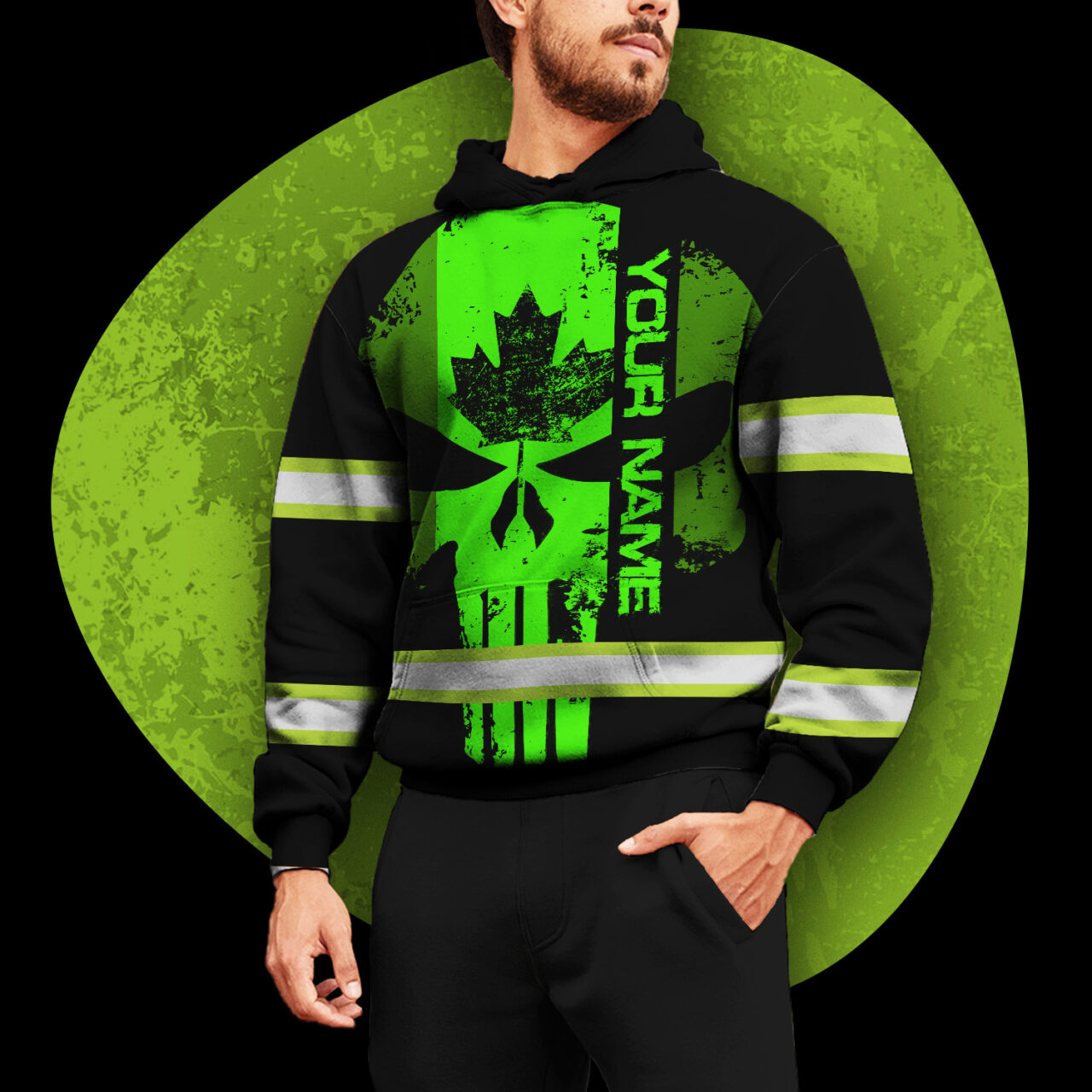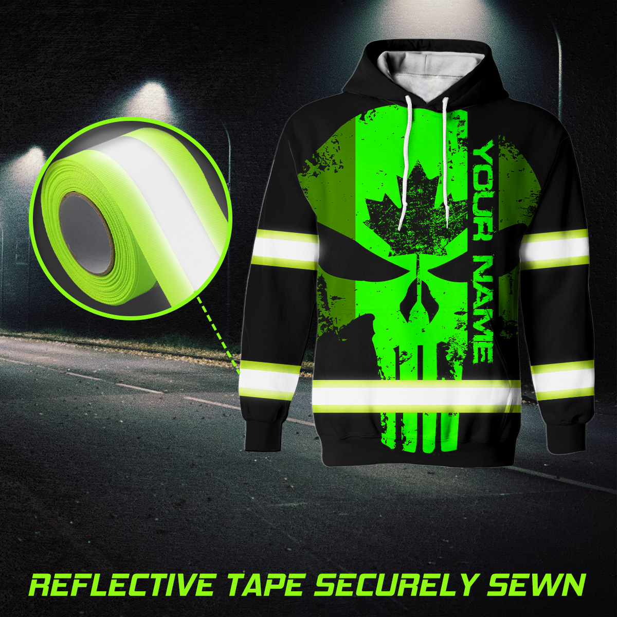 Hi Vis Hoodie Reflective Tapes Green Neon Skull With Canada Flag Construction Safety Workwear For Workers, Runners, Cyclists, Patriotic