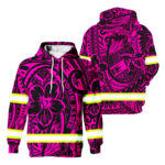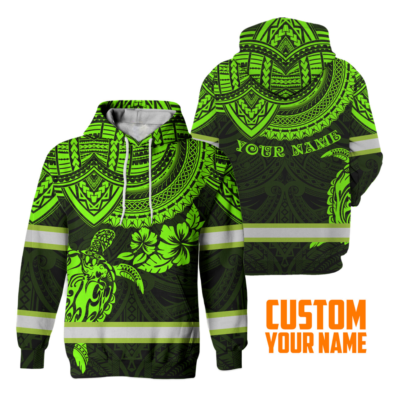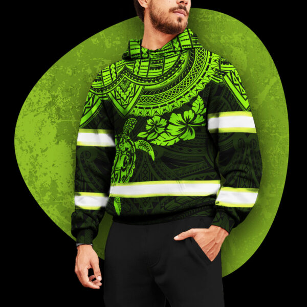Hi Vis Hoodie Reflective Tapes Green Turtle Flower Hawaiian Polynesian Tribal Custom Name Safety Workwear For Workers, Runners, Cyclists