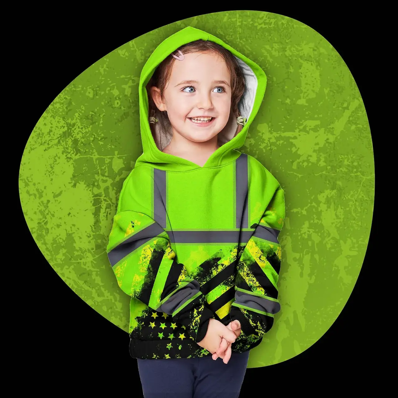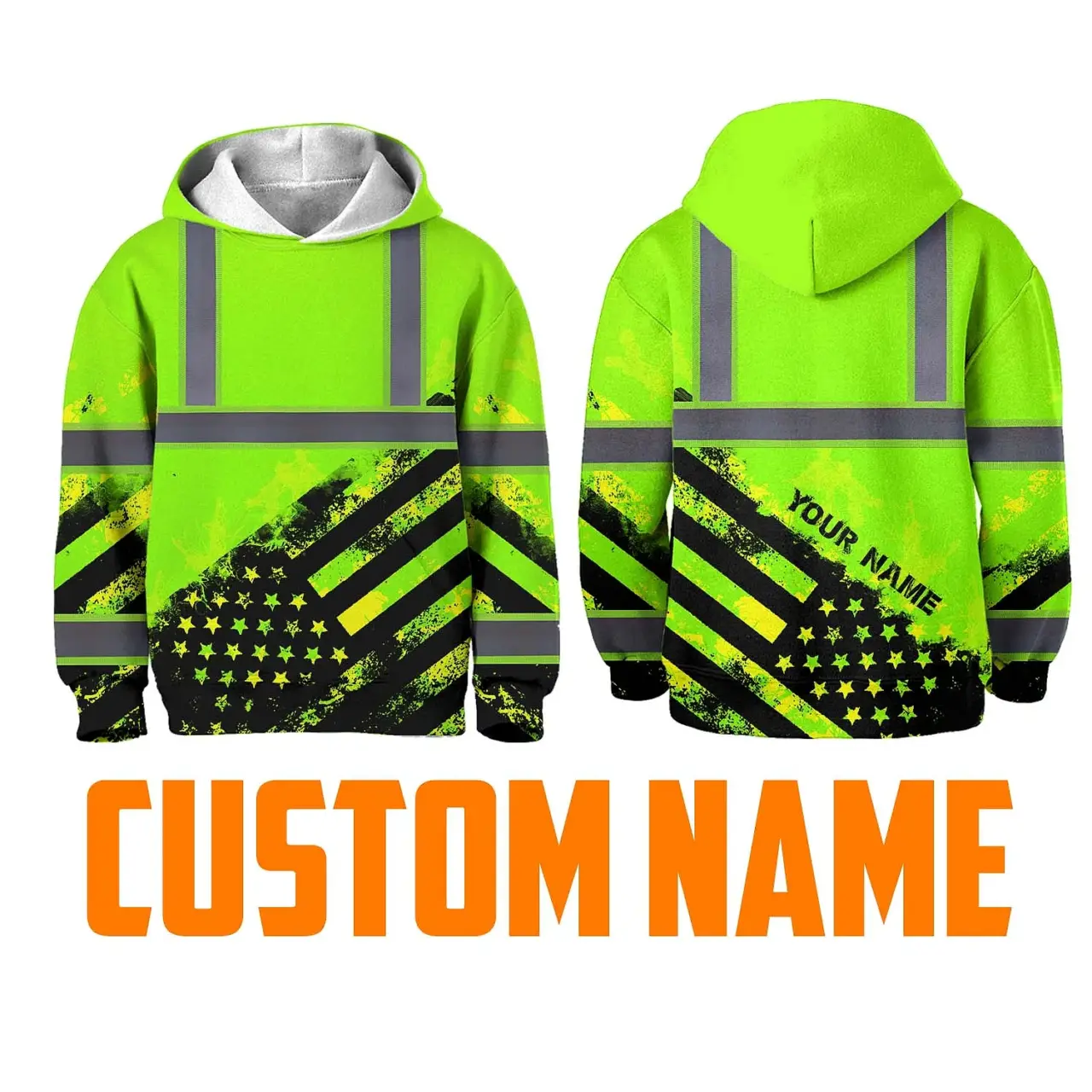 Hi Vis Hoodie Reflective Tapes Green US Flag Custom Name For Kids