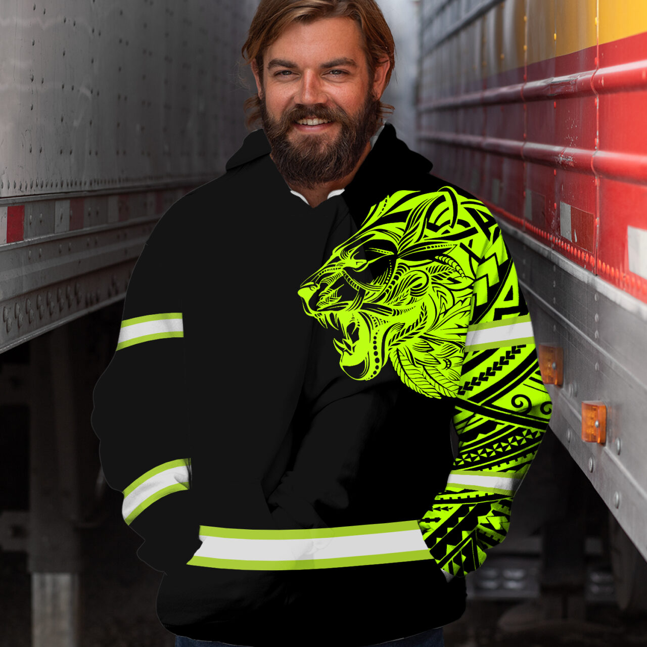 Hi Vis Hoodie Reflective Tapes Lion Hawaiian Polynesian Tribal Custom Name Safety Workwear For Workers, Runners, Cyclists Description