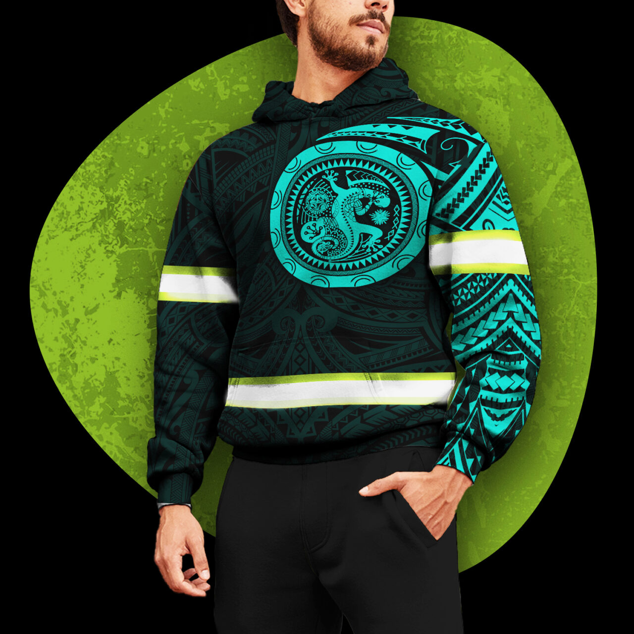 Hi Vis Hoodie Reflective Tapes Mint Gecko Hawaiian Polynesian Tribal Custom Name Safety Workwear For Workers, Runners, Cyclists
