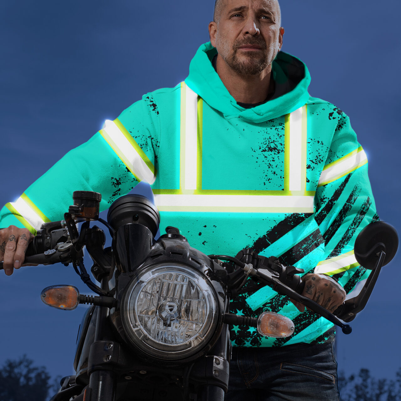 - The Hi Vis Hoodie Reflective Tape in a mint neon USA flag design not only offers a stylish and patriotic option, but also includes reflective tape for added visibility.