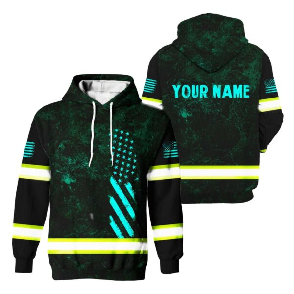 Hi Vis Hoodie Reflective Tapes Mint US Flag Custom Name Safety Workwear For Workers, Runners, Cyclists, Patriotic, Truckers