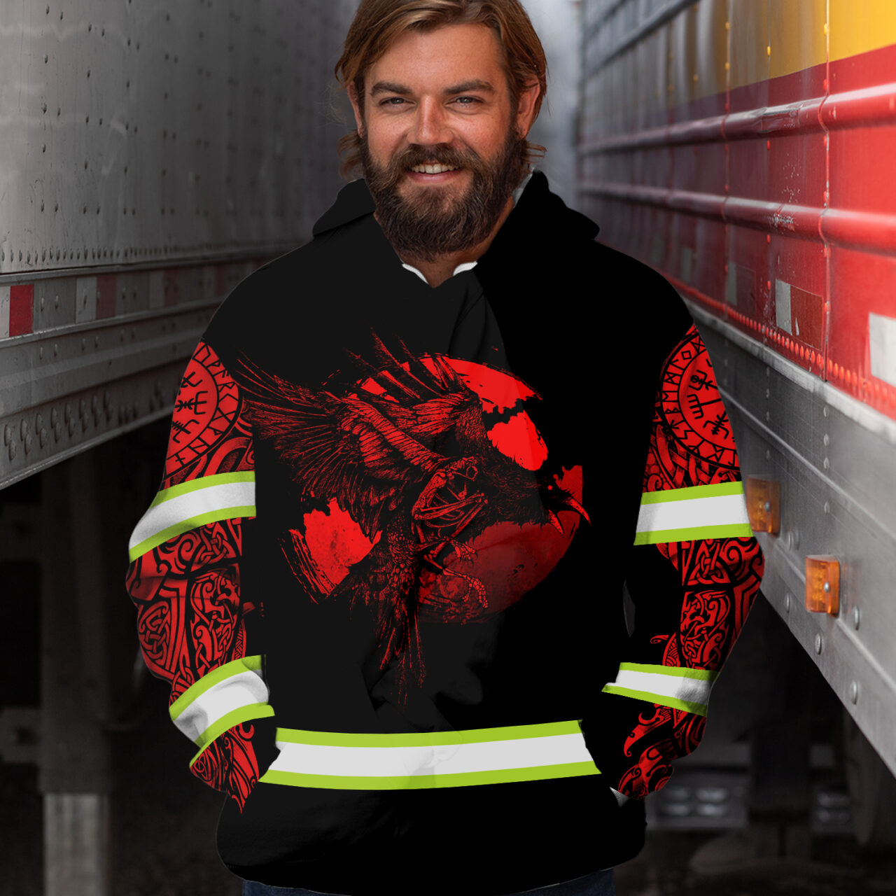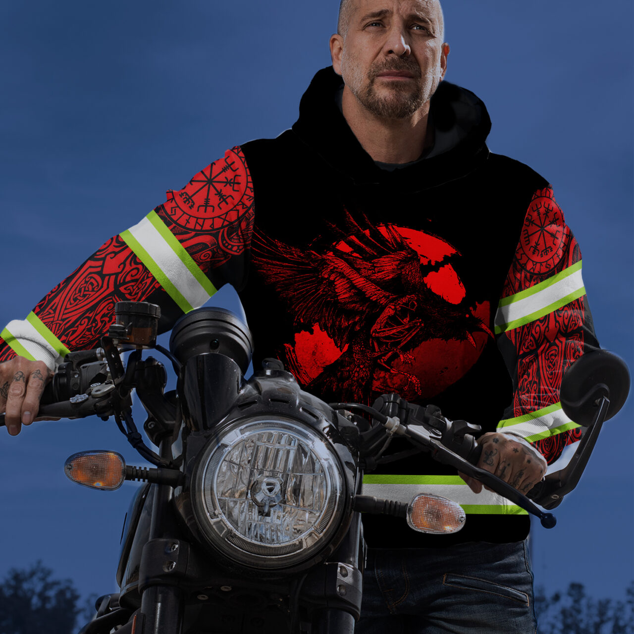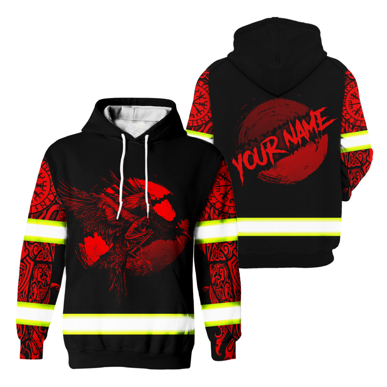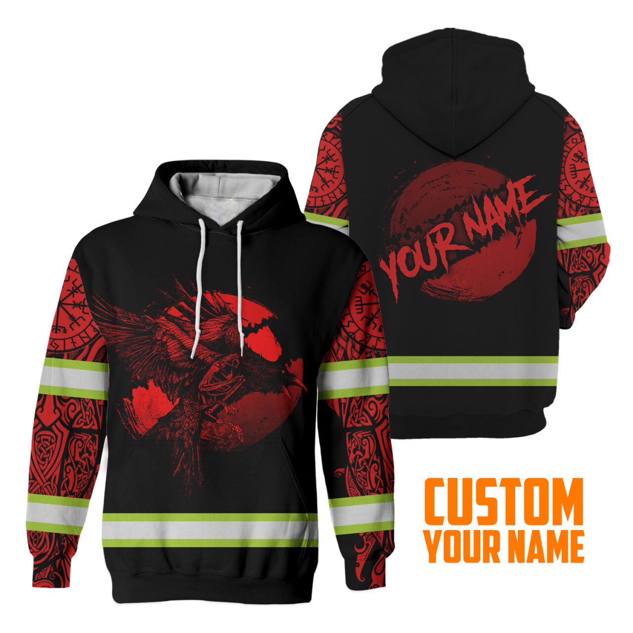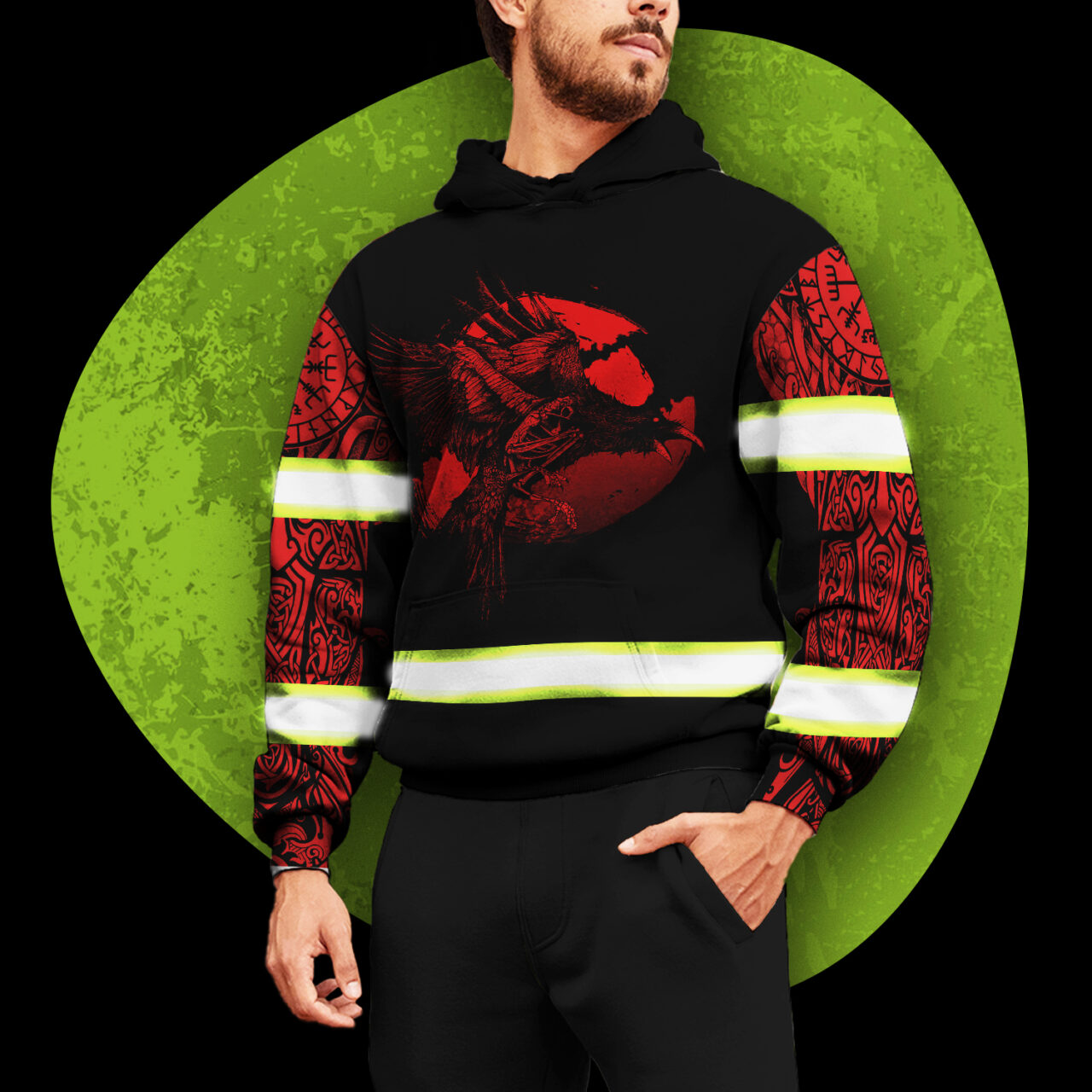 Hi Vis Hoodie Reflective Tapes Moon Raven Viking Symbol Tattoo Custom Name Safety Workwear For Workers, Runners, Cyclists