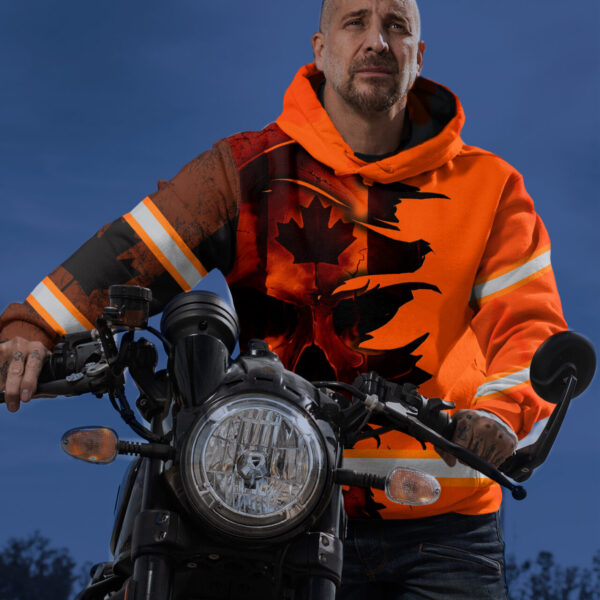 Be the first to review “Hi Vis Hoodie Reflective Tapes Orange Neon Skull Canada Flag Scratch Custom Name Safety Workwear For Workers, Runners, Cyclists, Patriotic”
